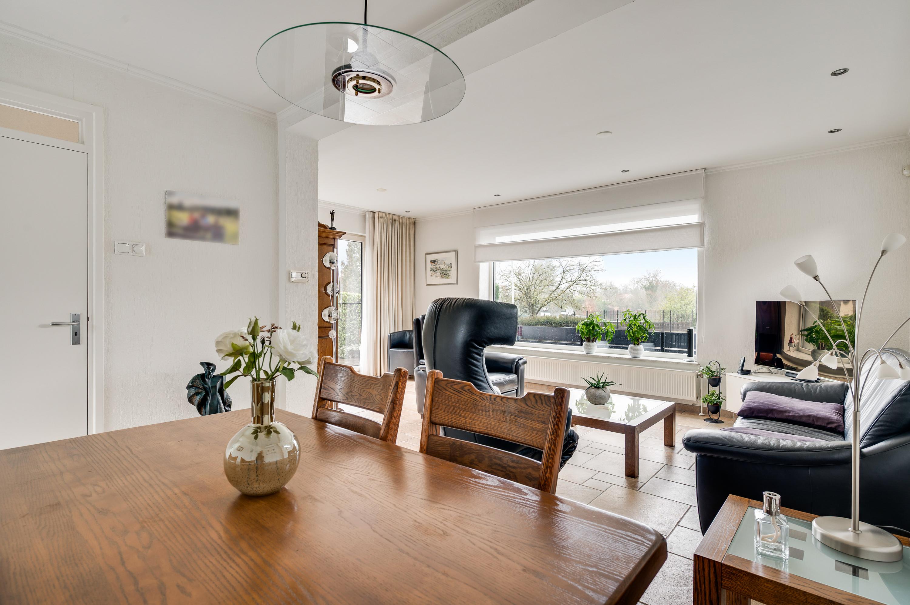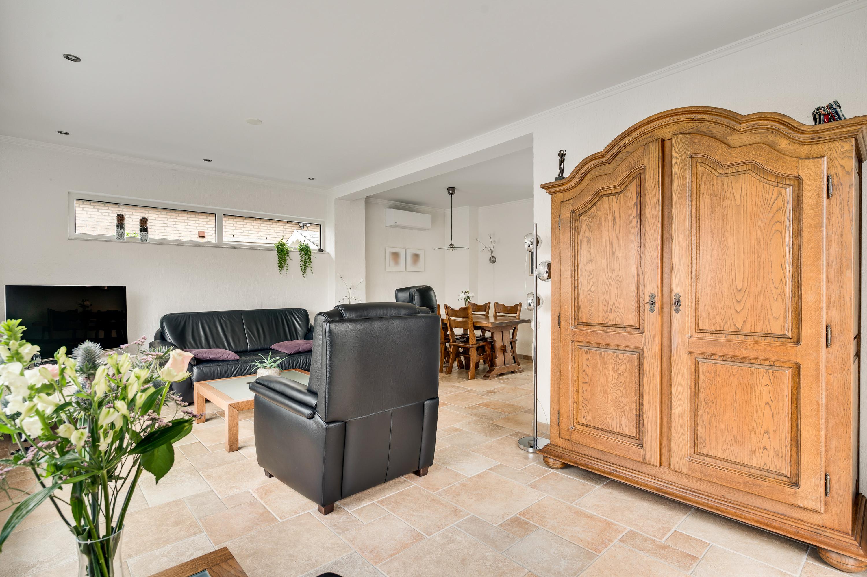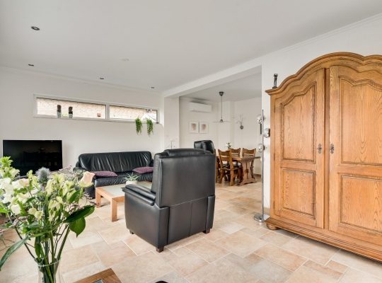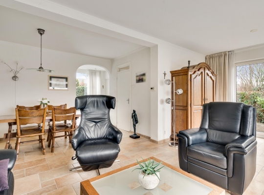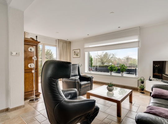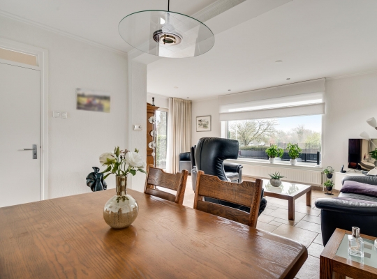 De L-vormige woonkamer heeft, net als de garage in het souterrain, een oppervlakte van circa 30 m2. Het zitgedeelte is aan de voorzijde, met lichtinval vanaf drie kanten, en bij het eetgedeelte hangt een airco-unit (koelen en verwarmen). Openslaande deuren geven toegang tot een terras op het westen en aan de voorzijde geniet u, dankzij de verhoogde ligging, van een mooi uitzicht.