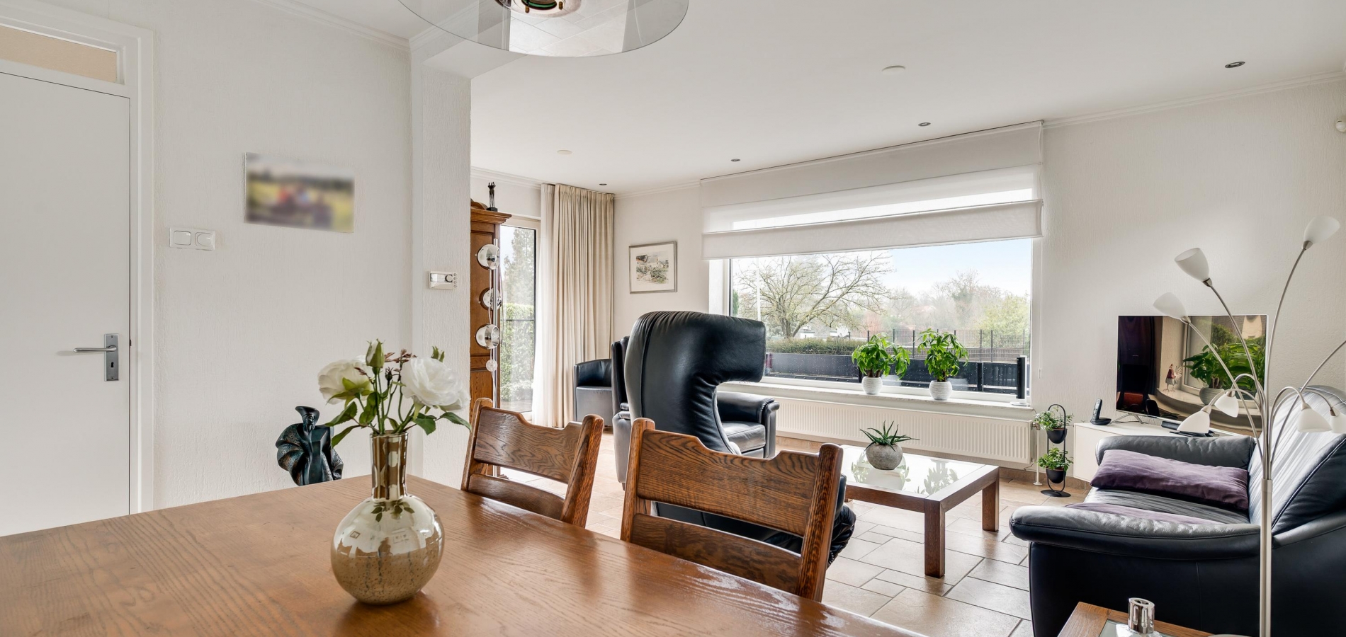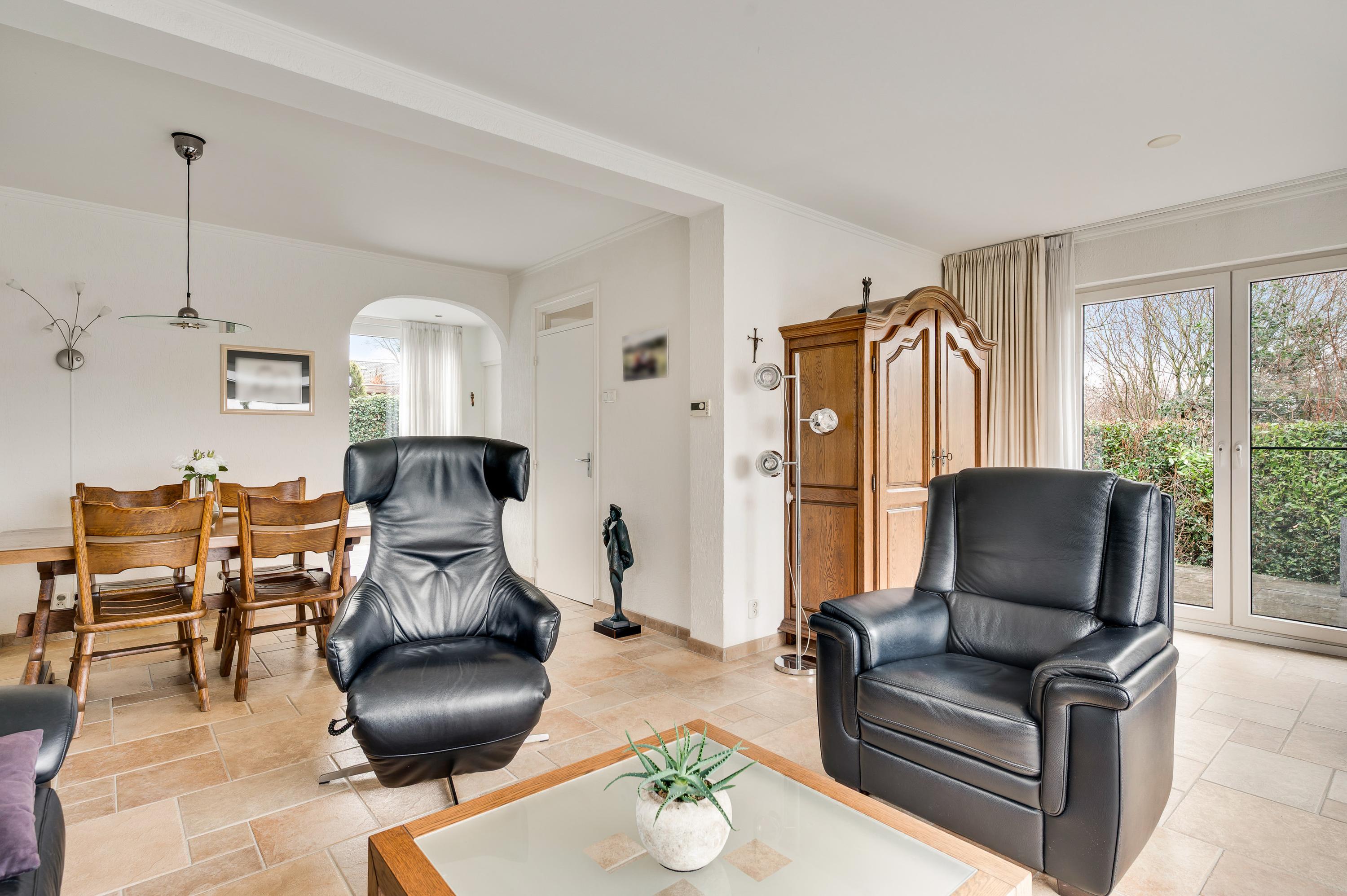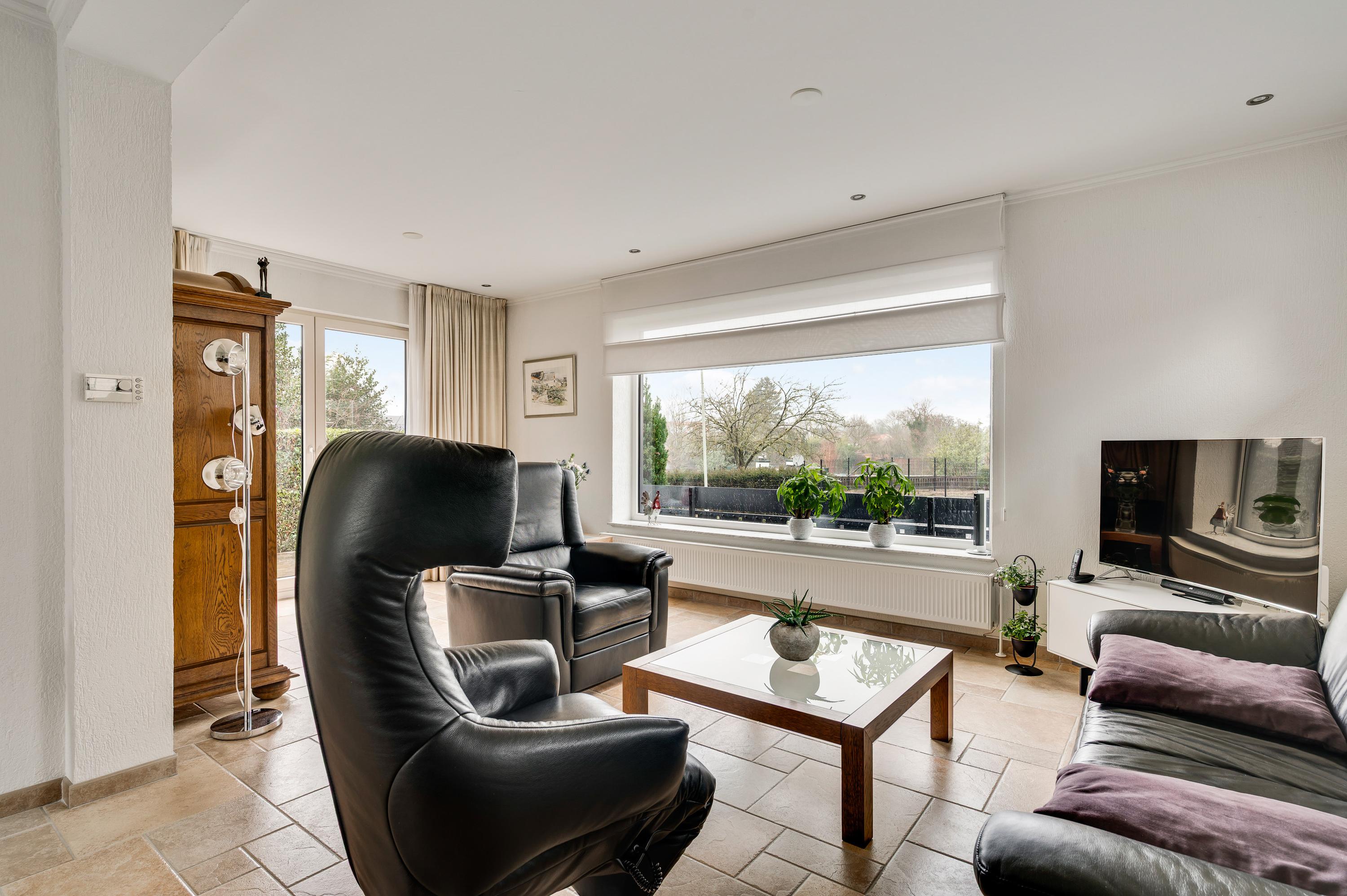 De L-vormige woonkamer heeft, net als de garage in het souterrain, een oppervlakte van circa 30 m2. Het zitgedeelte is aan de voorzijde, met lichtinval vanaf drie kanten, en bij het eetgedeelte hangt een airco-unit (koelen en verwarmen). Openslaande deuren geven toegang tot een terras op het westen en aan de voorzijde geniet u, dankzij de verhoogde ligging, van een mooi uitzicht.