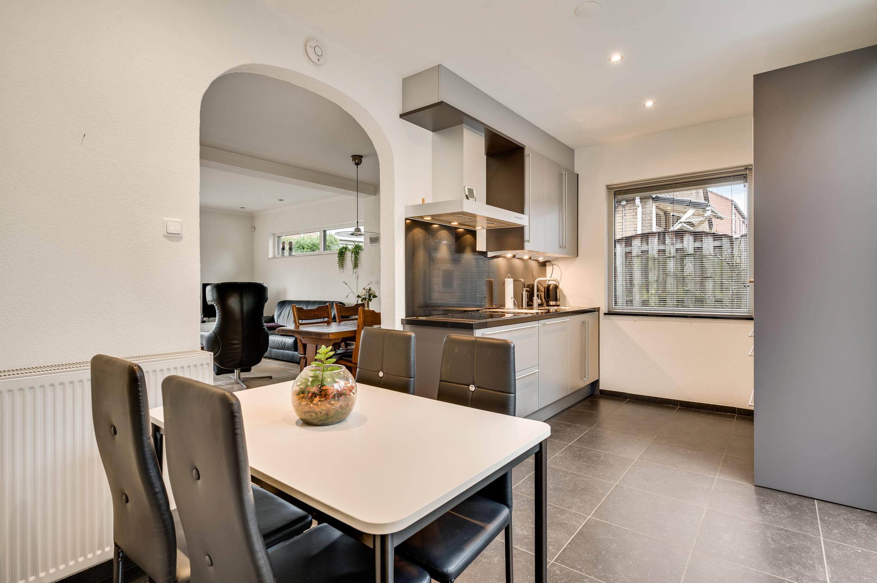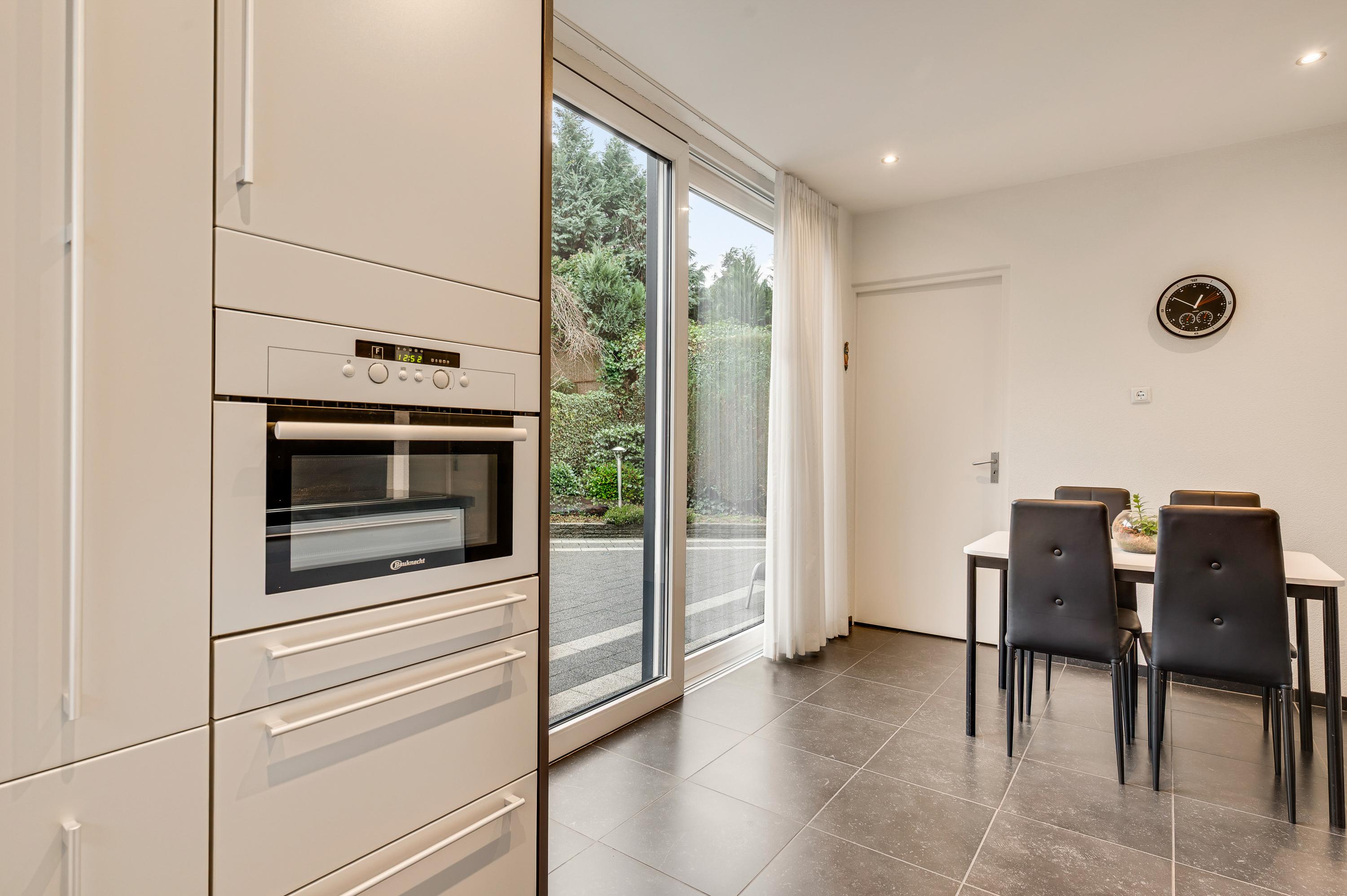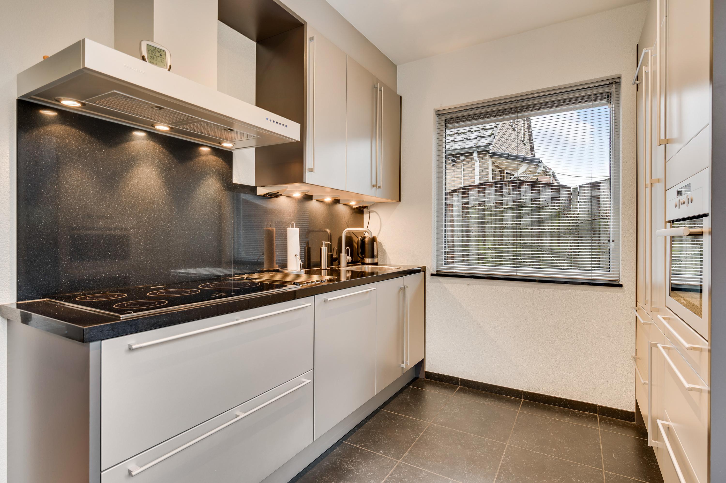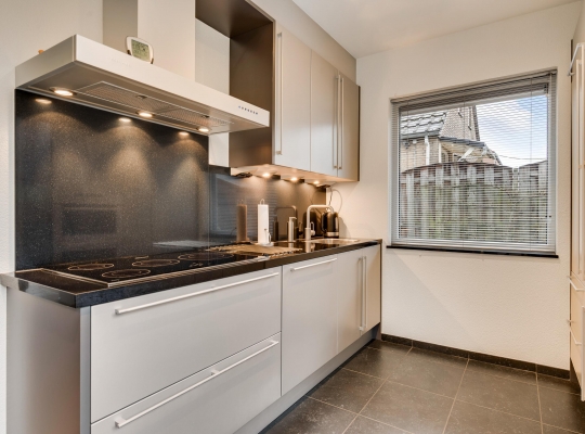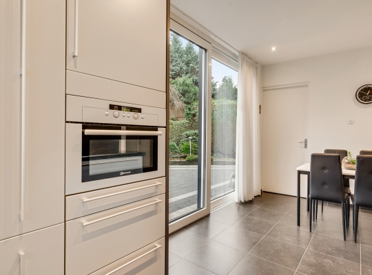 De keuken (circa 4,64 x 2,48) bevindt zich aan de achterzijde, met een schuifpui naar de tuin met terras op het zuiden. Er is genoeg plek voor een ontbijttafel en de keukenopstelling, uitgevoerd in grijs, heeft een ingebouwde inductie kookplaat (grootte 77 cm X 55 cm)., afzuigkap, combi-oven, vaatwasser en koelkast. Naast de keuken is de verwarmde bijkeuken waar een vriezer, de wasmachine en droger kunnen staan.