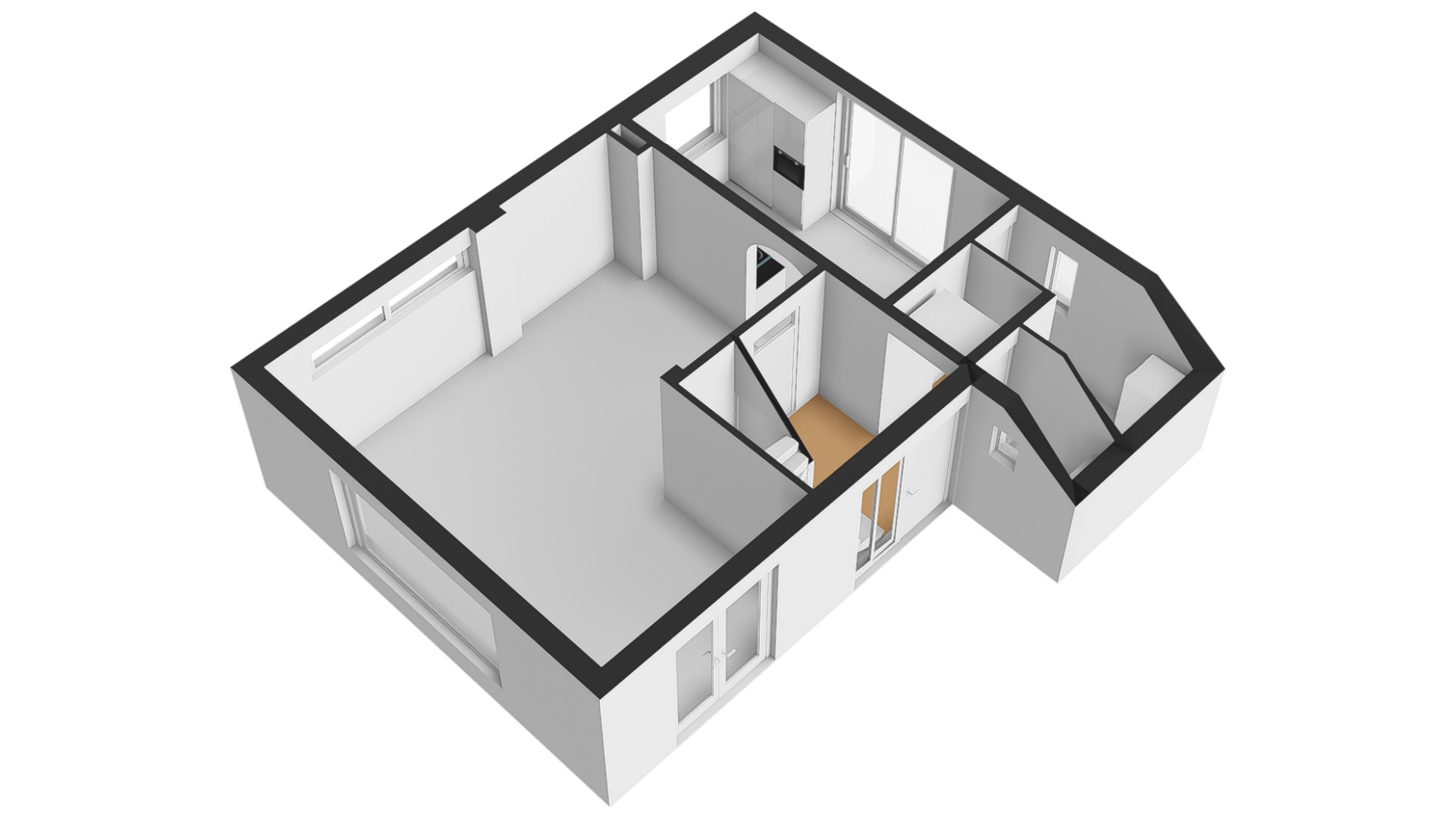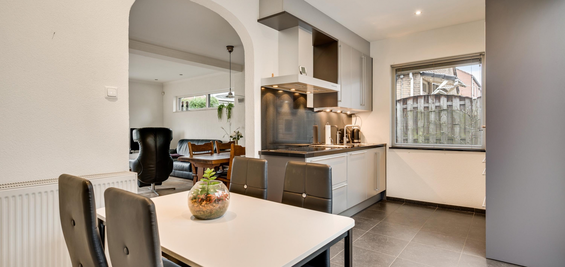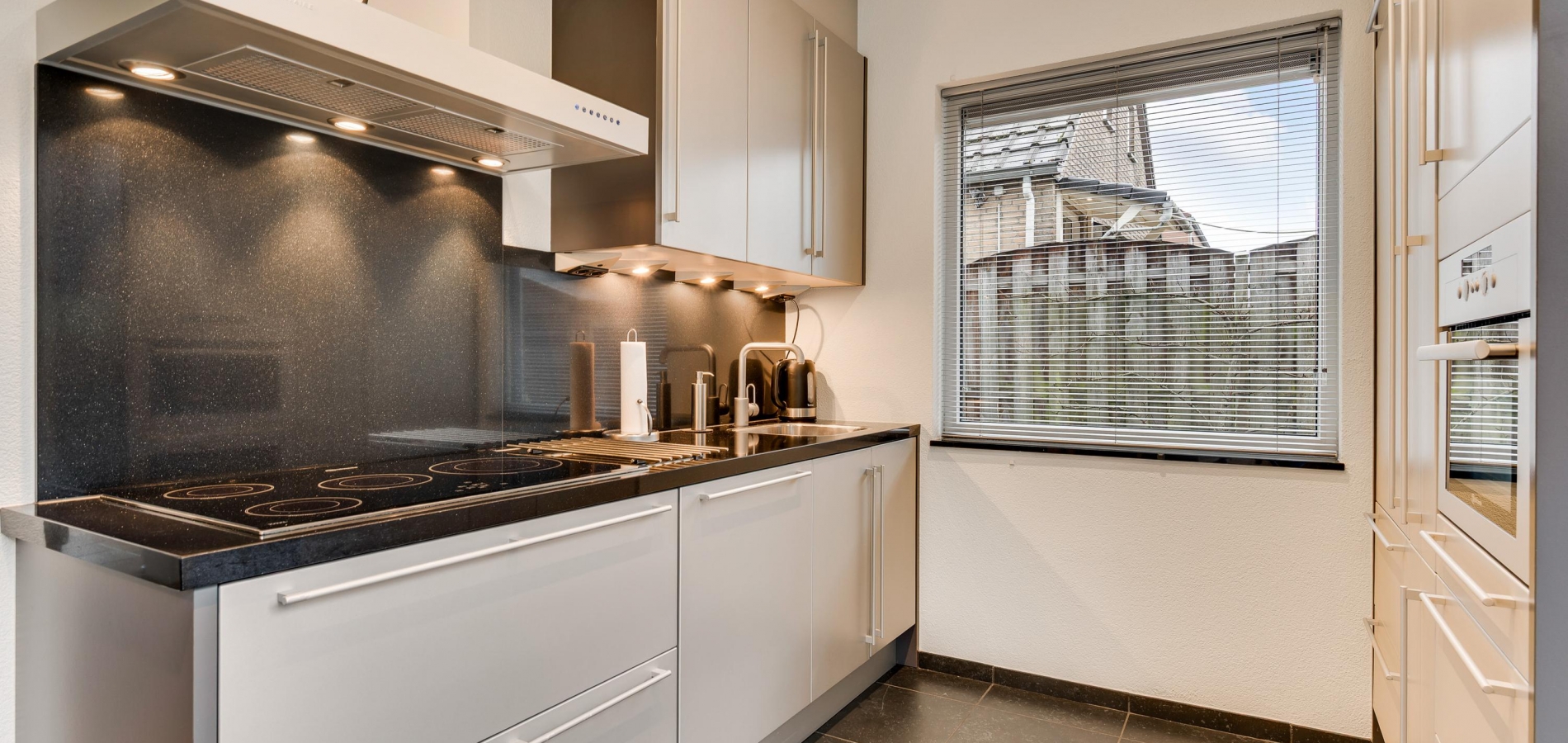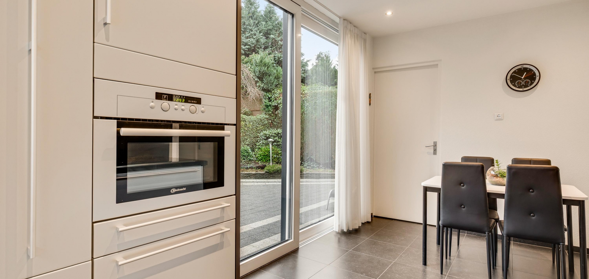De keuken (circa 4,64 x 2,48) bevindt zich aan de achterzijde, met een schuifpui naar de tuin met terras op het zuiden. Er is genoeg plek voor een ontbijttafel en de keukenopstelling, uitgevoerd in grijs, heeft een ingebouwde inductie kookplaat (grootte 77 cm X 55 cm)., afzuigkap, combi-oven, vaatwasser en koelkast. Naast de keuken is de verwarmde bijkeuken waar een vriezer, de wasmachine en droger kunnen staan.