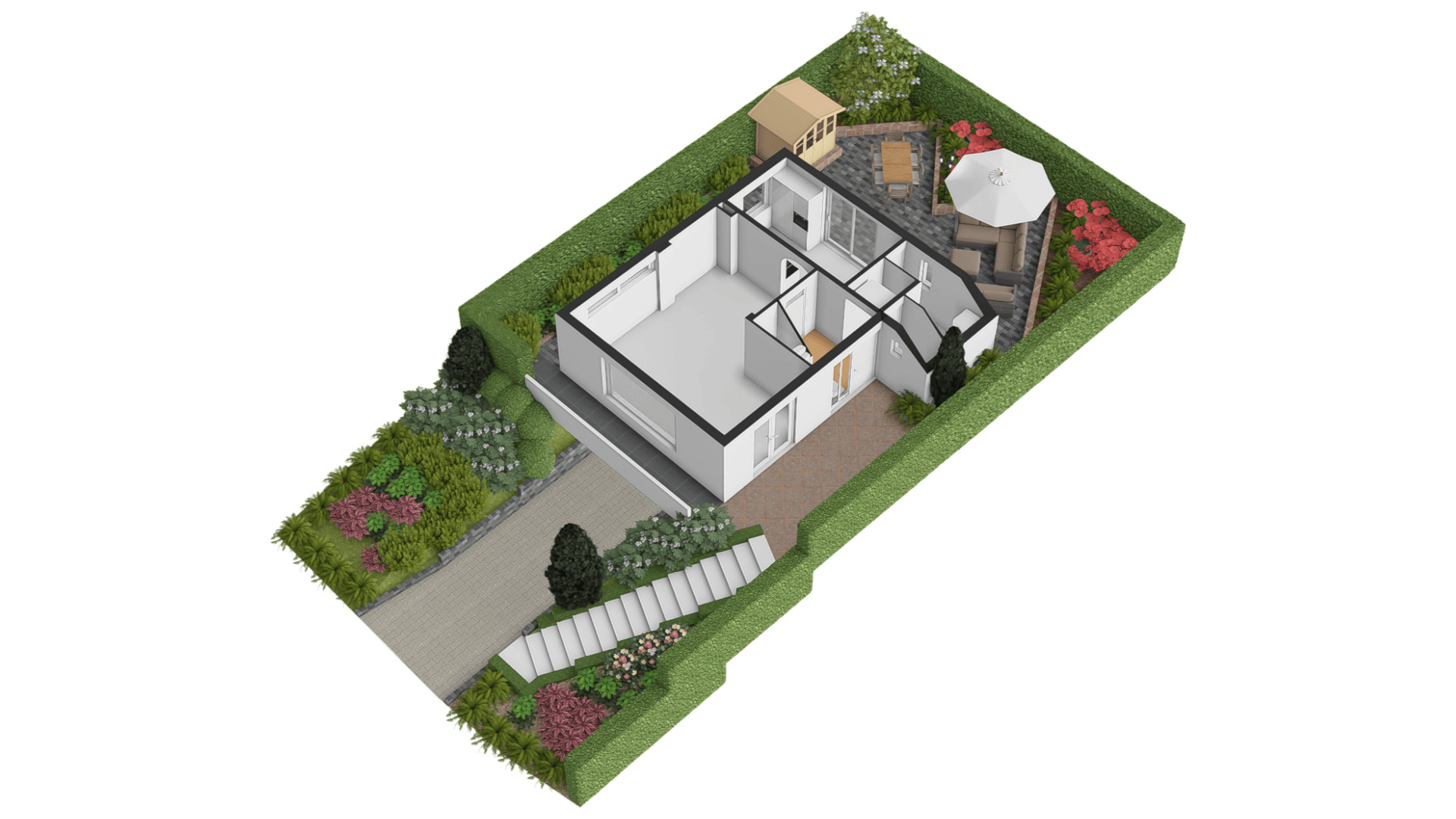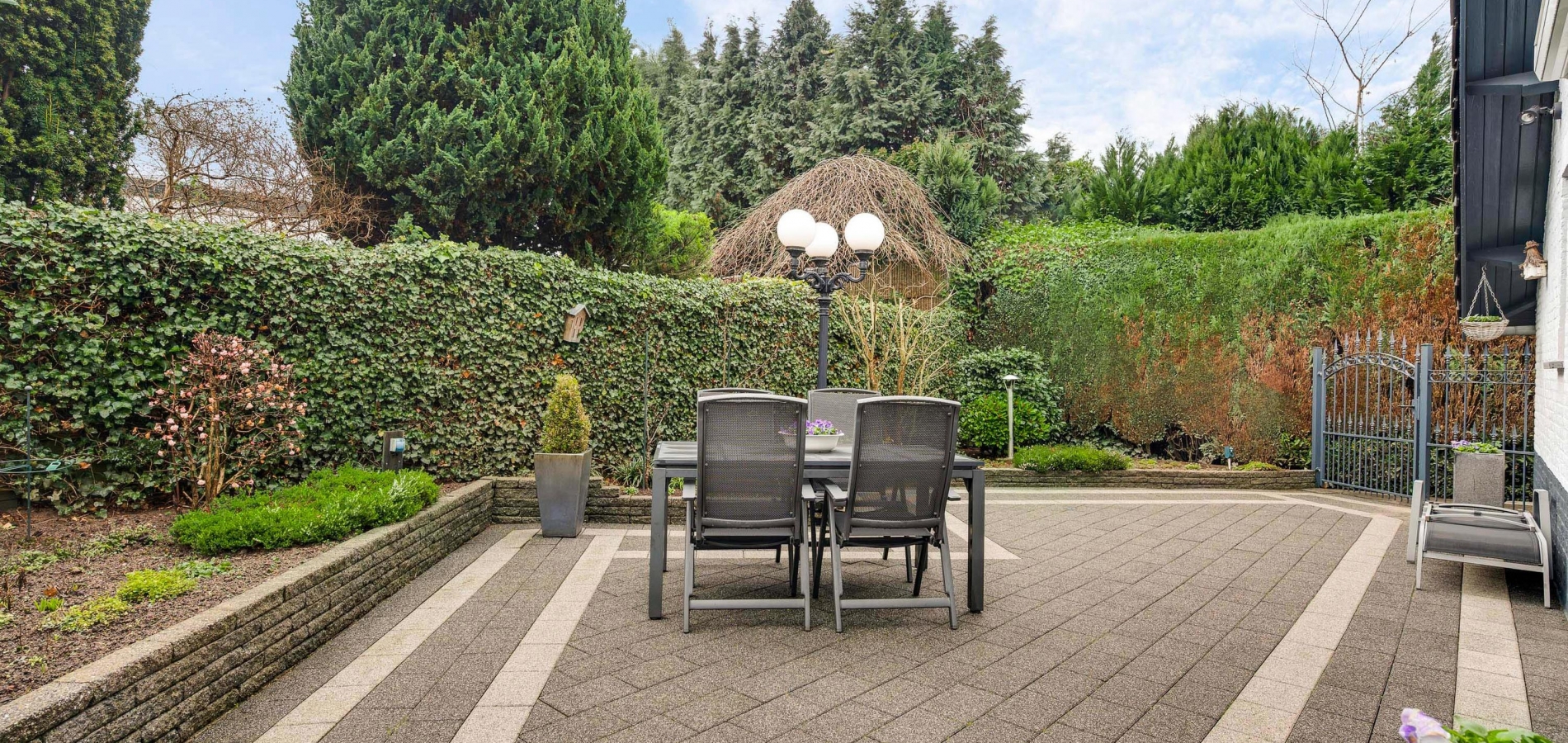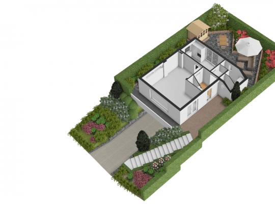 Rondom gesitueerde tuin met meerdere terrassen en gevarieerde beplanting