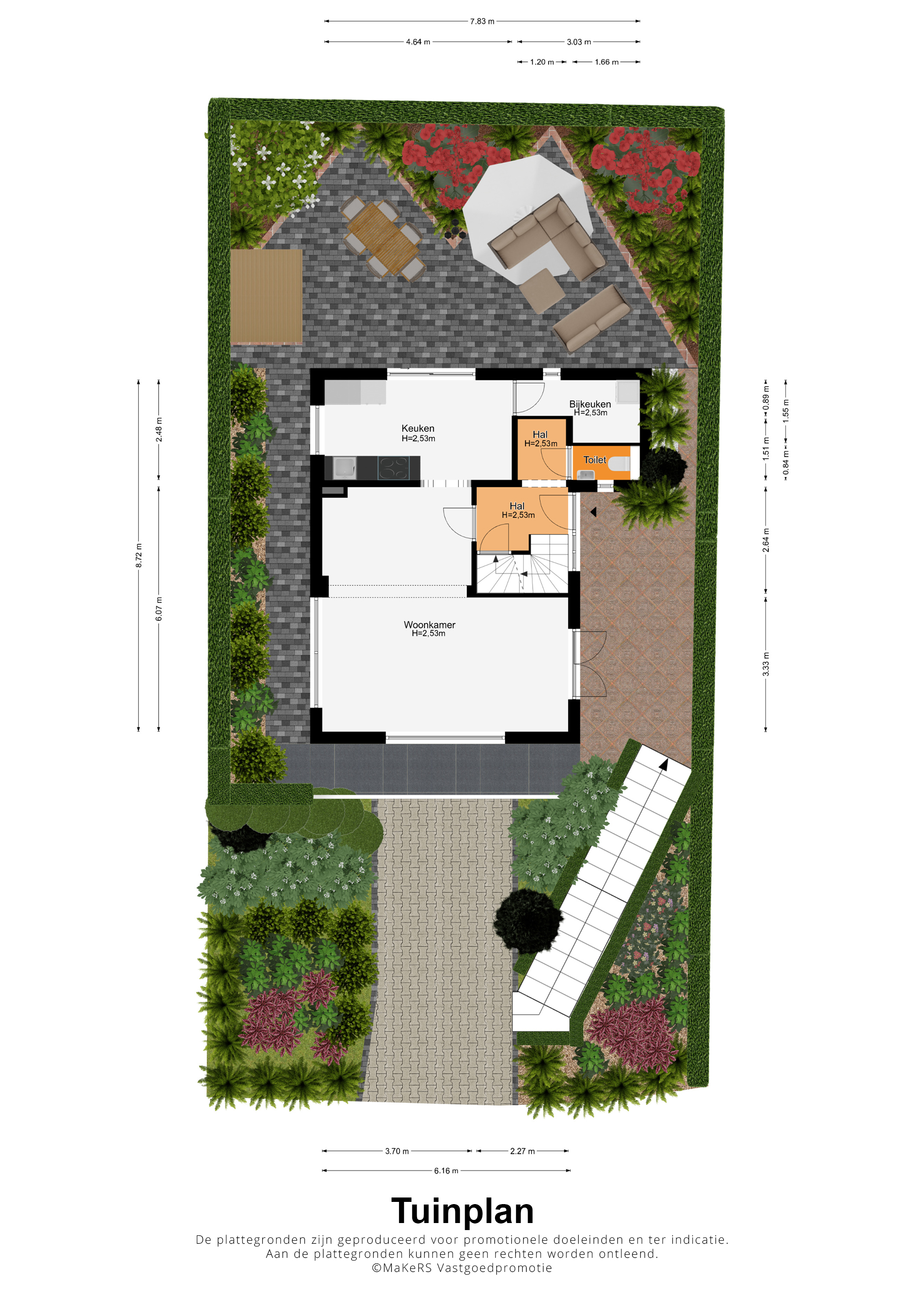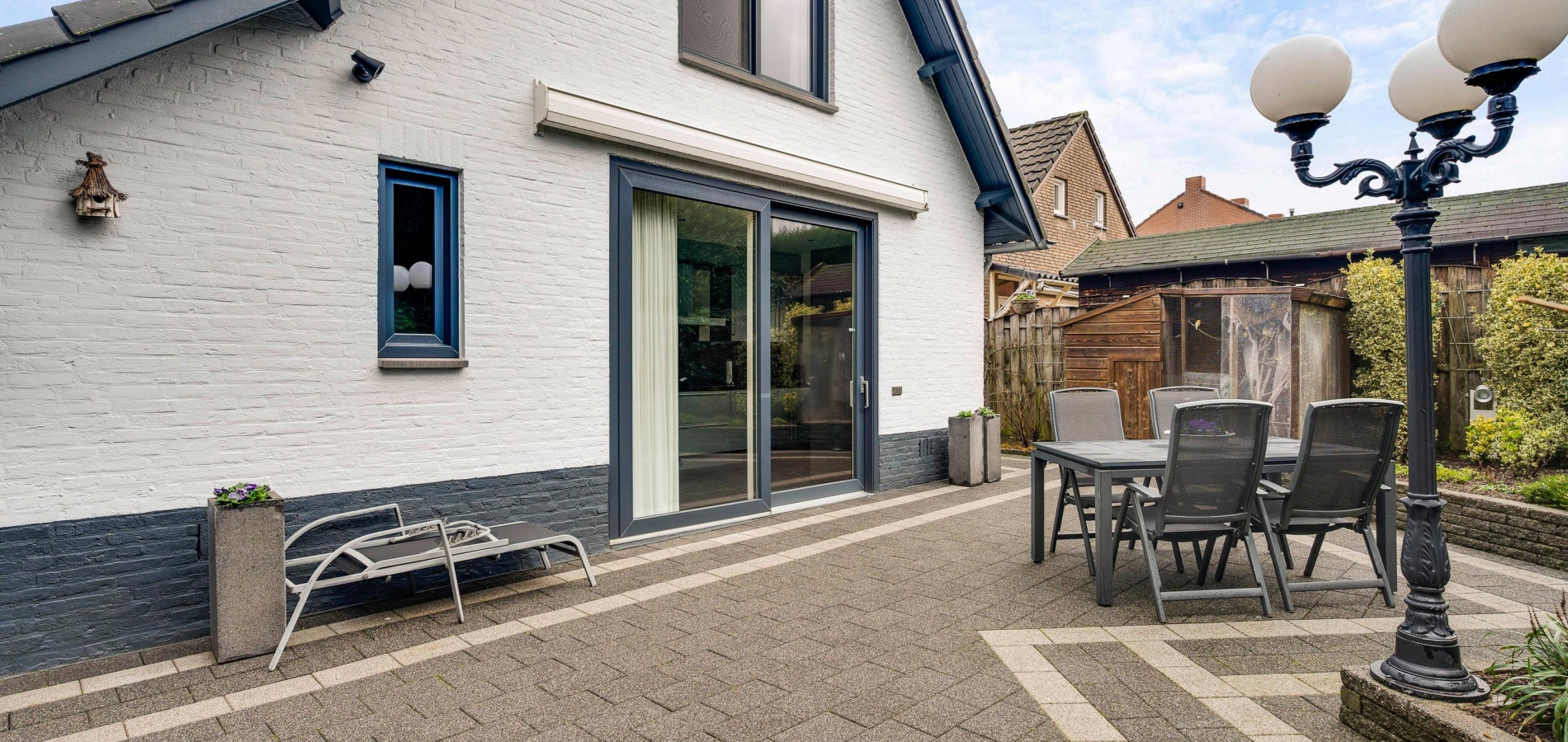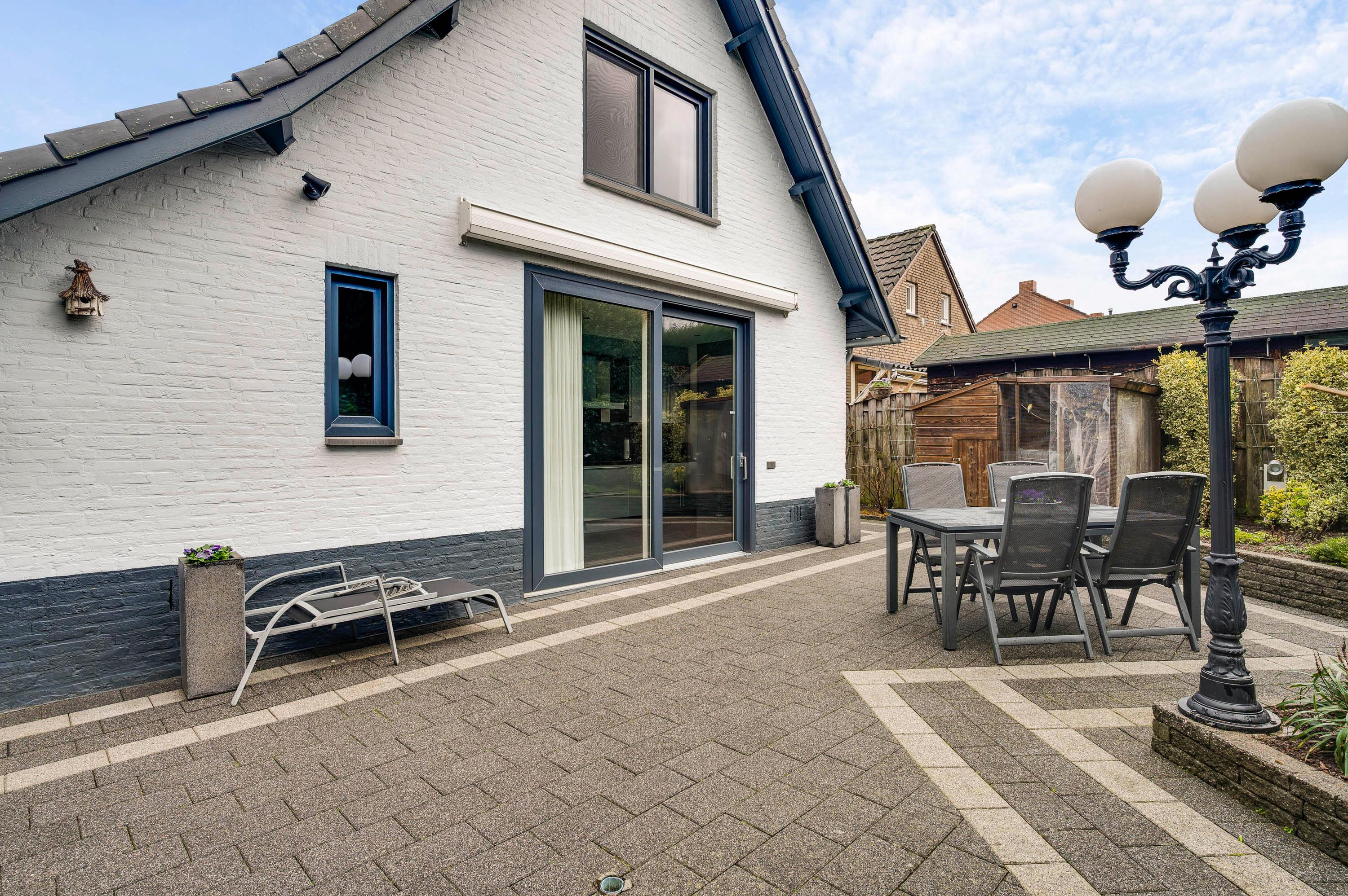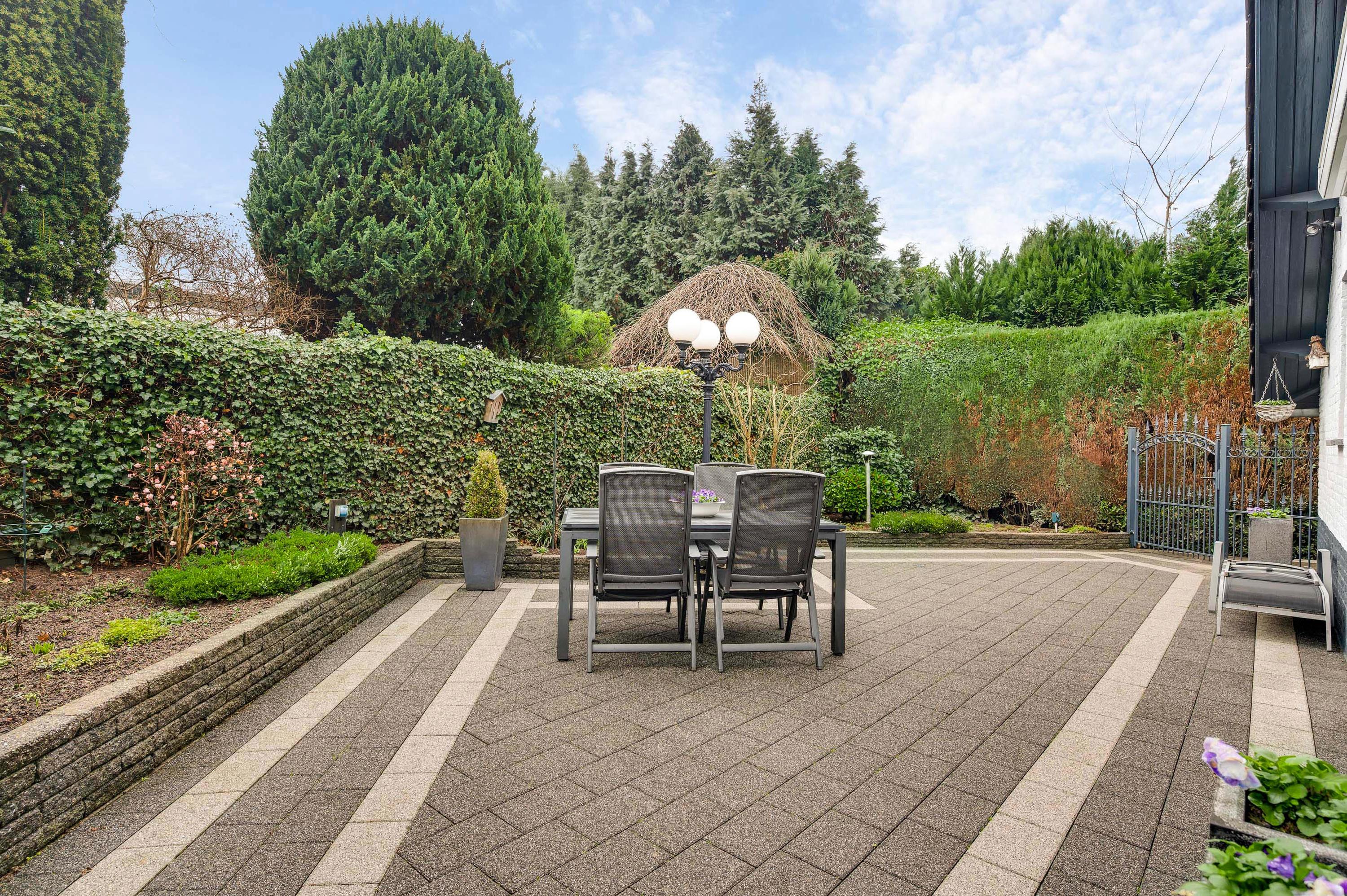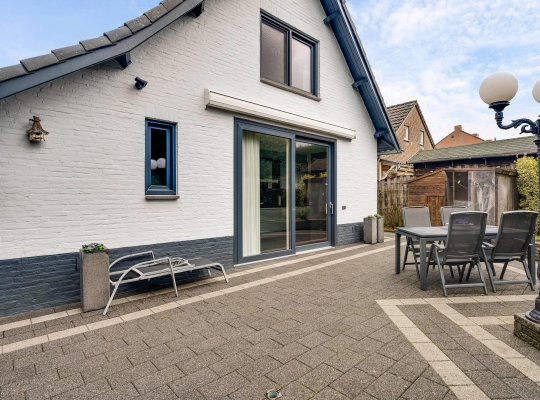 Met een terras op het westen en een terras op het zuiden is er gedurende de hele dag een plek in de zon te vinden. Ook aan de voorzijde is de mogelijkheid om buiten te zitten, in het geval dat een plekje in de schaduw gewenst is. Verder ziet u groenblijvende hagen en een grote variatie aan beplanting in een fraai kleurenpalet. Op de oprit is parkeergelegenheid voor twee auto’s.