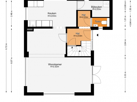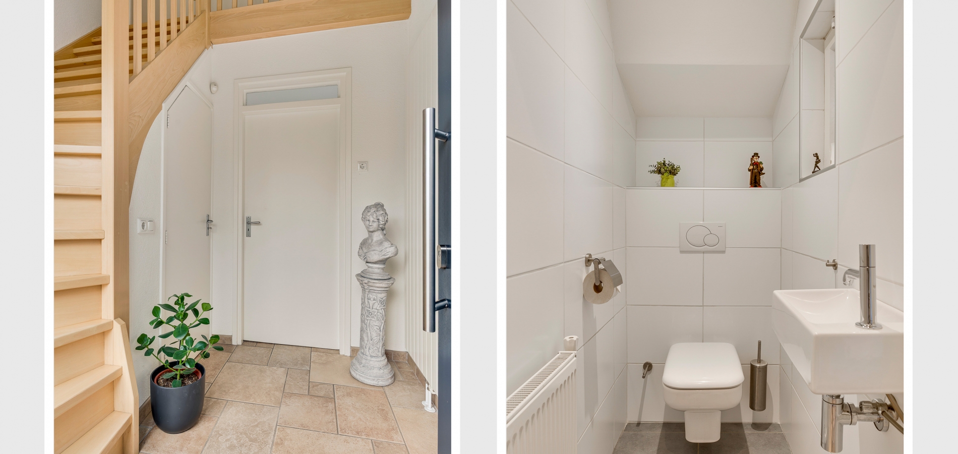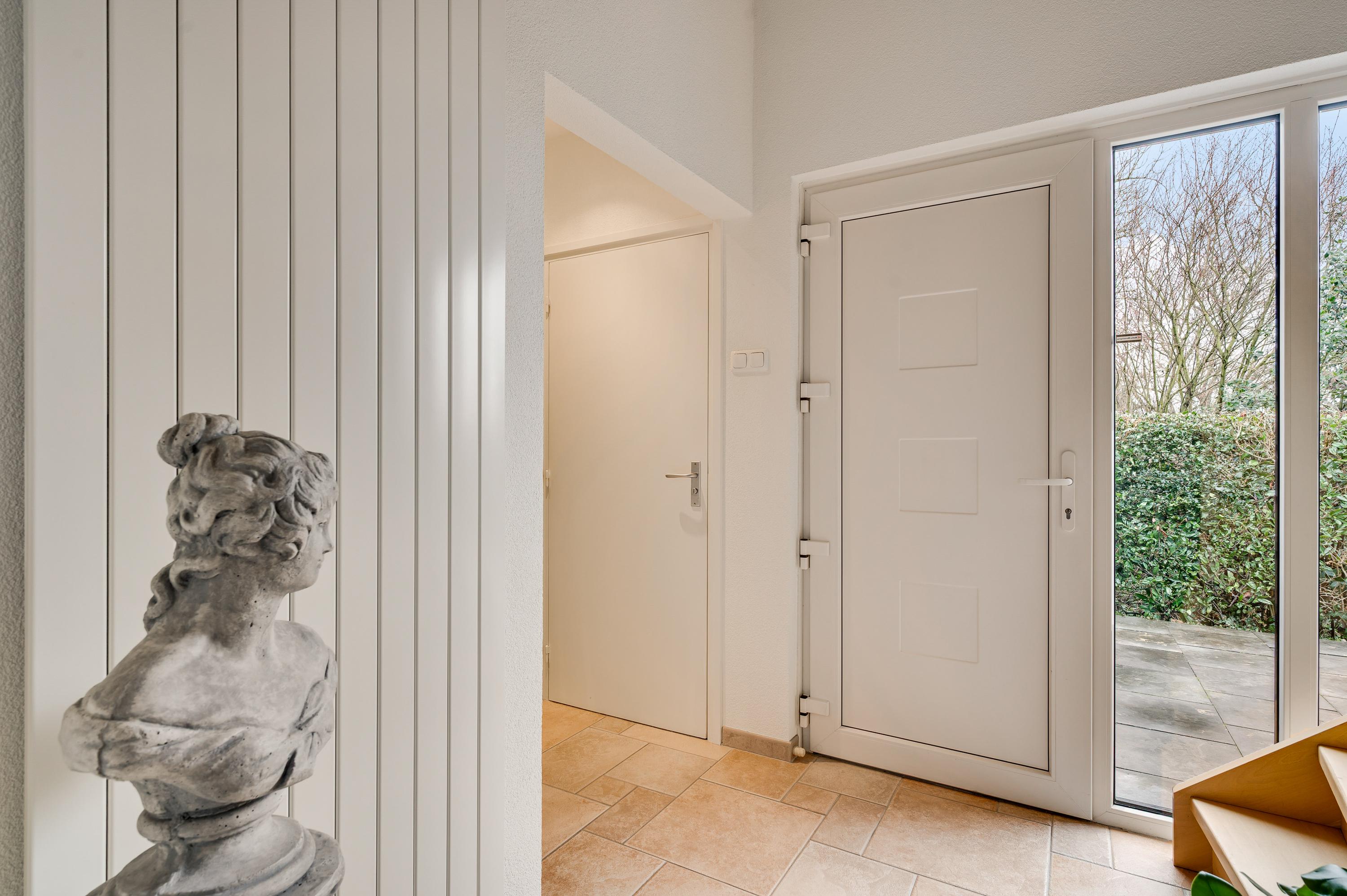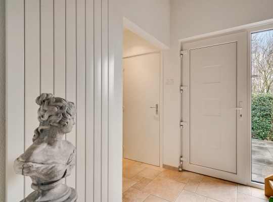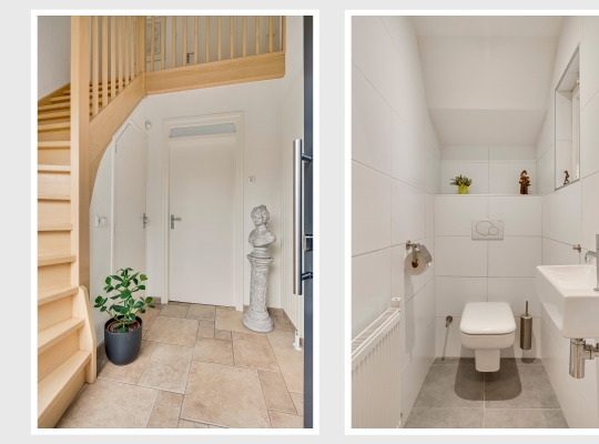 Vanaf de oprit leidt een buitentrap naar de entree, aan de rechterzijde van de woning. De hal (circa 2,64 x 2,27) met vide heeft, net als de rest van het huis, veel sfeer. Aan de linkerzijde zijn de trappen naar de eerste verdieping en het souterrain. Vlak naast de garderobe is de toiletruimte, met een wandcloset en een fonteintje.