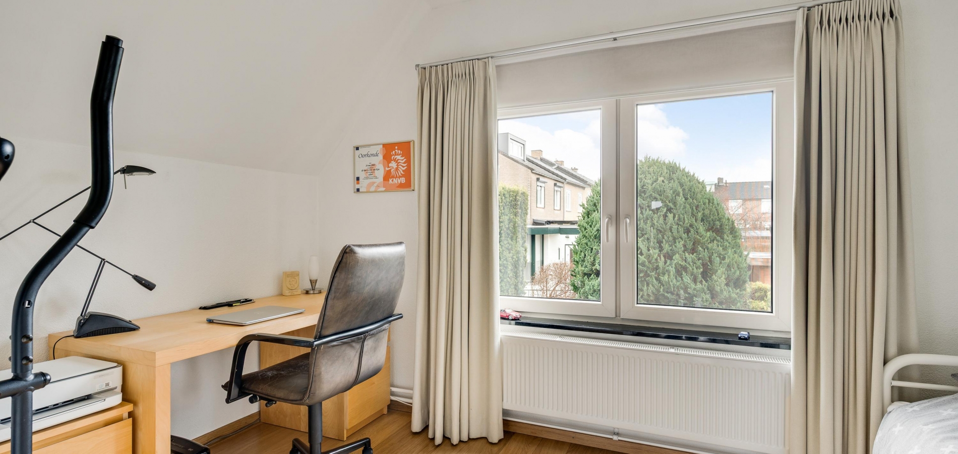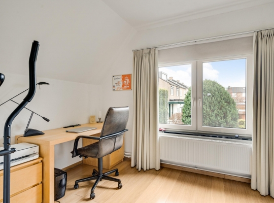 Volg de mooie trap naar de overloop, die dankzij de vide heel ruimtelijk oogt. Vanaf hier heeft u onder andere toegang tot slaapkamer I (circa 3,94 x 3,31) met een vaste kastenwand. Aan de achterzijde is slaapkamer II (circa 3,94 x 2,56), ingericht als logeer- en werkkamer.