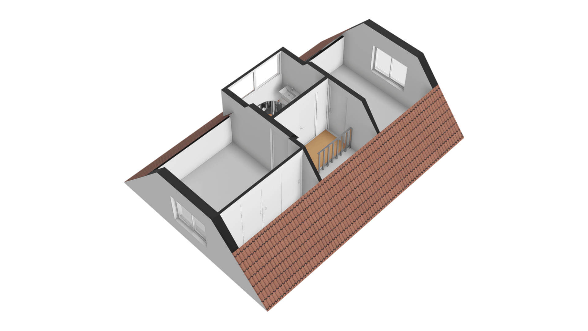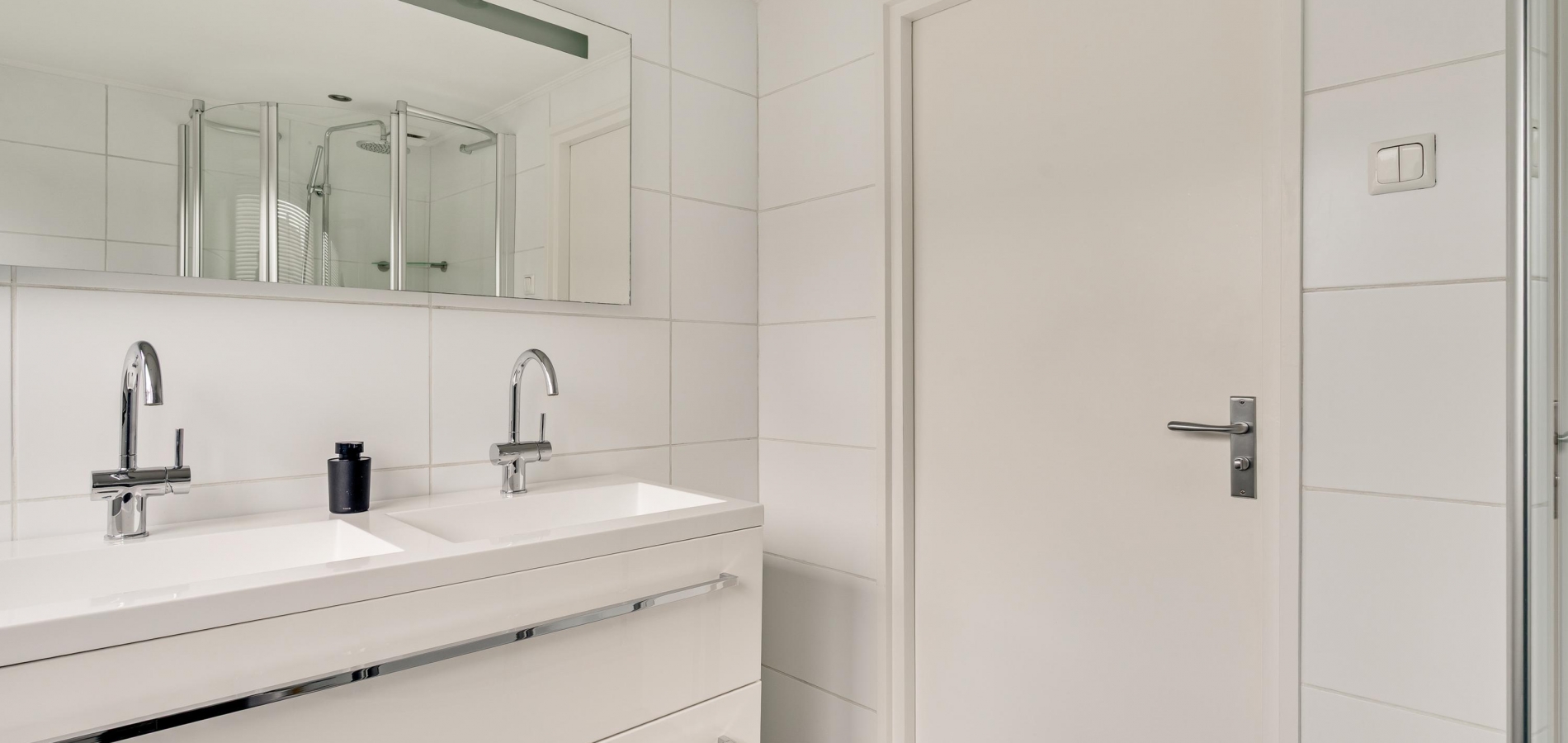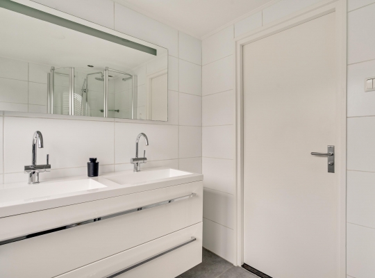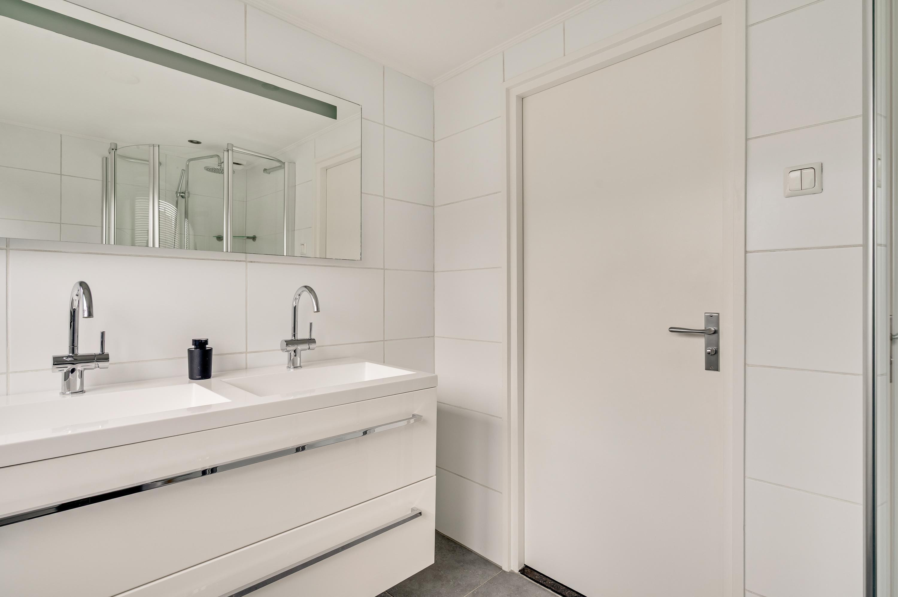 De badkamer (circa 2,42 x 1,99) met dakkapel biedt ruimte aan een kwartronde douche, een toilet en een dubbel wastafelmeubel. Mooi detail is het tegelwerk bij het toilet, goed passend bij de vloertegels en de grote, witte wandtegels.