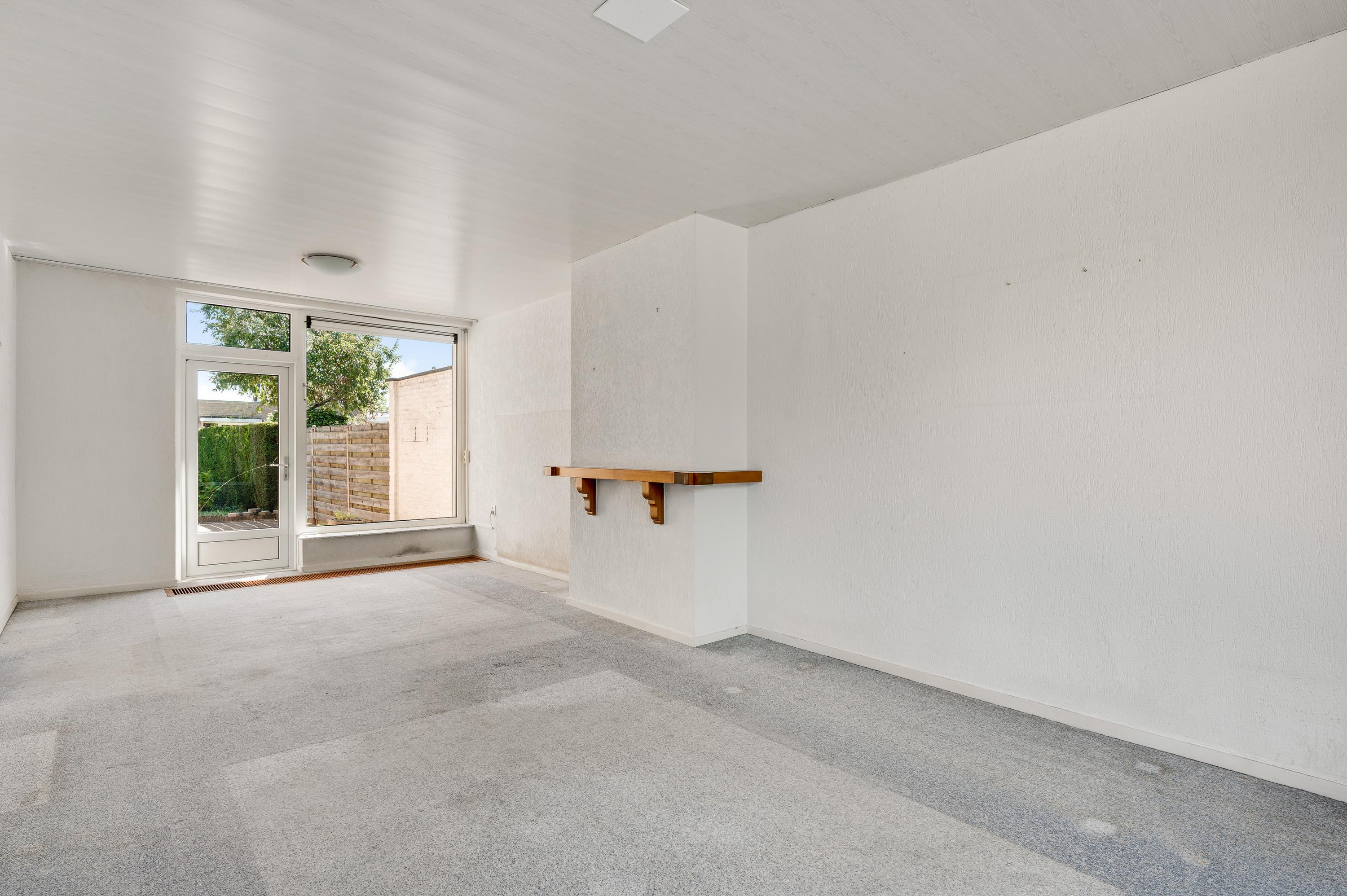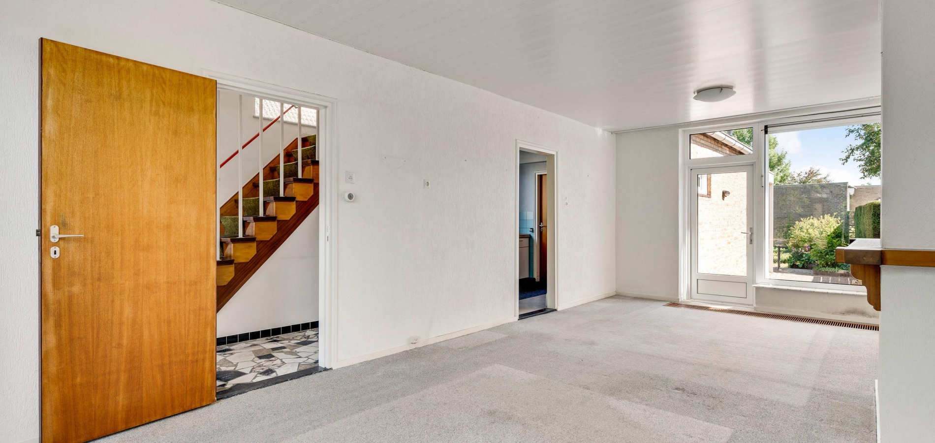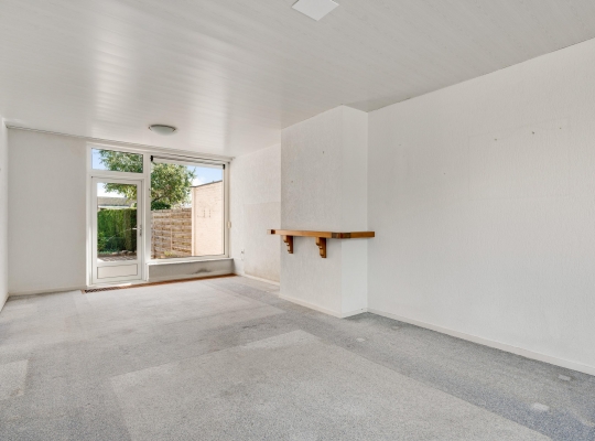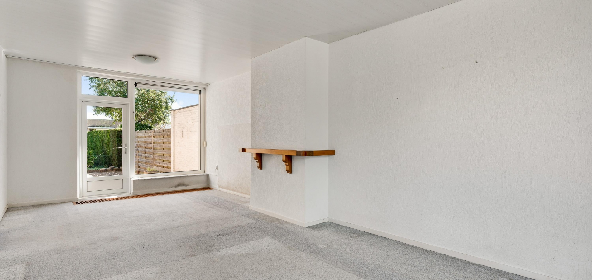 De woonkamer (circa 7,46 x 3,59) is een lichte leefruimte, met grote ramen aan de voor- en achterzijde. Aan de achterzijde is een deur naar de tuin, en aan de voorzijde kijkt u naar de rustige straat. In de naastgelegen keuken (circa 4,17/3,02 x 2,14) staat een eenvoudig keukenblok met een spoelbak en een afzuigkap.