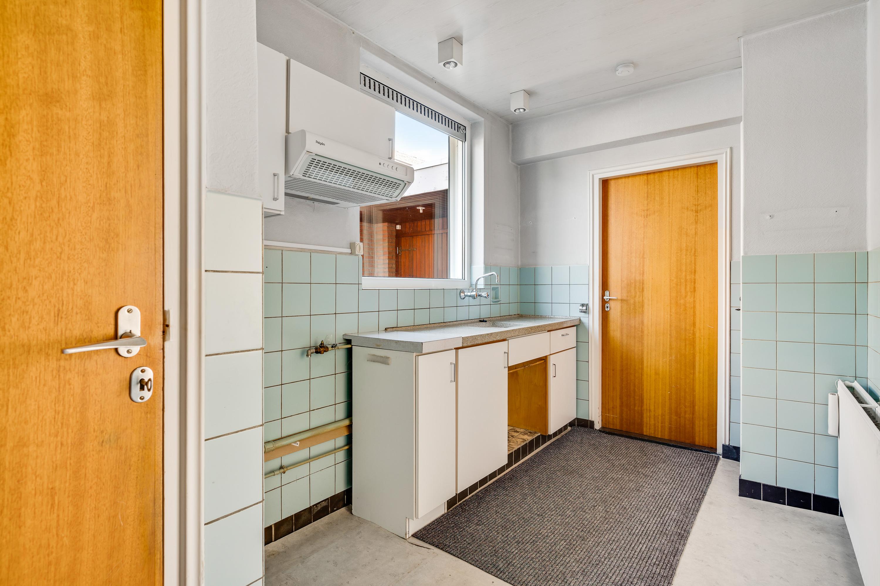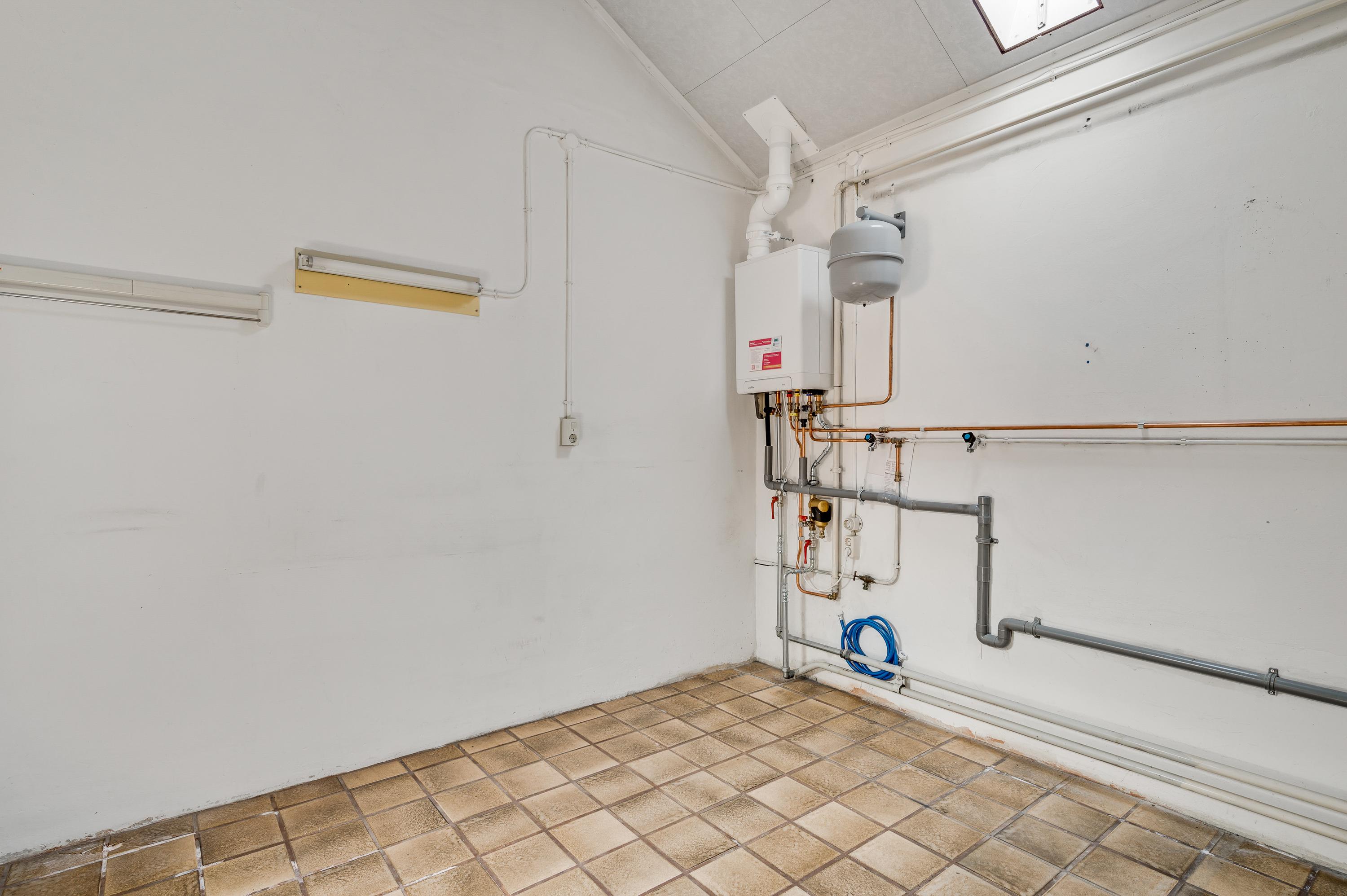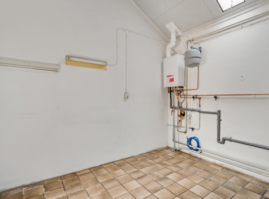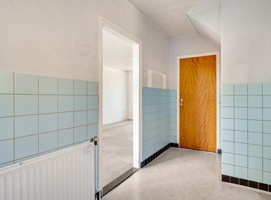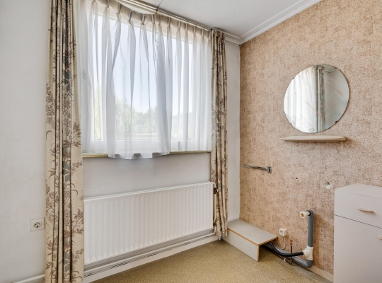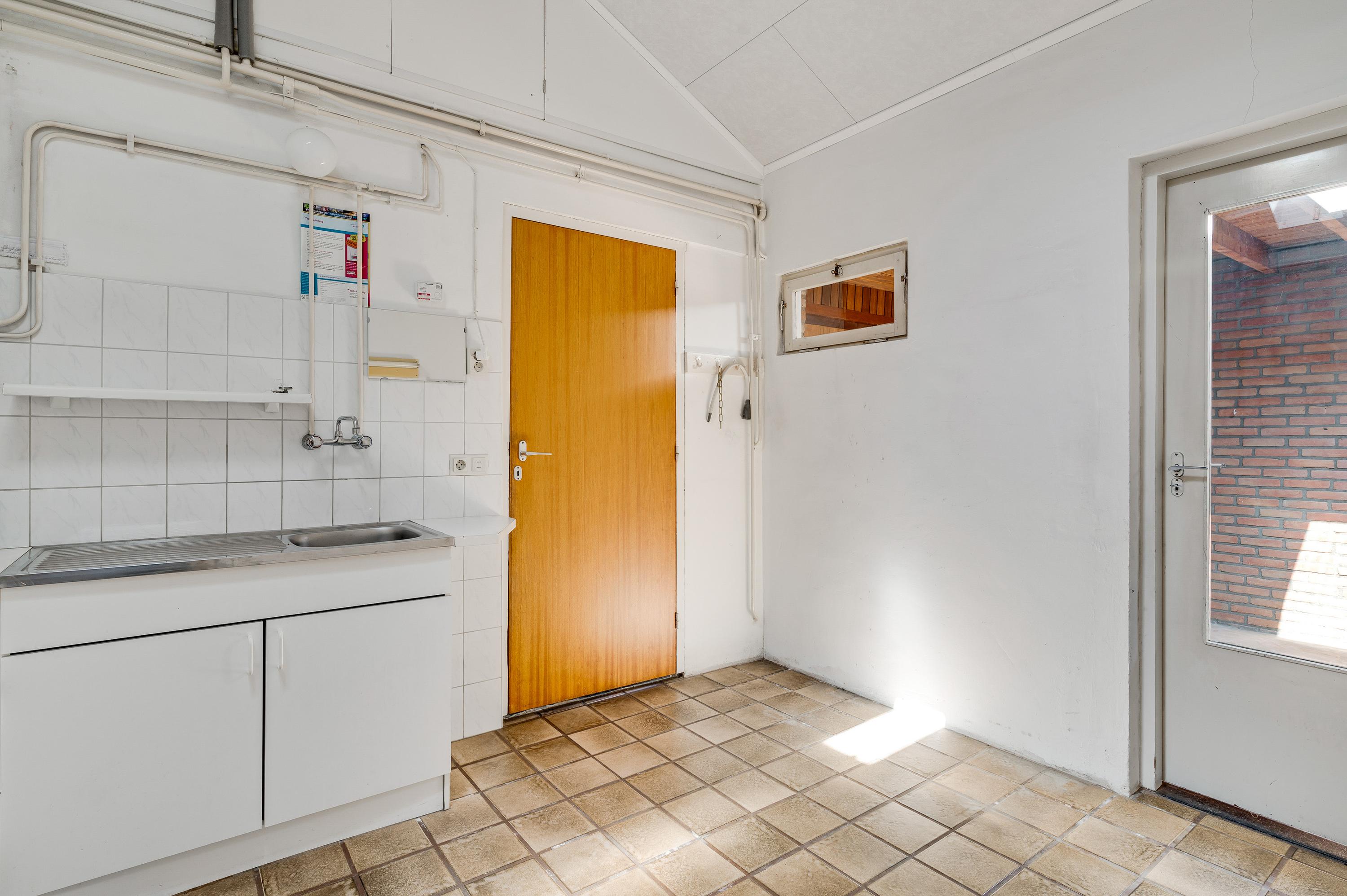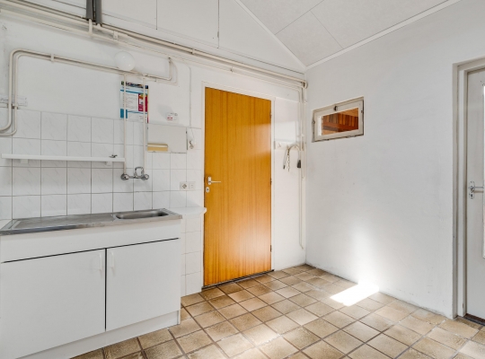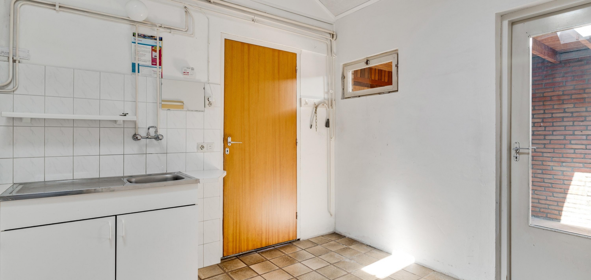 Vanuit de keuken heeft u toegang tot een portaal, van waaruit u onder andere toegang heeft tot de oprit. Ook zijn hier de toiletruimte en een doucheruimte, beiden origineel uit de jaren ’60. De ruime bijkeuken (circa 3,05 x 3,08) biedt ruimte aan een keukenblok met spoelbak en de HR-ketel (Intergas Hre, 2023, huur).