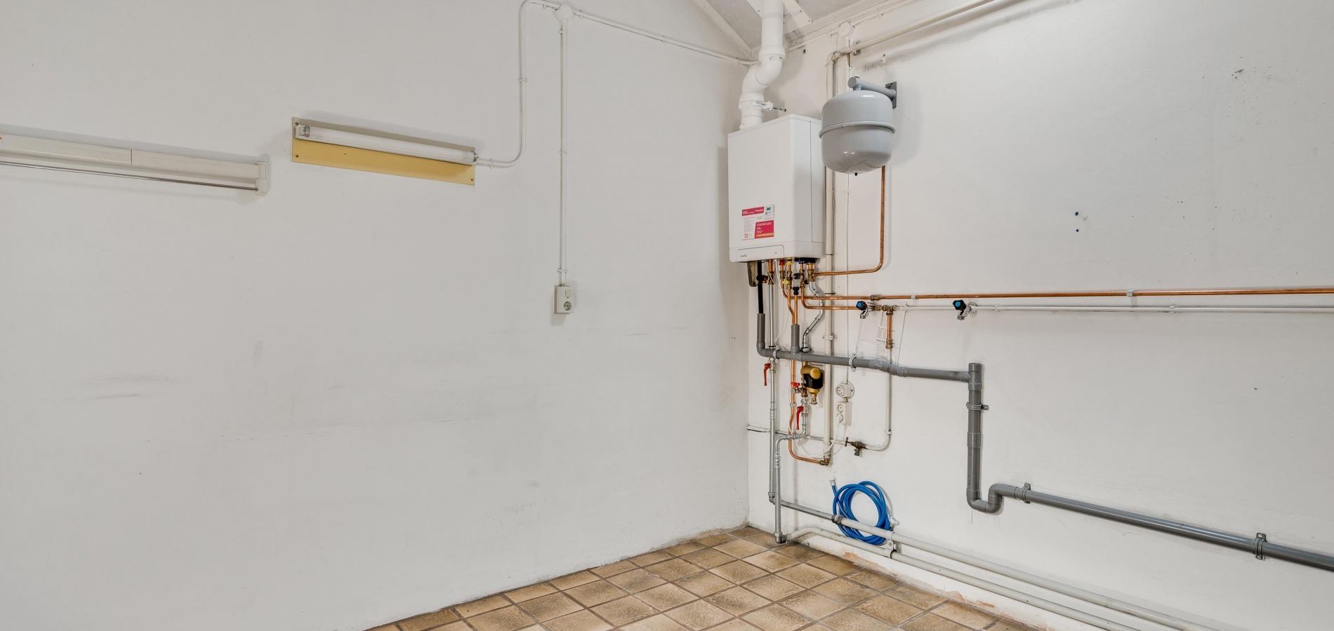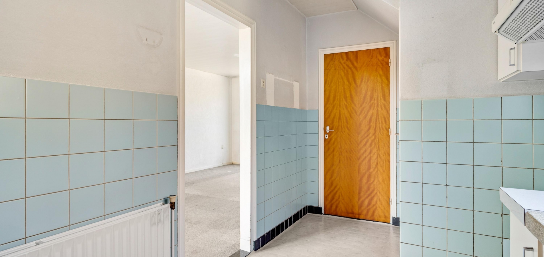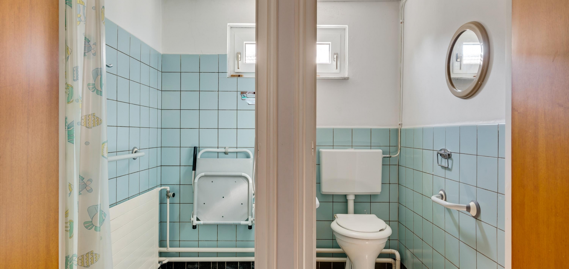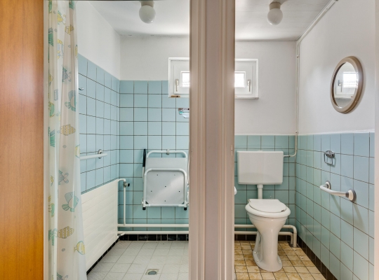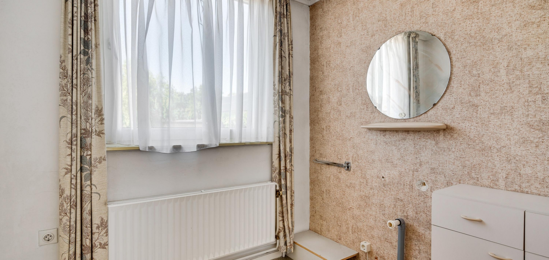 Vanuit de keuken heeft u toegang tot een portaal, van waaruit u onder andere toegang heeft tot de oprit. Ook zijn hier de toiletruimte en een doucheruimte, beiden origineel uit de jaren ’60. De ruime bijkeuken (circa 3,05 x 3,08) biedt ruimte aan een keukenblok met spoelbak en de HR-ketel (Intergas Hre, 2023, huur).