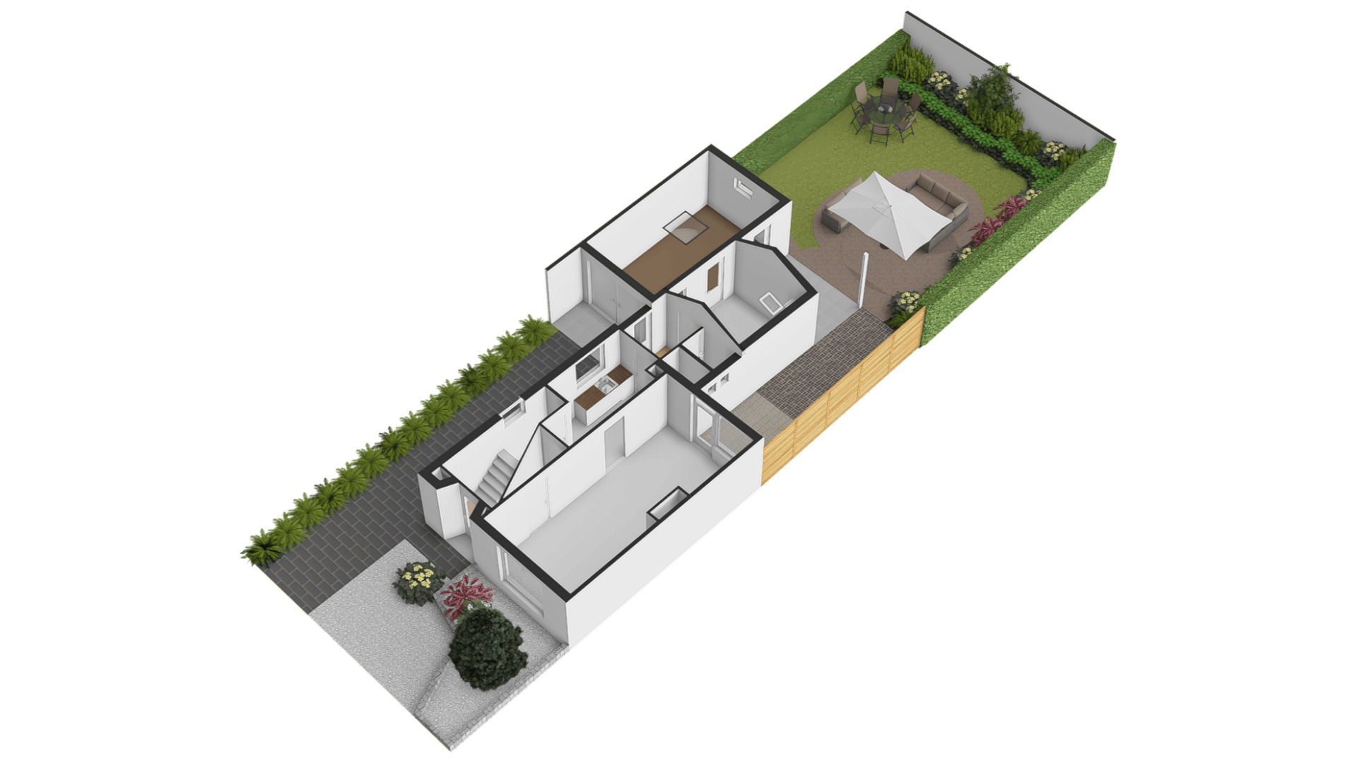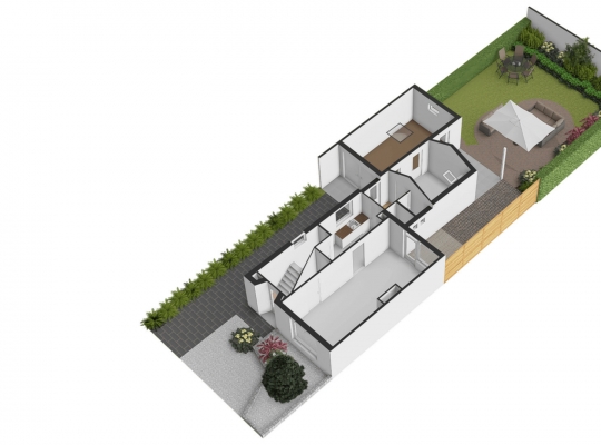 Vanuit de garage en woonkamer is de achtertuin te bereiken, met een overdekt terras (circa 3,32 x 2,33) en twee zonneterrassen. Verder ziet u groen in de tuin, en is er verrassend veel privacy. De onderhoudsvriendelijke voortuin, de oprit en de border met beplanting zijn, net als de woning, keurig onderhouden.