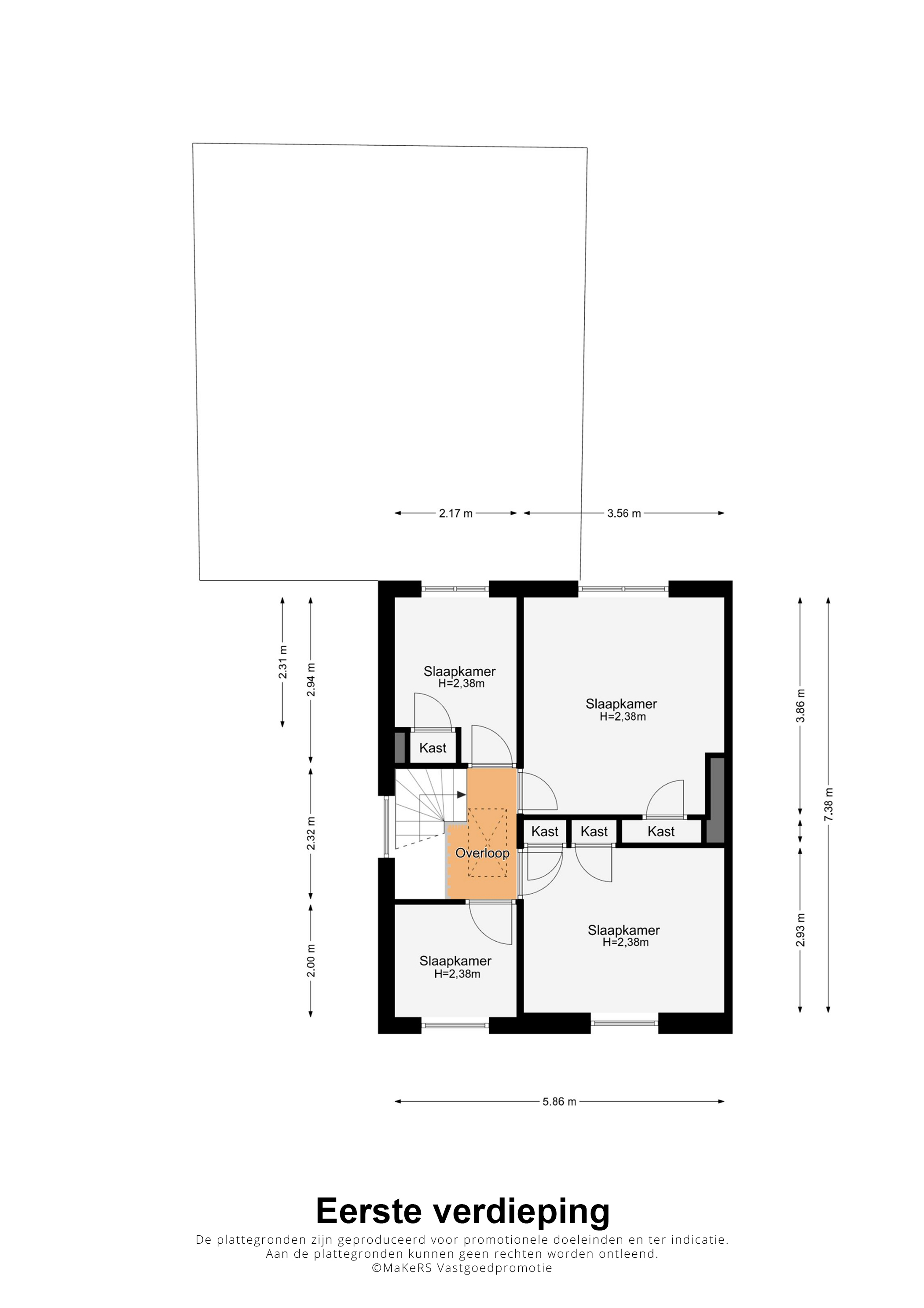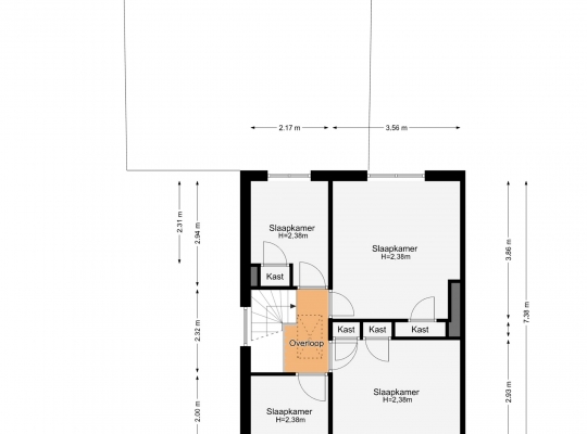Vanaf de lichte overloop heeft u toegang tot vier slaapkamers, met de mogelijkheid om een van deze slaapkamers te verbouwen tot badkamer. Slaapkamer I (circa 2,00 x 2,17) aan de voorzijde is hiervoor geschikt, net als slaapkamer II (circa 2,94 x 2,17) aan de achterzijde. Slaapkamer III (circa 3,56 x 2,93) is aan de voorzijde, en slaapkamer IV (circa 3,86 x 3,56) bevindt zich aan de achterzijde. Maar liefst drie slaapkamers zijn voorzien van een of twee inbouwkast(en).