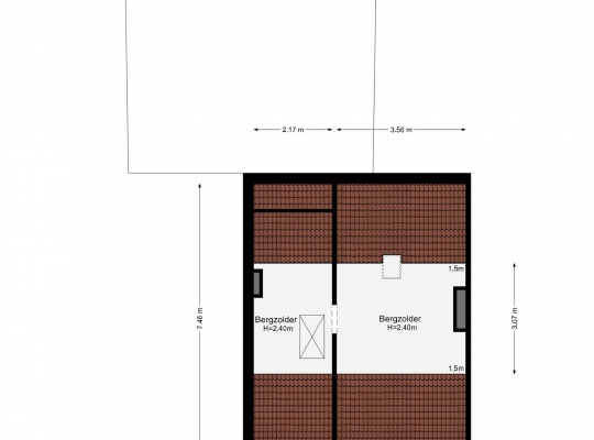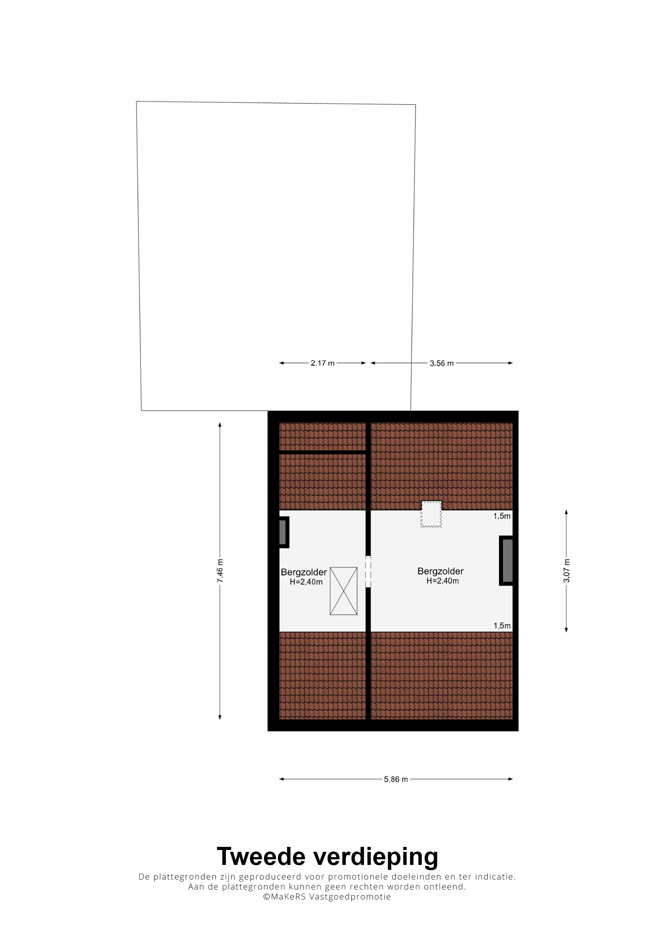 Vanaf de overloop is de zolder te bereiken, die uit twee delen bestaat. De totale oppervlakte is circa 5,86 x 3,07 meter (vanaf 1,50 meter hoogte), wat de mogelijkheid biedt om een extra slaapkamer te realiseren.