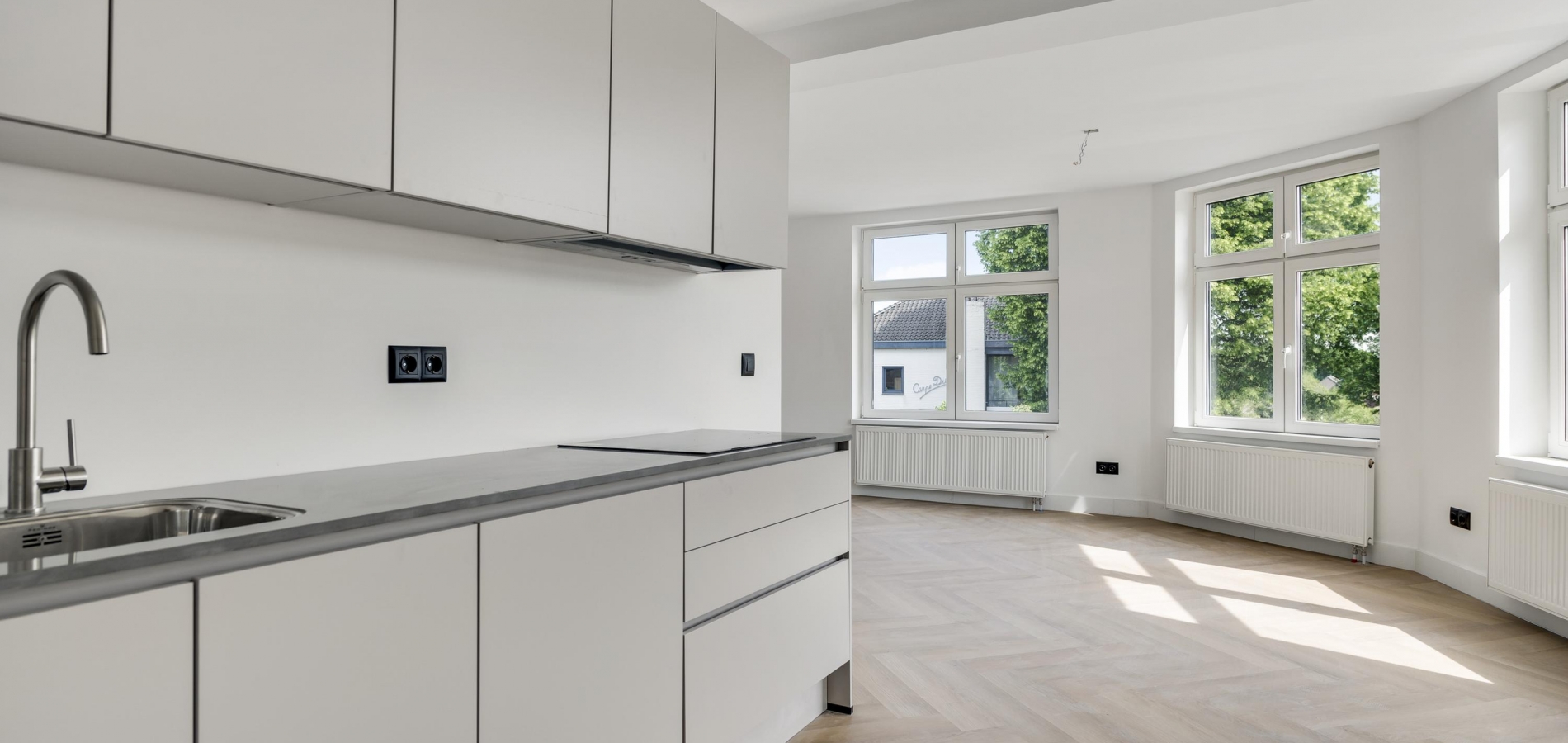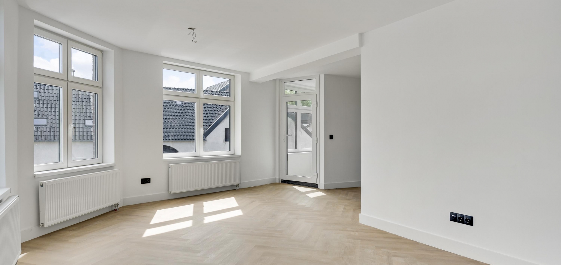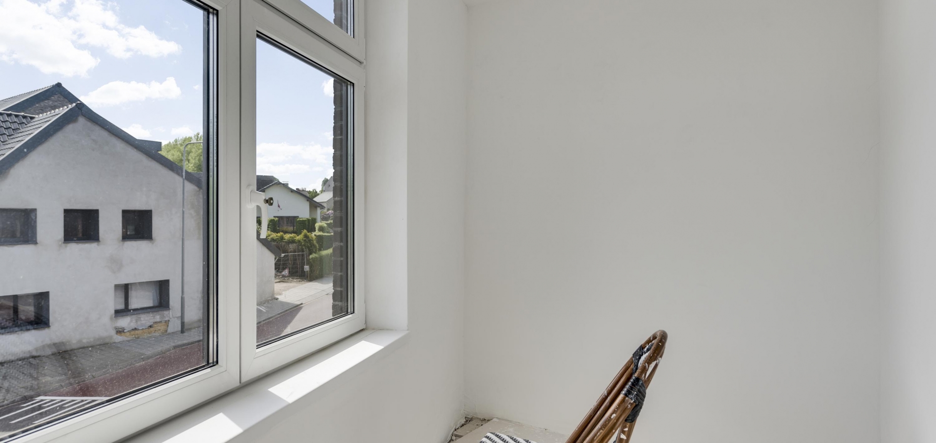 De woonkamer met open keuken heeft een oppervlakte van circa 33 m2, met grote ramen aan twee zijden en een deur naar de wintertuin van circa 4 m2. In de woonkamer is genoeg plek voor een hoekbank, tv-meubel en een eettafel. In een vaste kast is de opstelling van de HR-ketel (Intergas, 2024/2025, eigendom). Het uitzicht is levendig, naar de Rijksweg (Valkenburg-Maastricht) en de Sibberweg richting Margraten.