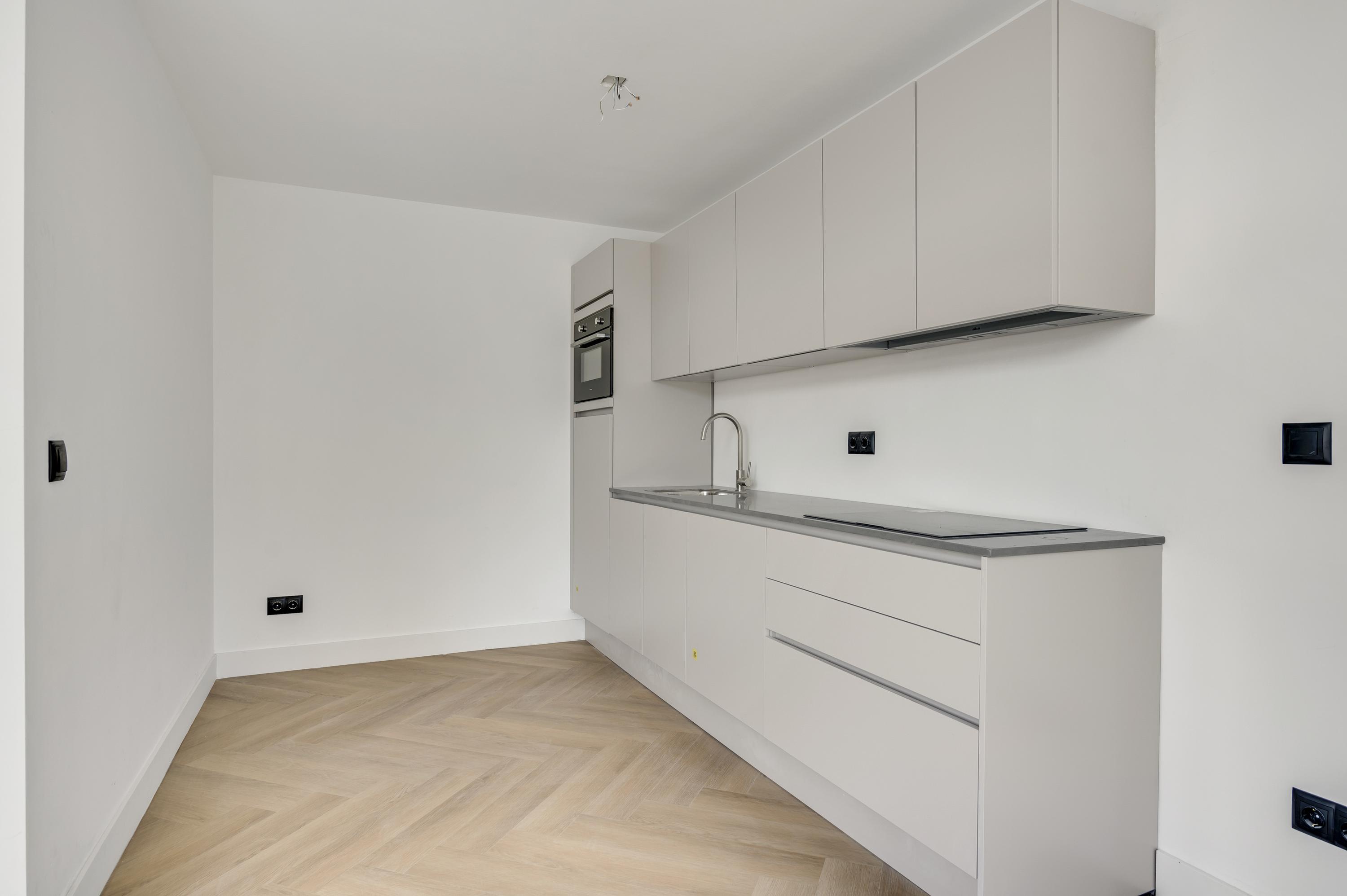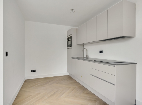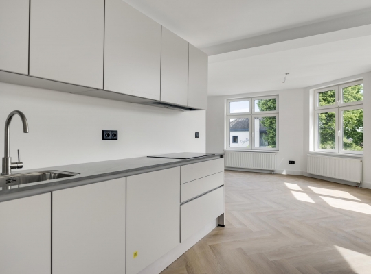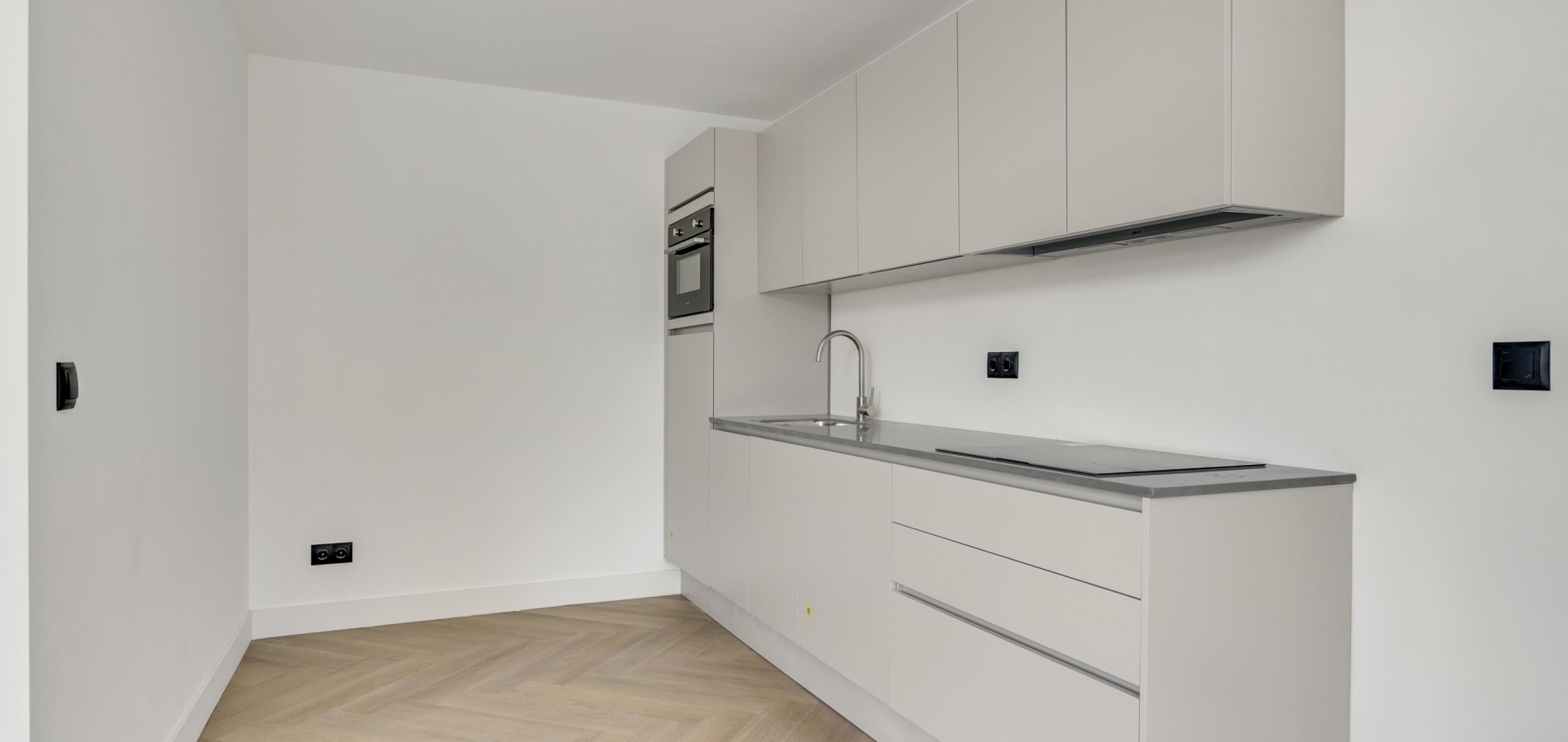 Via het eetgedeelte loopt u de keuken in, waar een mooie wandopstelling met alle benodigde inbouwapparatuur staat: een inductie kookplaat, afzuigkap, combi-oven, vaatwasser en een koelkast met vriesvak. Er is genoeg plek in de keuken om een bartafel of een grote servieskast neer te zetten.