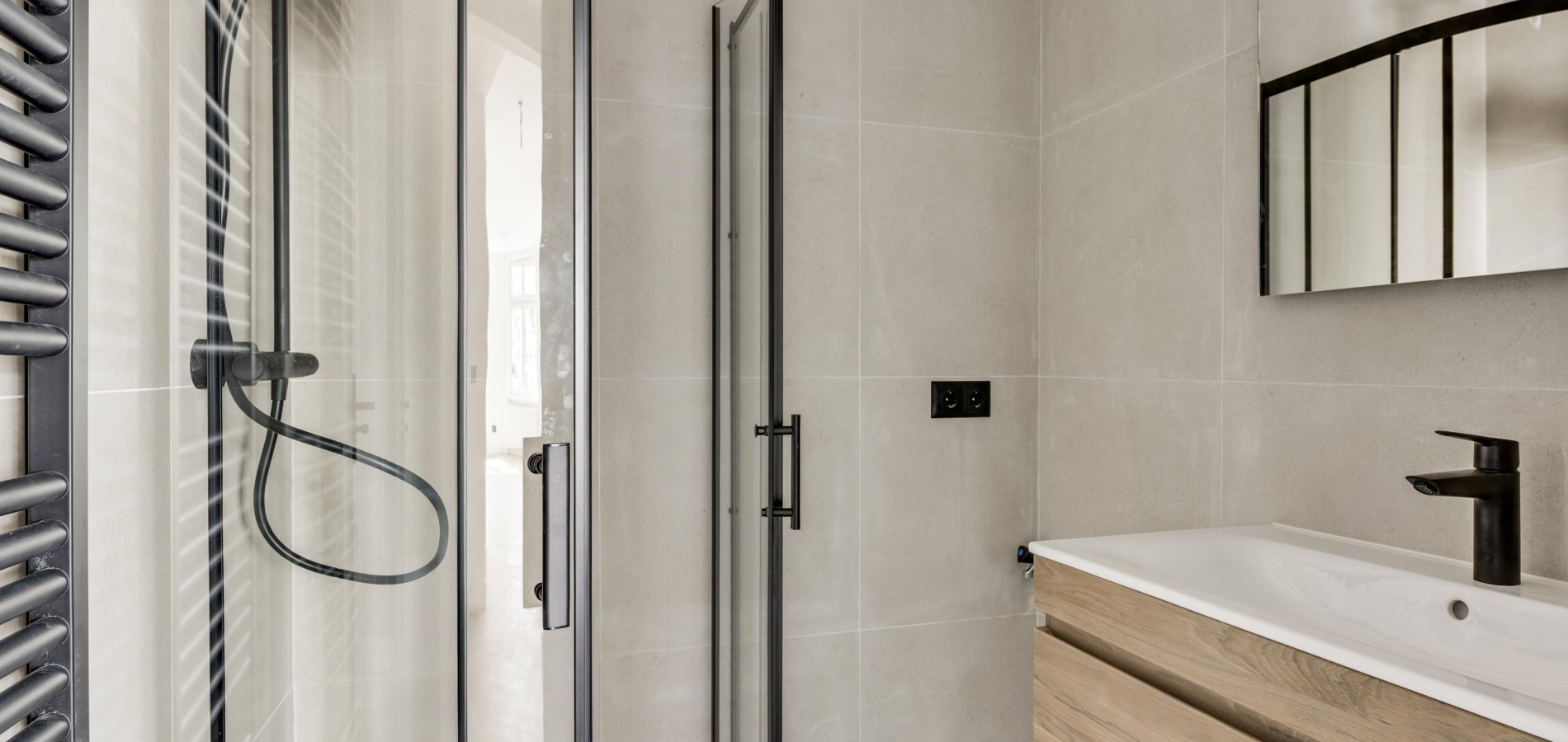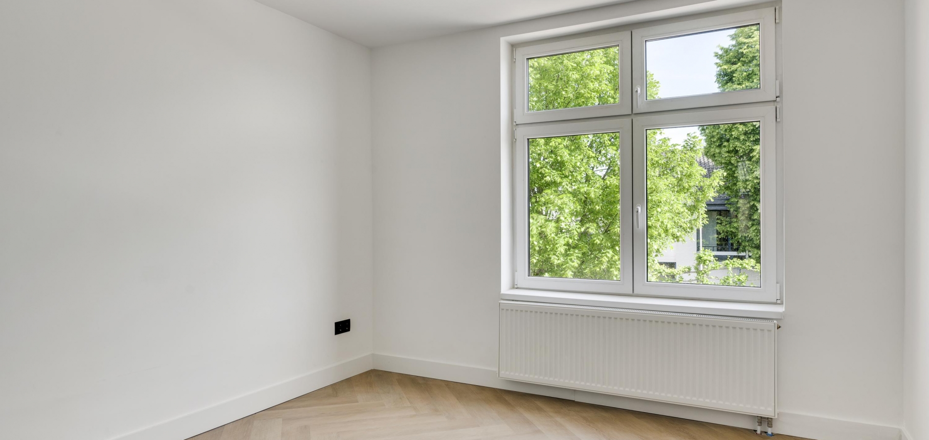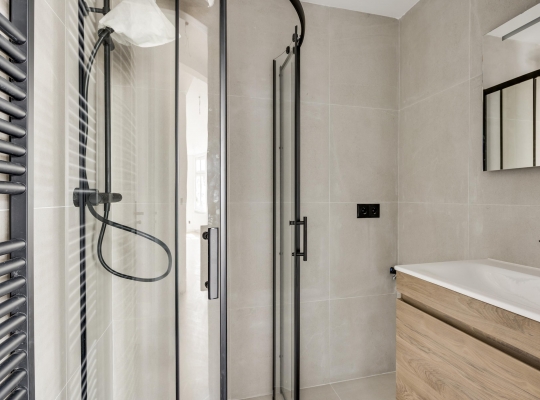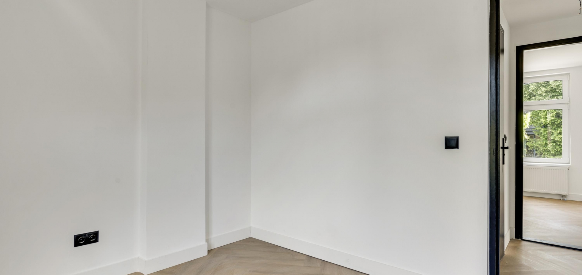 Dit goed ingedeelde appartement heeft twee slaapkamers. Slaapkamer I (circa 3,30 x 3,28) is aan de voorzijde en slaapkamer II (circa 3,32 x 3,00) bevindt zicht aan de achterzijde. Tussen de slaapkamers is de badkamer met een kwartronde douche, wastafelmeubel en de wasmachineaansluiting. Fraaie elementen zijn de kwartronde douchewand, zwarte kranen, hoge handdoekenradiator en de spiegel boven de wastafel.