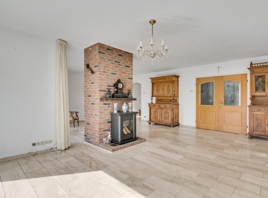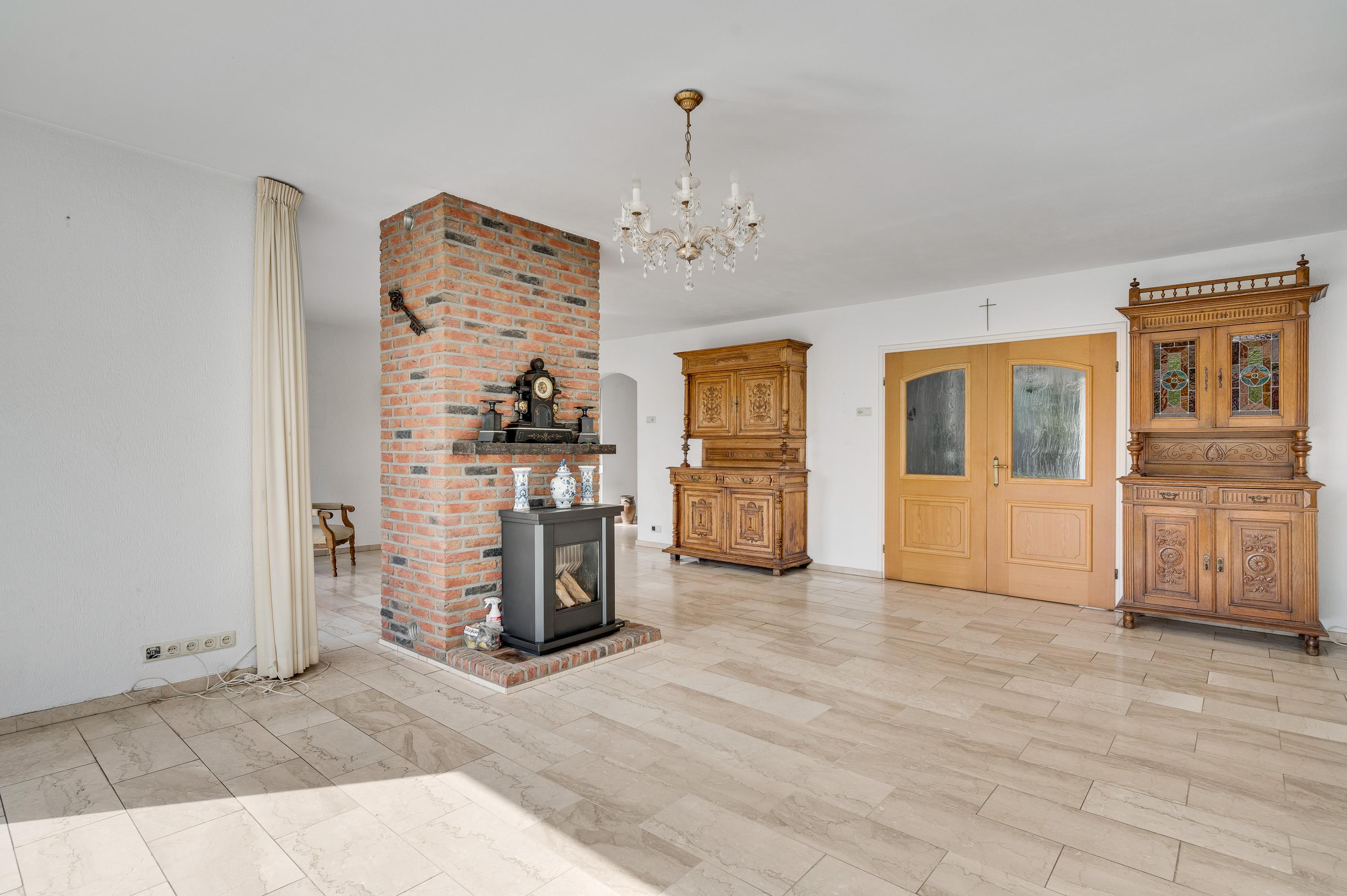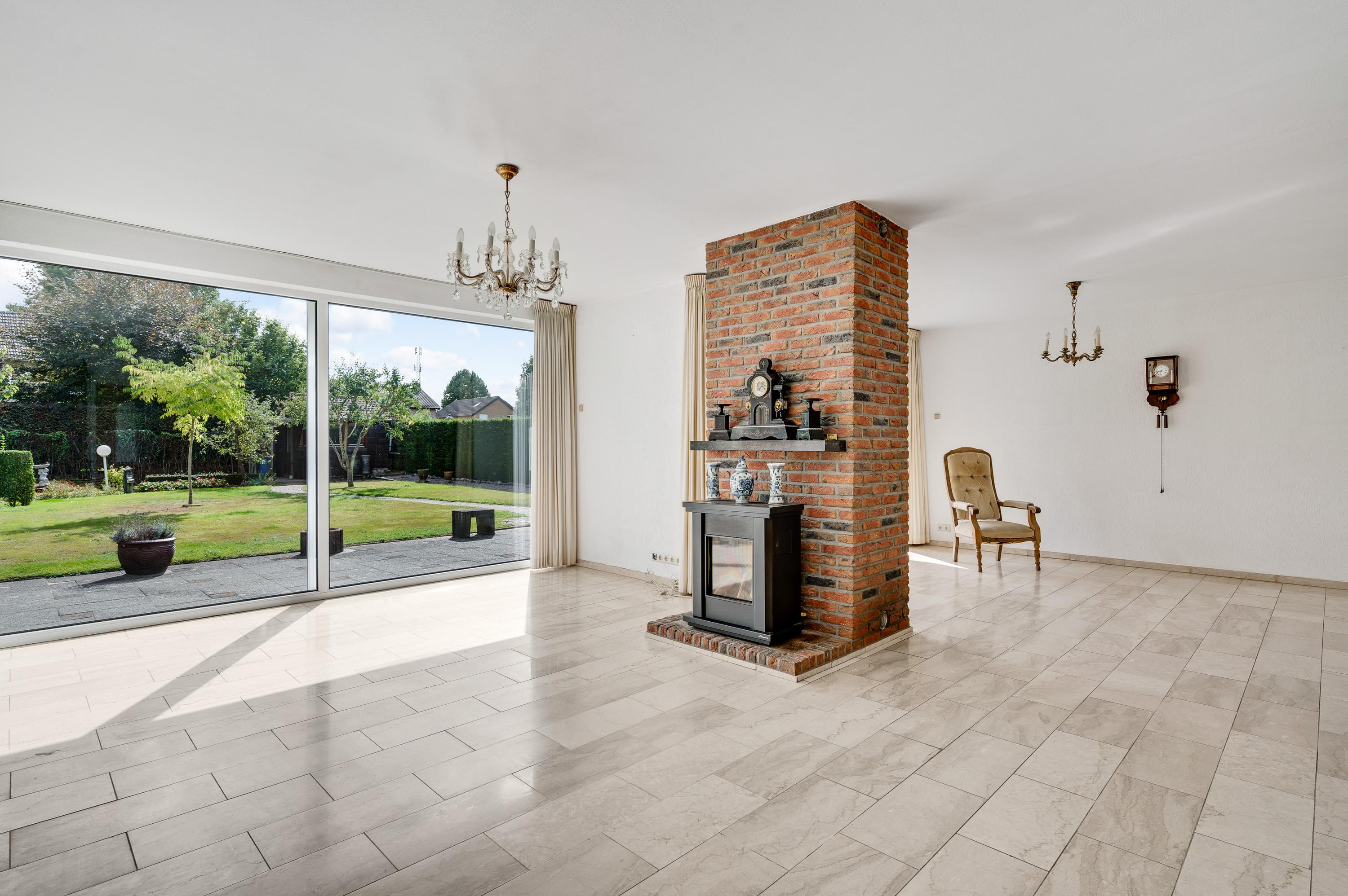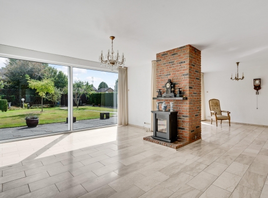 Dubbele deuren met glas verbinden de hal met de tuingerichte woon-/eetkamer, over de hele breedte van het woonhuis. Met een totale oppervlakte van circa 42,5 m2 is er genoeg plek voor een grote zithoek, de eettafel en andere meubelstukken. Blikvanger is de gemetselde schouw met een gas gestookte kachel, gericht naar het zitgedeelte. Opvallend zijn de grote ramen, van vloer tot plafond, met fraai lichtinval en uitzicht naar de tuin.