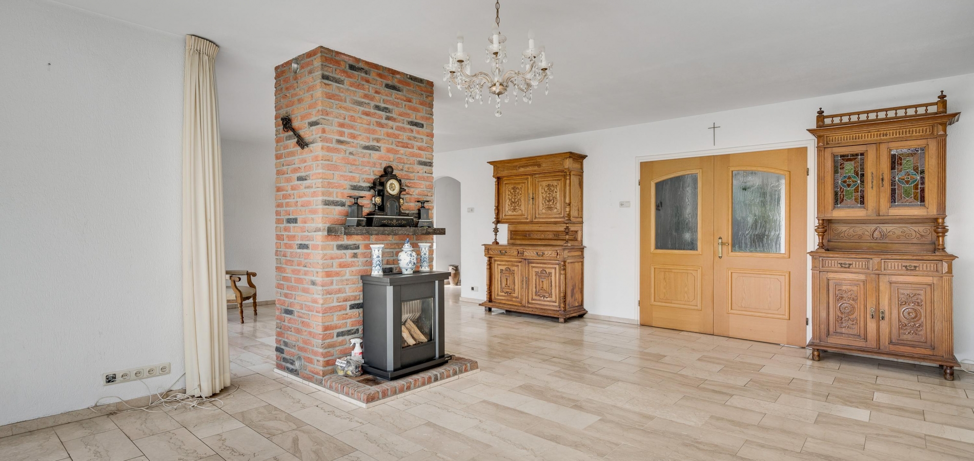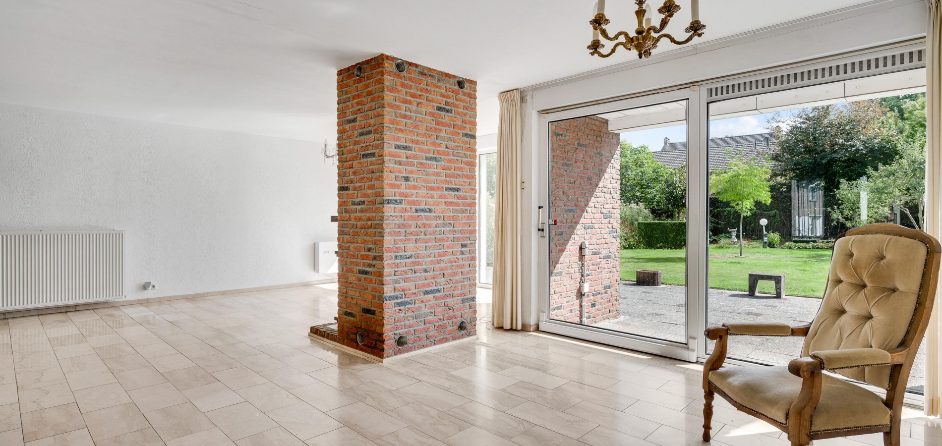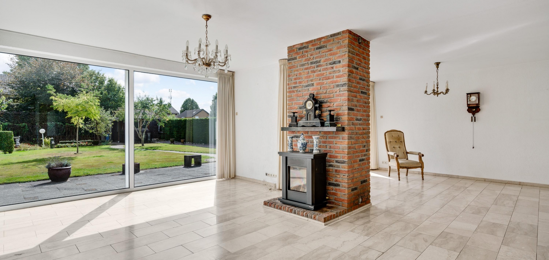 Dubbele deuren met glas verbinden de hal met de tuingerichte woon-/eetkamer, over de hele breedte van het woonhuis. Met een totale oppervlakte van circa 42,5 m2 is er genoeg plek voor een grote zithoek, de eettafel en andere meubelstukken. Blikvanger is de gemetselde schouw met een gas gestookte kachel, gericht naar het zitgedeelte. Opvallend zijn de grote ramen, van vloer tot plafond, met fraai lichtinval en uitzicht naar de tuin.