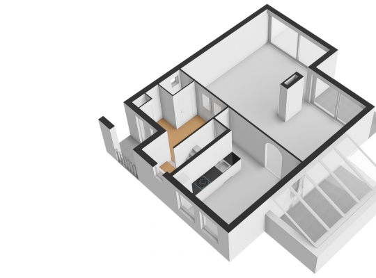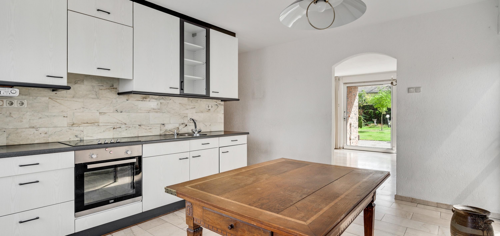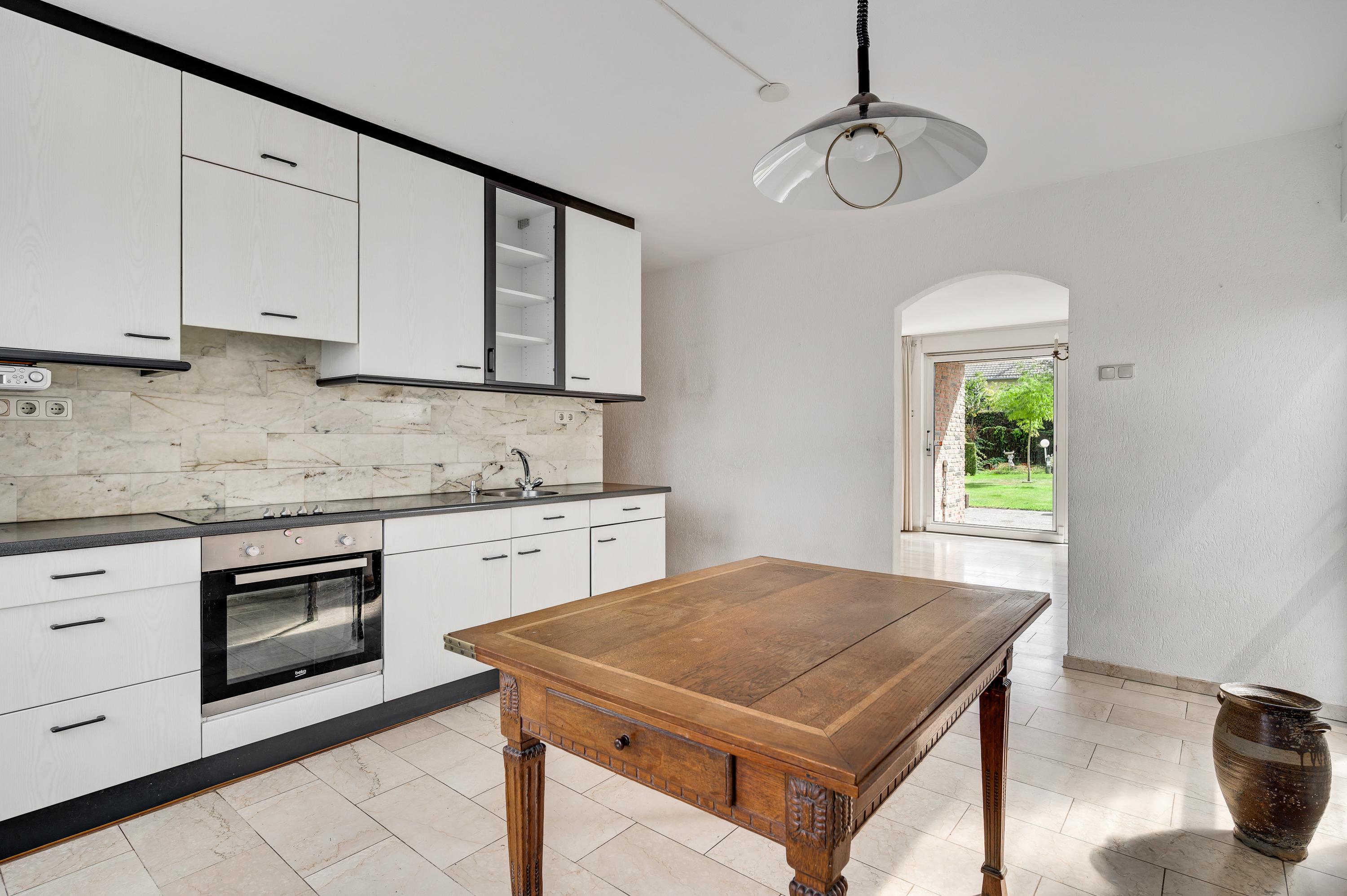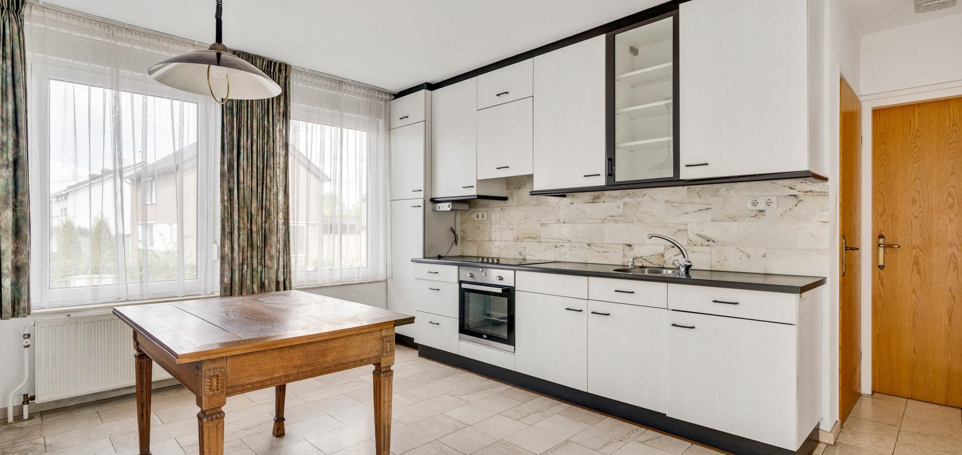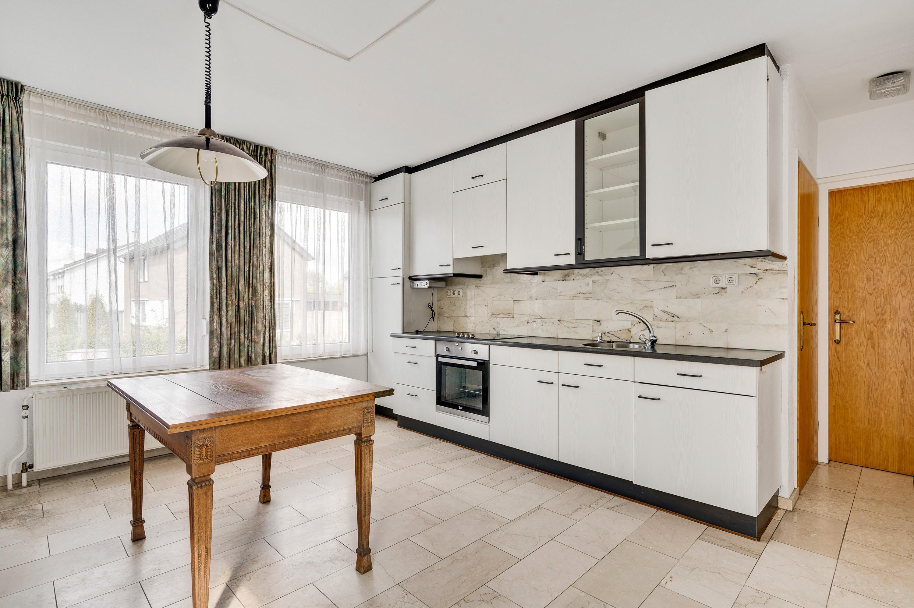 Bij het eetgedeelte is een doorgang naar de keuken (circa 4,50 x 3,50), met uitzicht naar de Valkenburgerstraat. Er is genoeg plek voor een eettafel en de lichte wandopstelling heeft een ingebouwde keramische kookplaat, afzuigkap, combi-oven en een koelkast.