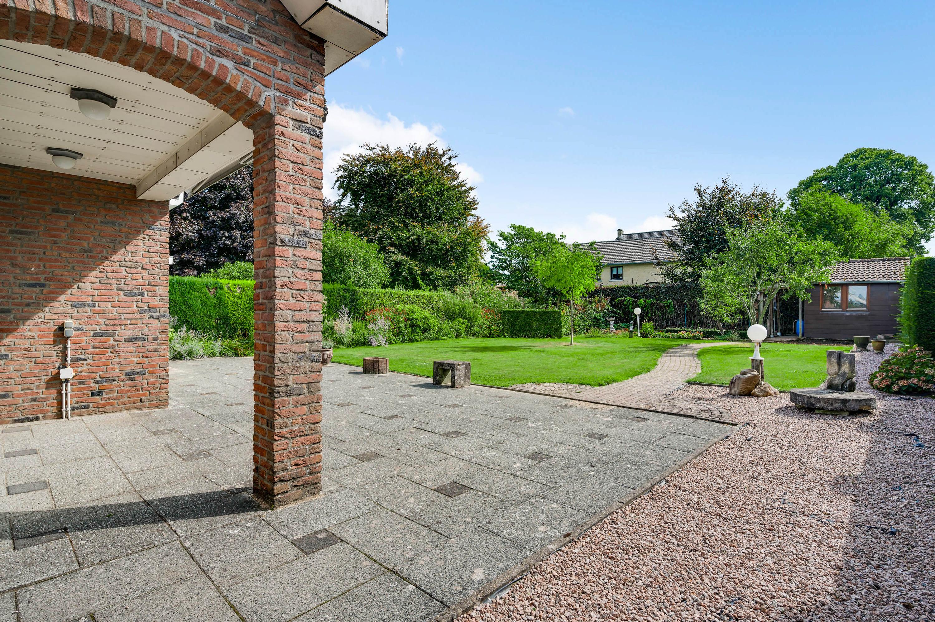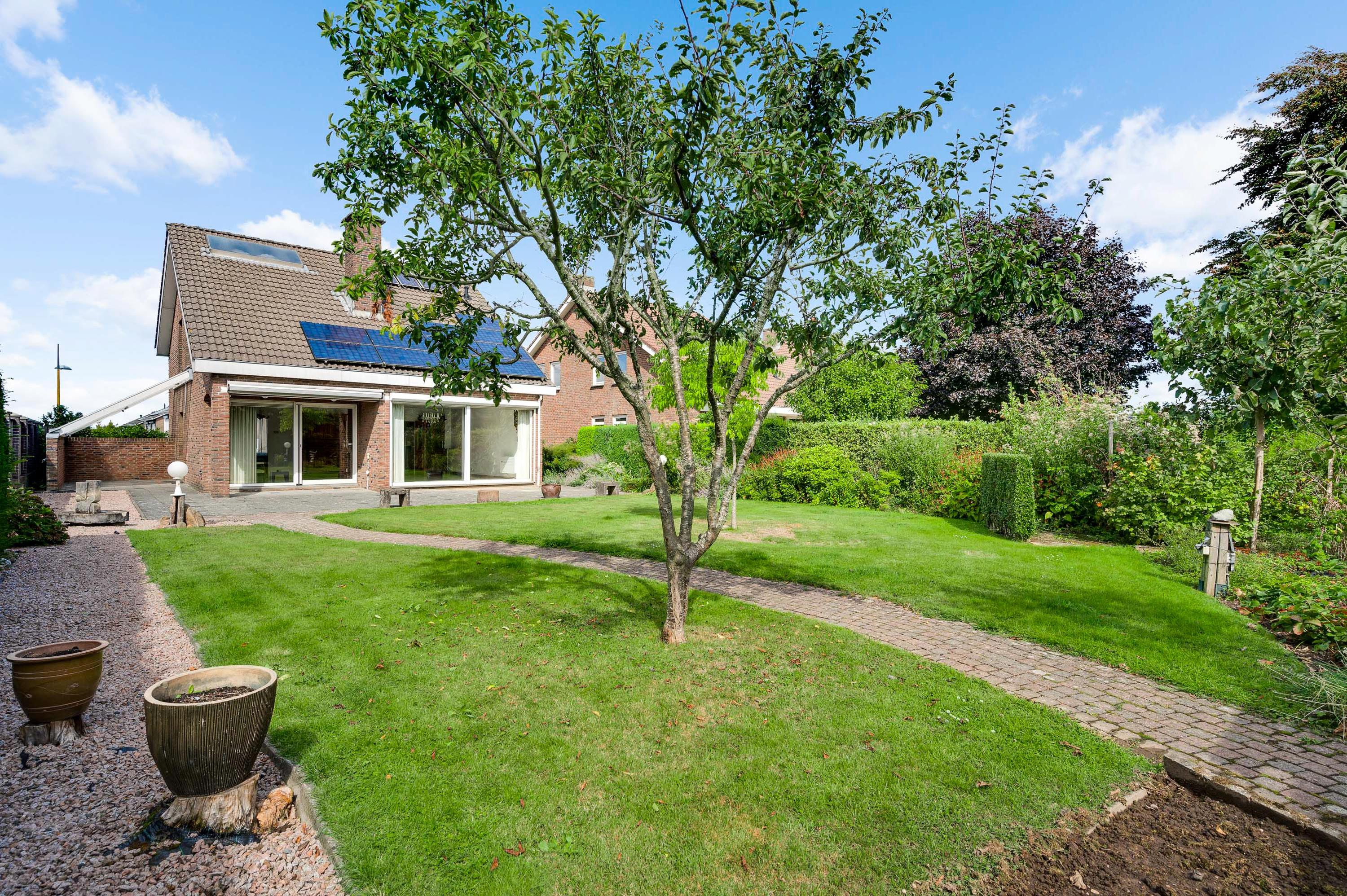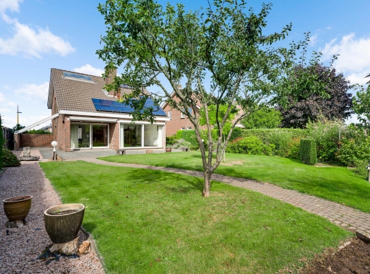 Dit degelijk gebouwde woonhuis wordt omringd door een royale tuin, met de diepe achtertuin op het zuiden. Bij het eetgedeelte in de woonkamer is een schuifpui naar een overdekt terras van circa 3,70 x 1,70), en vanuit de keuken is een overdekt terras (circa 5,00 x 2,75) aan de westkant te bereiken. En als u door de achtertuin loopt, ziet u een houten berging (circa 3,95 x 2,60). Perfect voor het tuingereedschap!