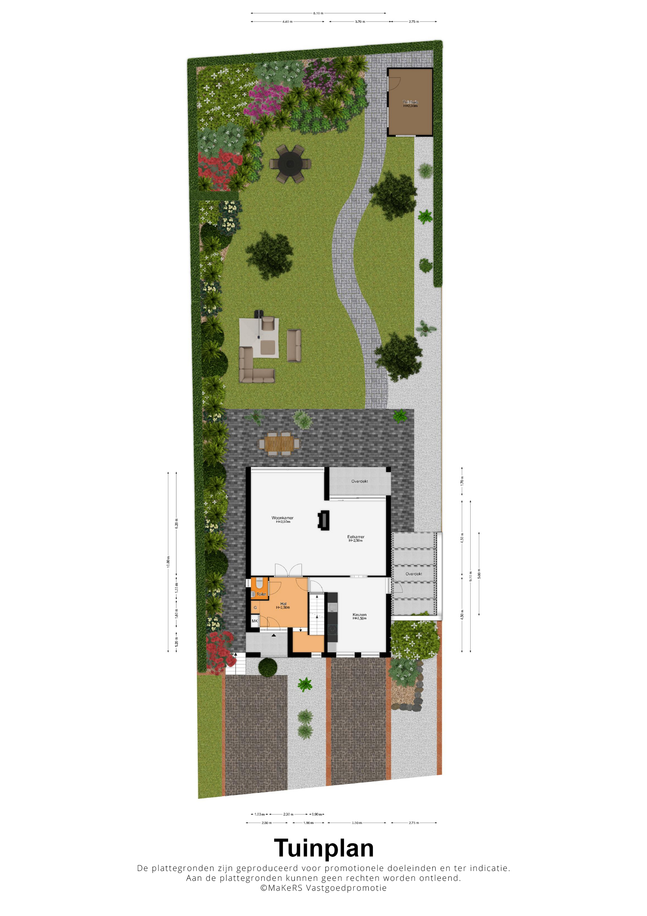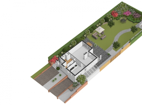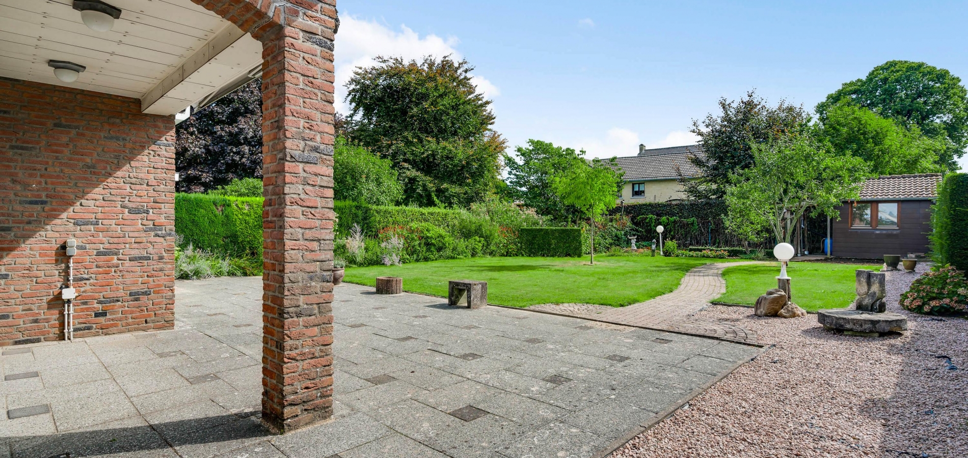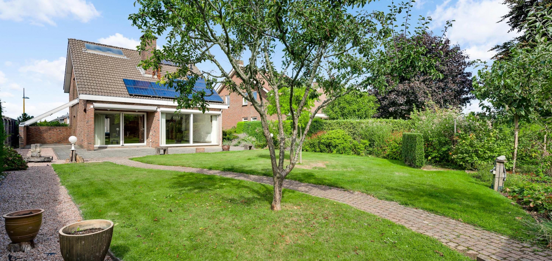 Dit degelijk gebouwde woonhuis wordt omringd door een royale tuin, met de diepe achtertuin op het zuiden. Bij het eetgedeelte in de woonkamer is een schuifpui naar een overdekt terras van circa 3,70 x 1,70), en vanuit de keuken is een overdekt terras (circa 5,00 x 2,75) aan de westkant te bereiken. En als u door de achtertuin loopt, ziet u een houten berging (circa 3,95 x 2,60). Perfect voor het tuingereedschap!