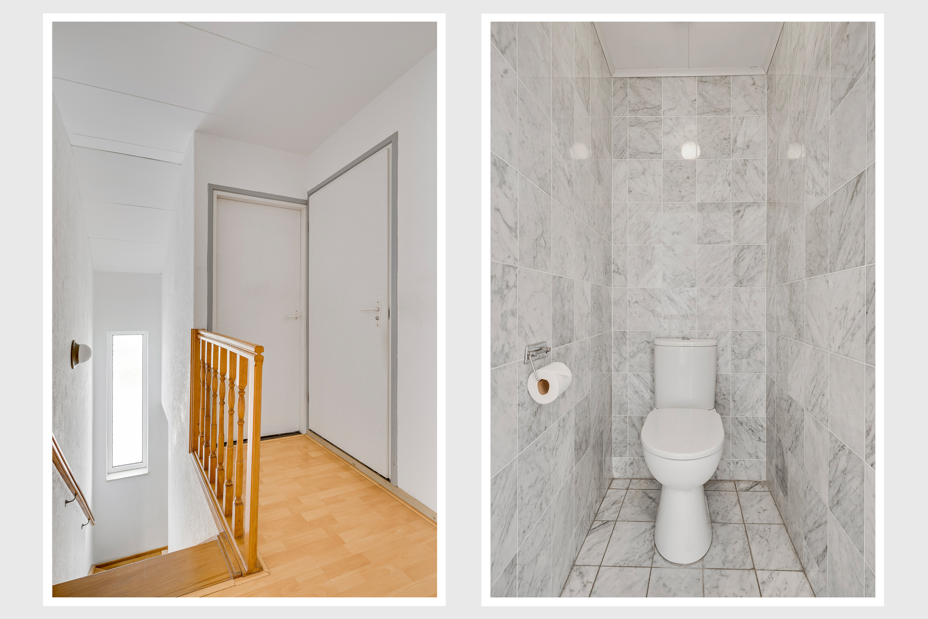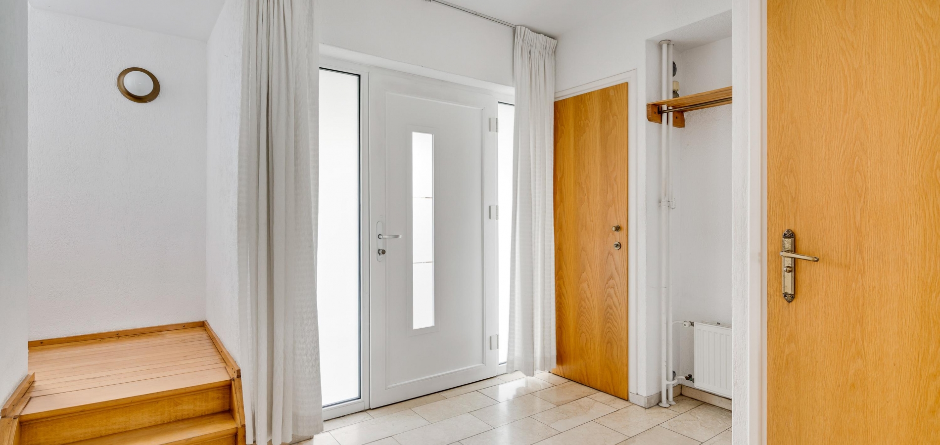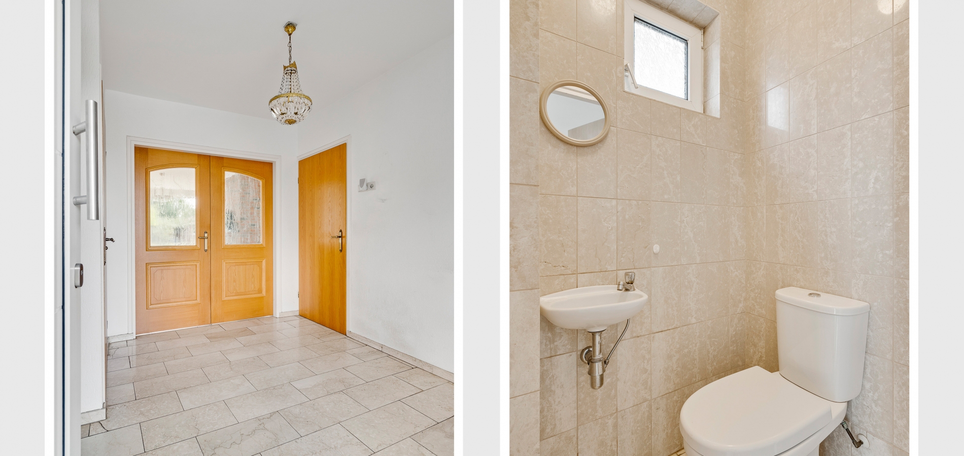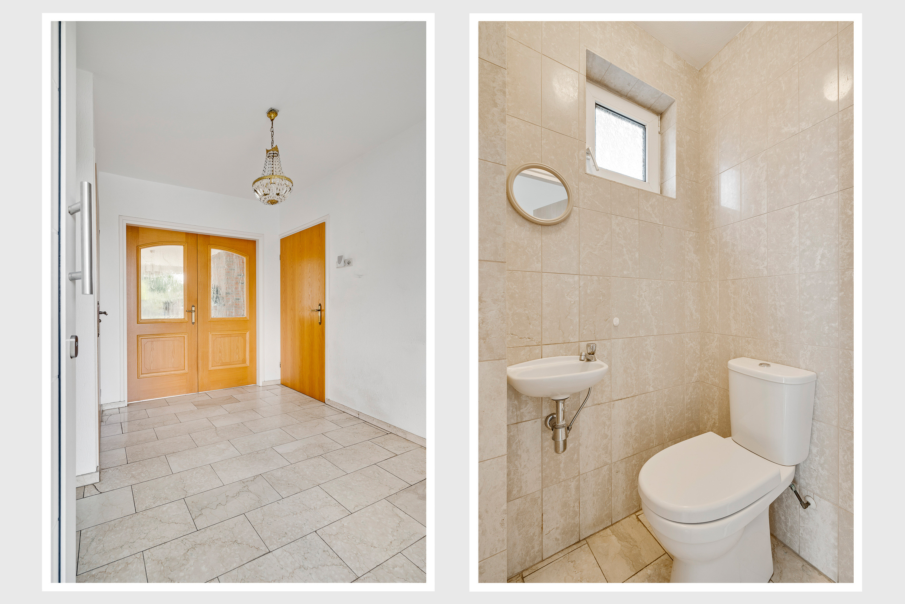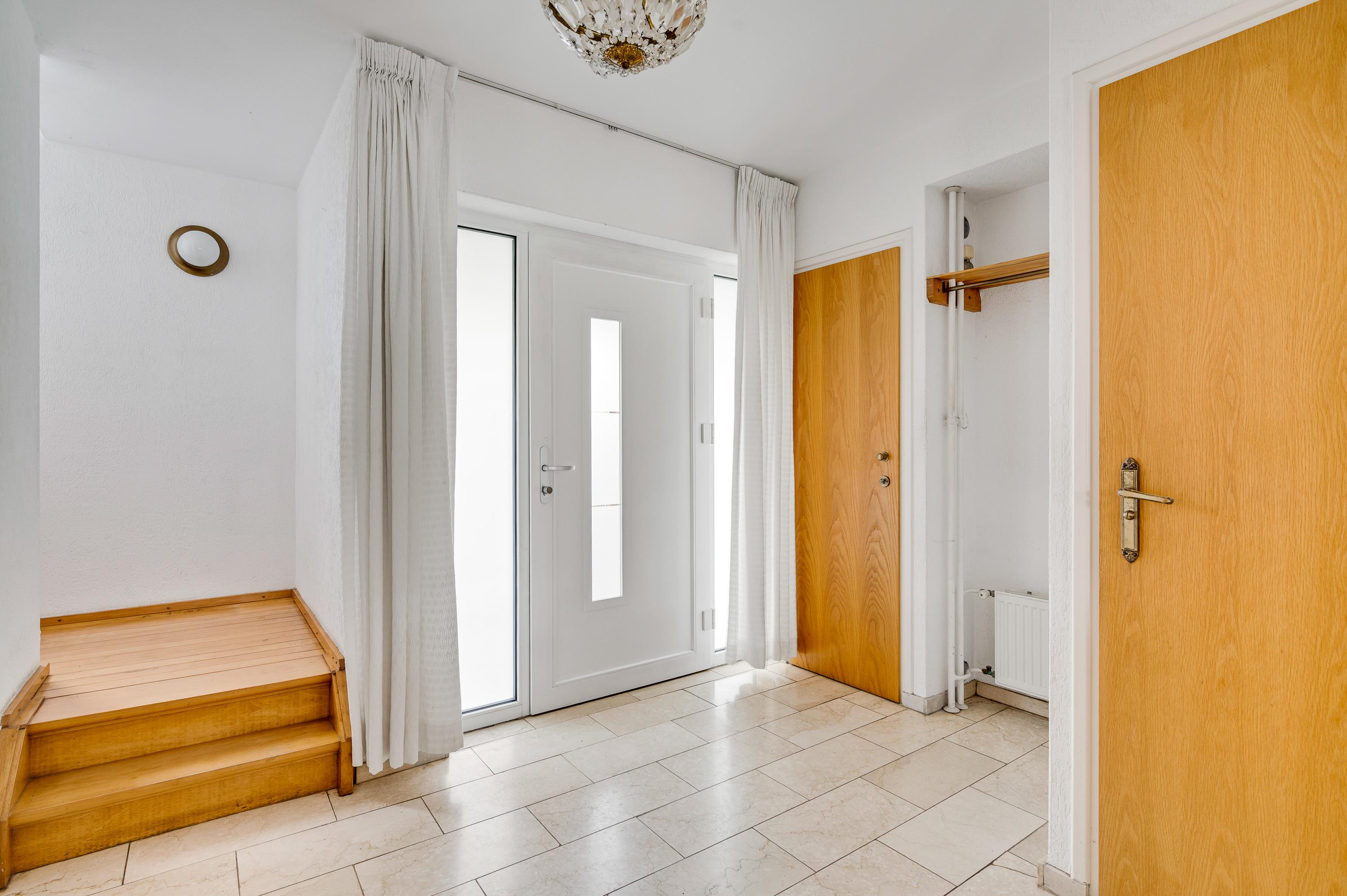 Via de overdekte entree, aan de linker voorzijde van het woonhuis, is de royale ontvangsthal (circa 3,00 x 2,30) te bereiken. Hier ligt, net als op de hele begane grond, een fraaie marmeren vloer. Links in de hal zijn de meterkast en de toiletruimte met fonteintje.