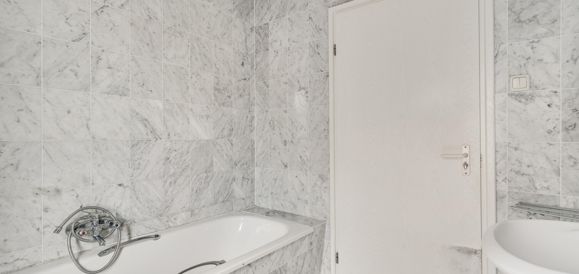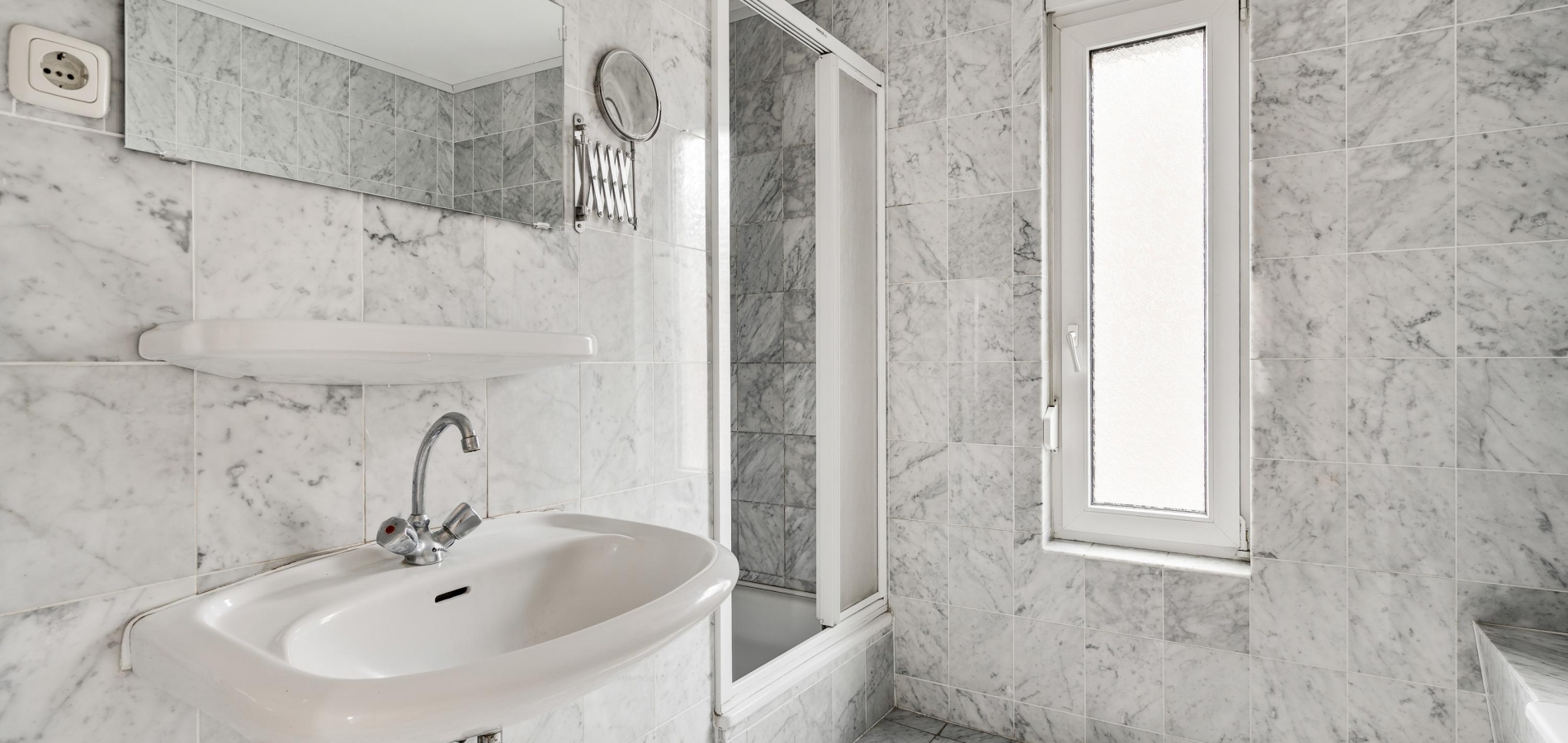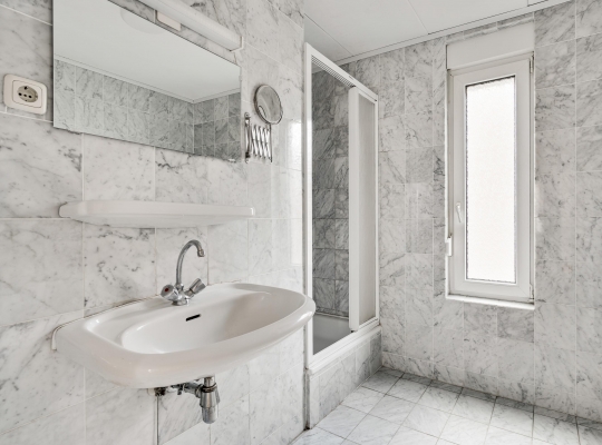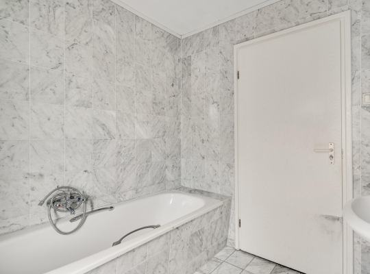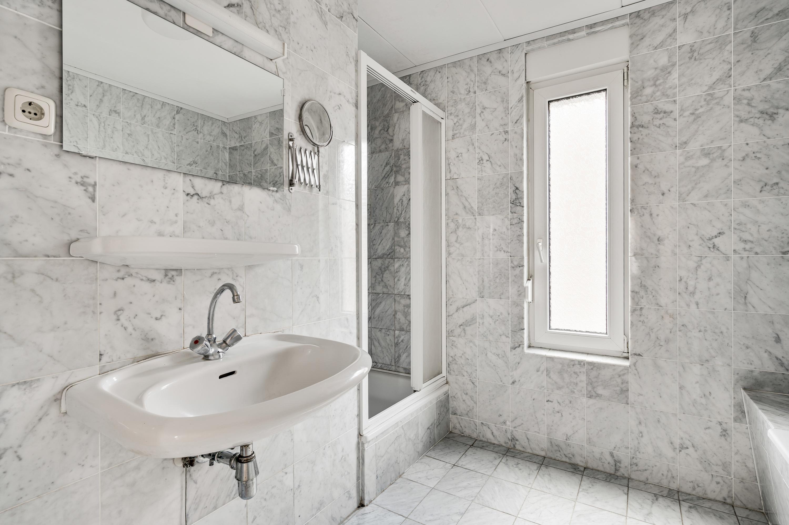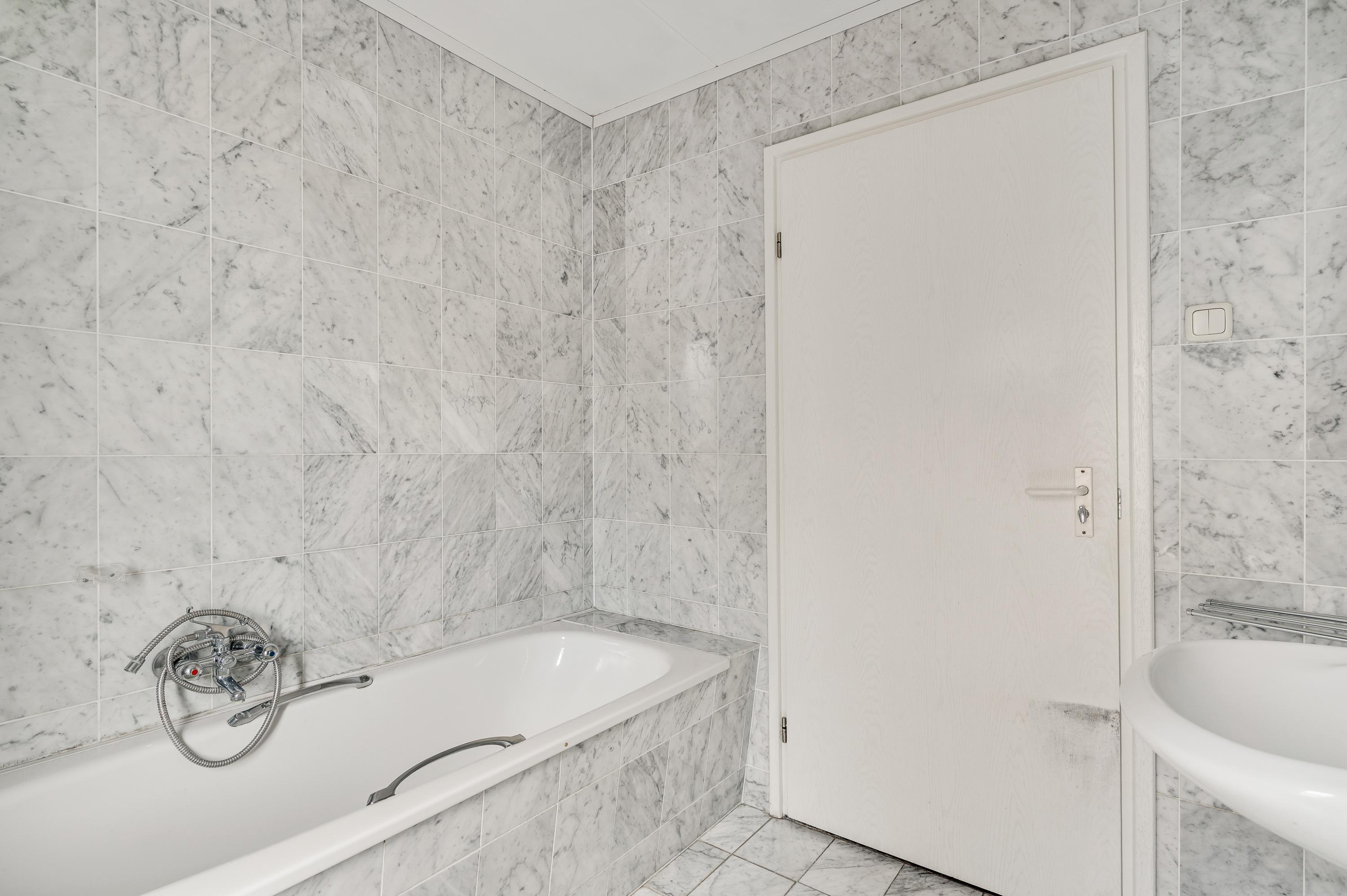 In de badkamer (circa 3,26/2,26 x 2,43) zijn de wand- en vloertegels uitgevoerd in marmer. Erg fijn is het hoge raam in de zijgevel, en de ruimte is ingedeeld met een ligbad, aparte douche en een wastafel.