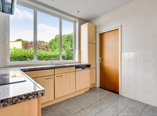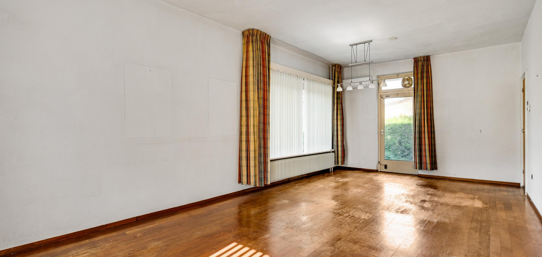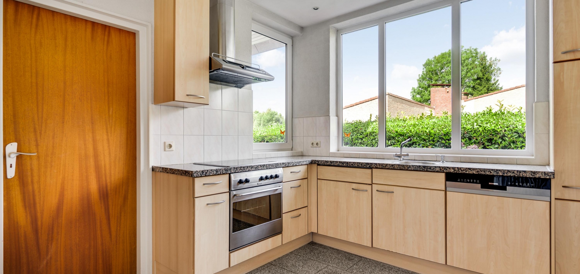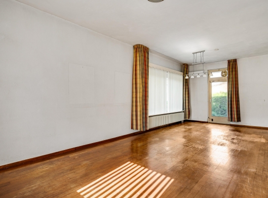 De woonkamer (circa 7,48 x 3,84) bevindt zich aan de voorzijde, met aan drie kanten uitzicht naar de tuin en een deur naar het overdekte terras. Aan de overzijde van de straat staat de Sint-Lambertuskerk, die vanuit de woonkamer goed zichtbaar is. Naast de woonkamer is de dichte keuken (circa 3,55/3,00 x 2,85), met toegang tot de hal en het souterrain. De keukenopstelling, in een L-vorm, heeft een granieten aanrechtblad en diverse inbouwapparatuur: een inductie kookplaat, afzuigkap, oven, vaatwasser en een koelkast. Een portaal verbindt de keuken met de zijtuin.