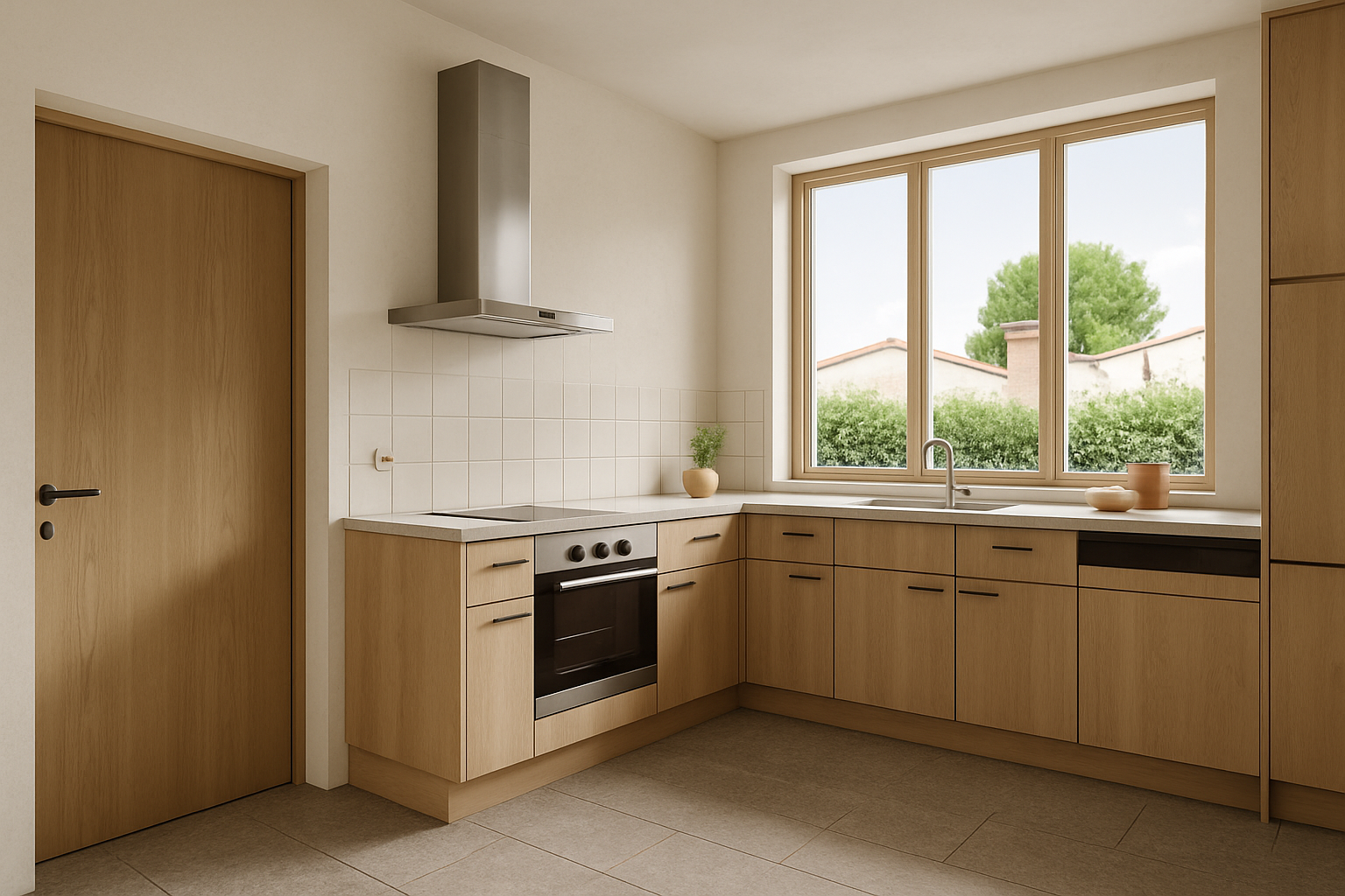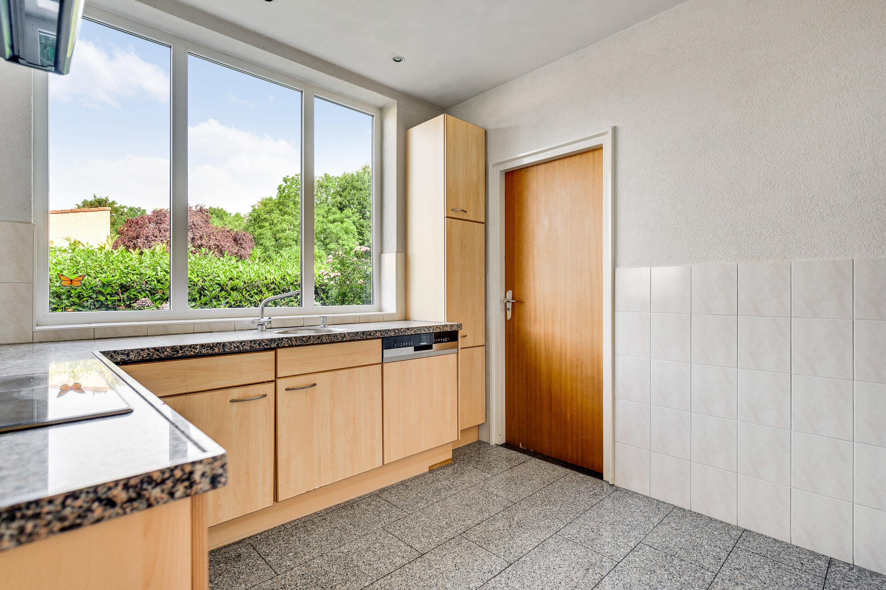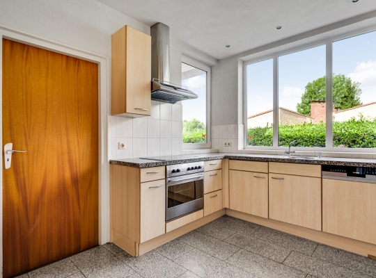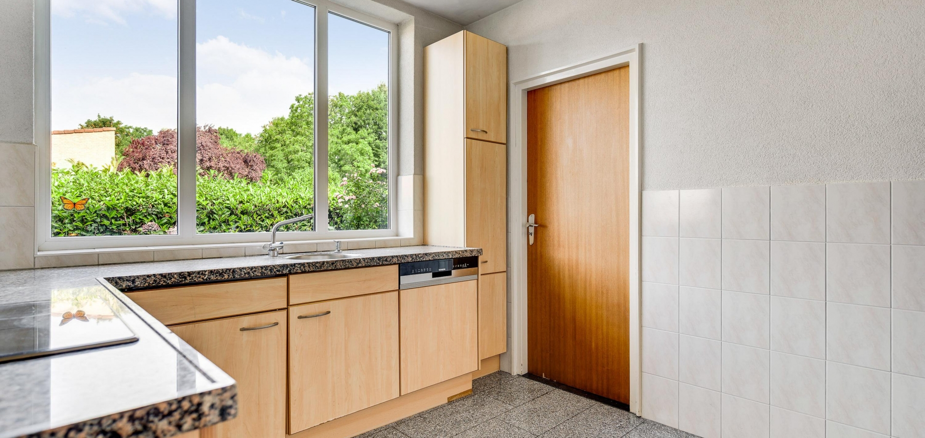 De woonkamer (circa 7,48 x 3,84) bevindt zich aan de voorzijde, met aan drie kanten uitzicht naar de tuin en een deur naar het overdekte terras. Aan de overzijde van de straat staat de Sint-Lambertuskerk, die vanuit de woonkamer goed zichtbaar is. Naast de woonkamer is de dichte keuken (circa 3,55/3,00 x 2,85), met toegang tot de hal en het souterrain. De keukenopstelling, in een L-vorm, heeft een granieten aanrechtblad en diverse inbouwapparatuur: een inductie kookplaat, afzuigkap, oven, vaatwasser en een koelkast. Een portaal verbindt de keuken met de zijtuin.