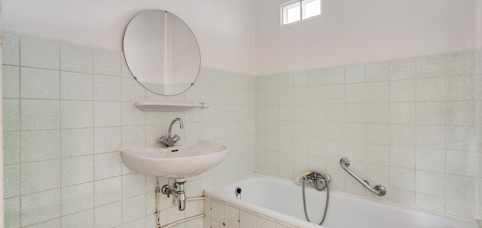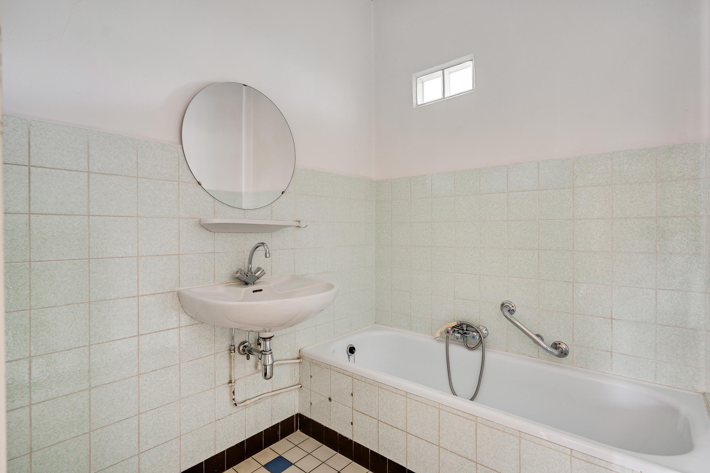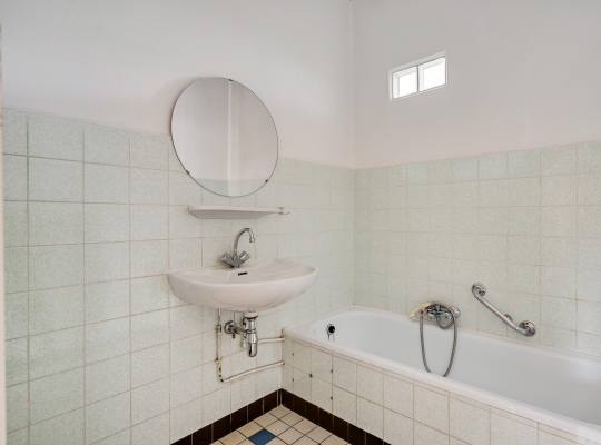 Ook de badkamer (circa 1,96 x 1,86) is op de begane grond. Deze ruimte, origineel uit het bouwjaar van het huis, is ingedeeld met een ligbad en een wastafel. Het is mogelijk om de badkamer te vergroten, richting het naastgelegen portaal.
