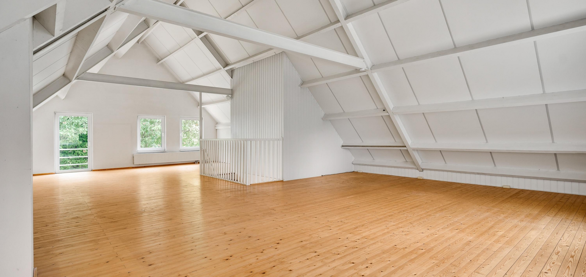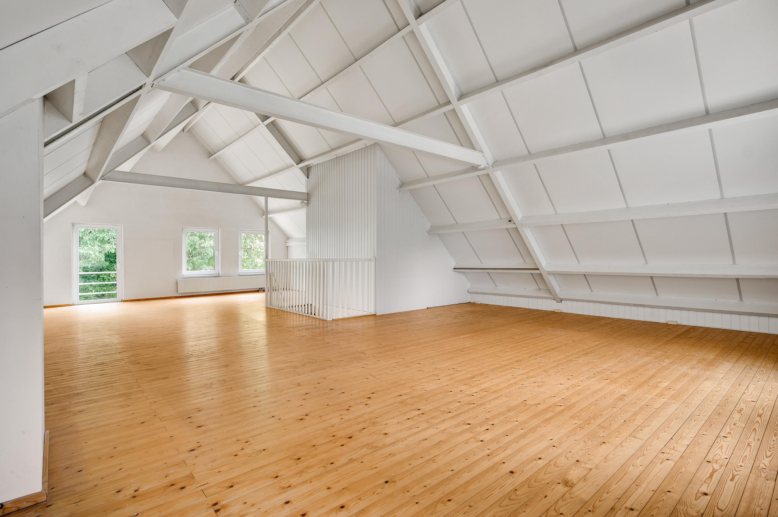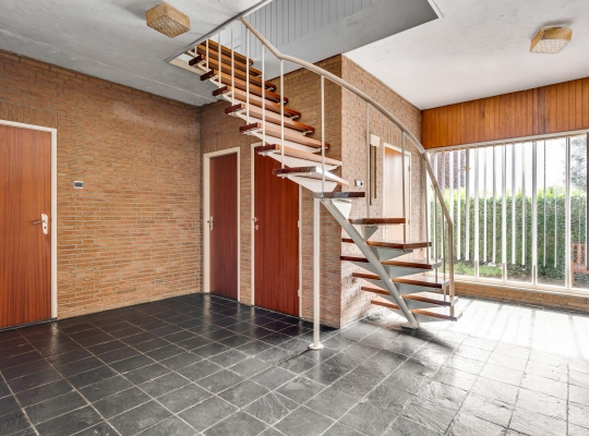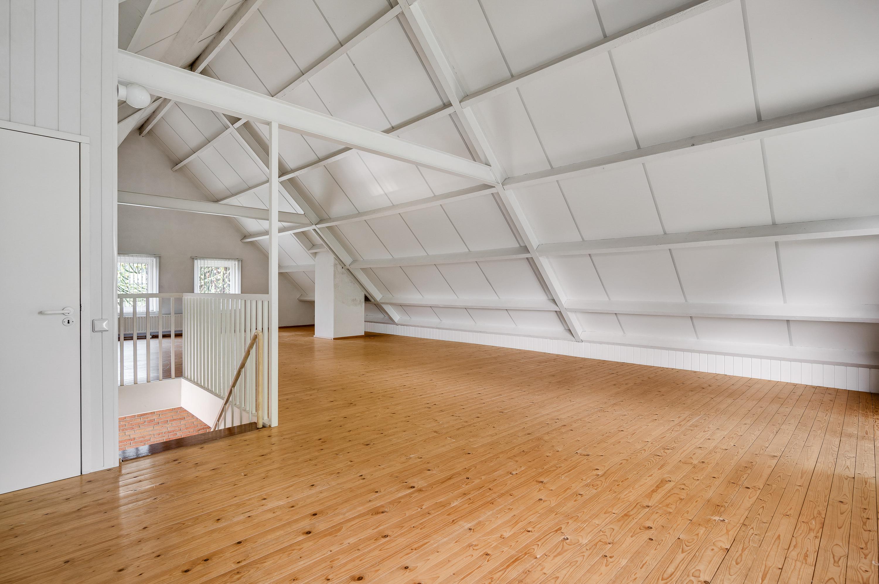 Via de trap in de hal bereikt u de eerste verdieping, waar een grote ruimte van circa 12,92 x 9,13 meter op een nieuwe invulling wacht. Aan de voor- en achterzijde zijn ramen in de buitengevel geplaatst, en de nokhoogte van circa 5 meter maakt het realiseren van een zolder of een extra verdieping mogelijk. Het dak is geïsoleerd (unidek), verwarming is aanwezig en er ligt een houten vloer op deze verdieping.
