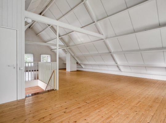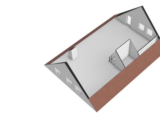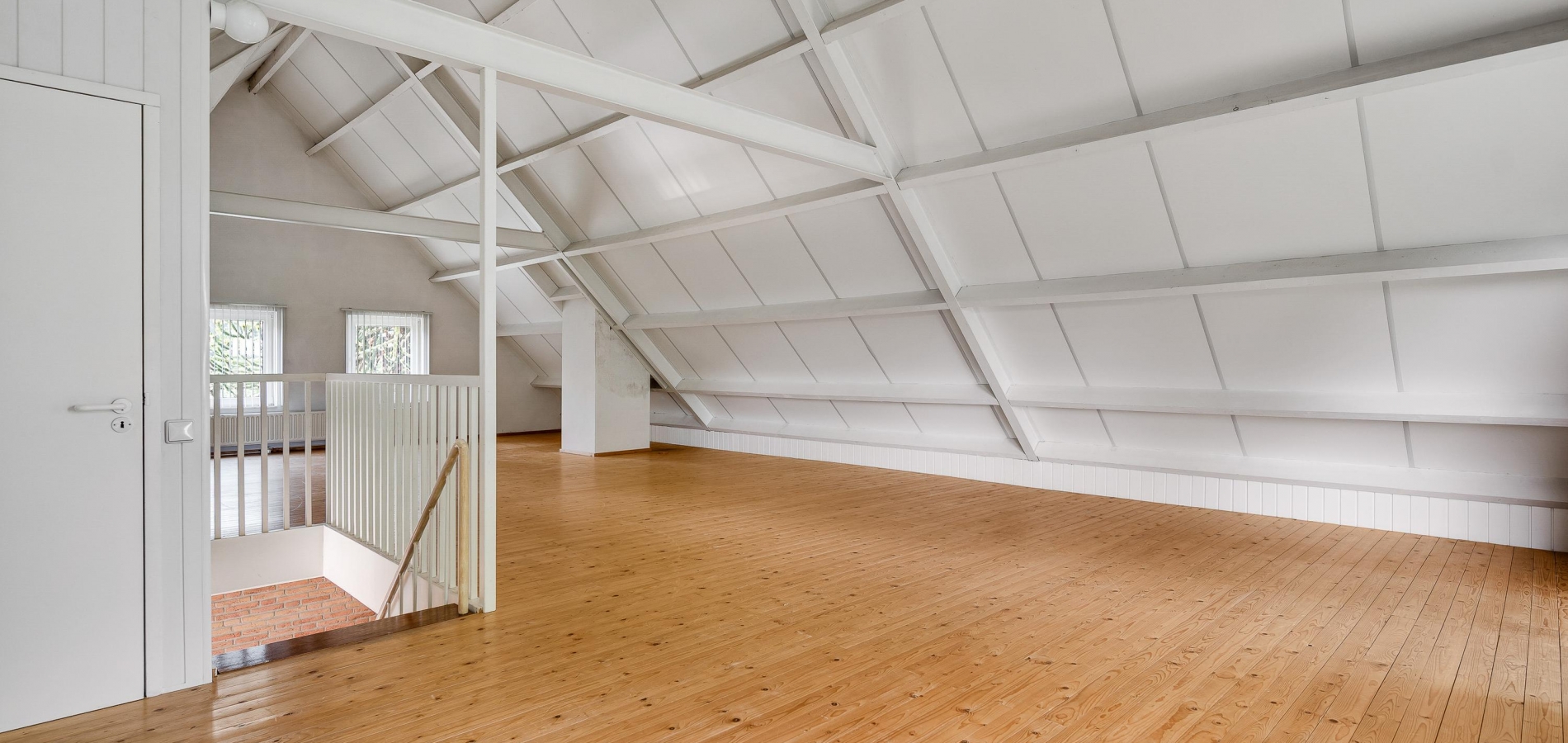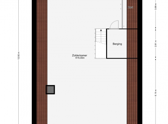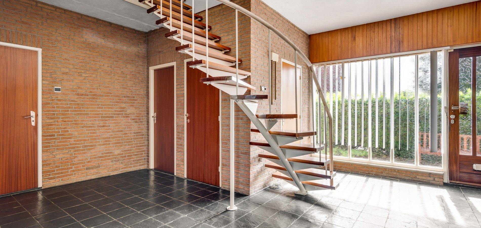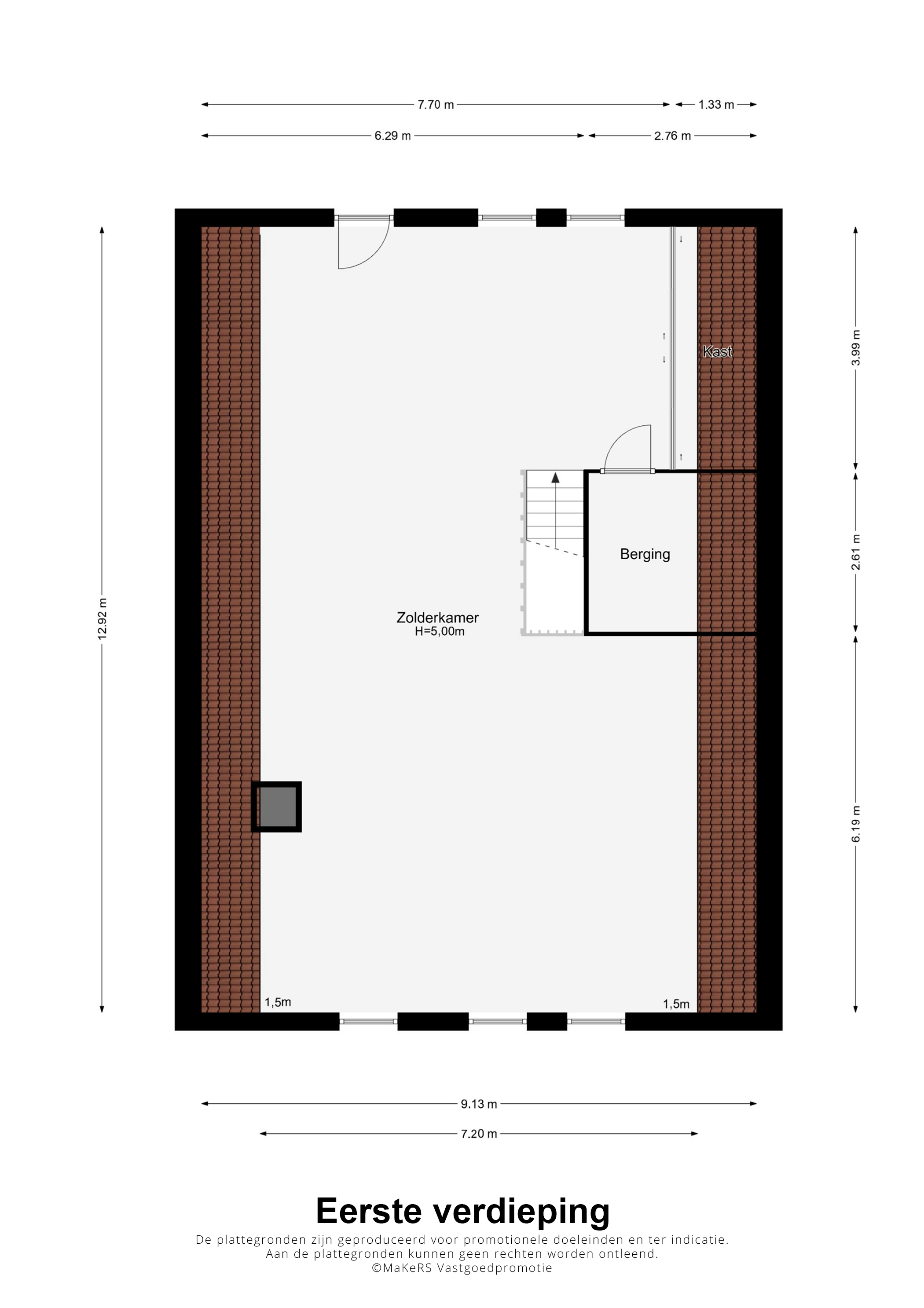 Via de trap in de hal bereikt u de eerste verdieping, waar een grote ruimte van circa 12,92 x 9,13 meter op een nieuwe invulling wacht. Aan de voor- en achterzijde zijn ramen in de buitengevel geplaatst, en de nokhoogte van circa 5 meter maakt het realiseren van een zolder of een extra verdieping mogelijk. Het dak is geïsoleerd (unidek), verwarming is aanwezig en er ligt een houten vloer op deze verdieping.