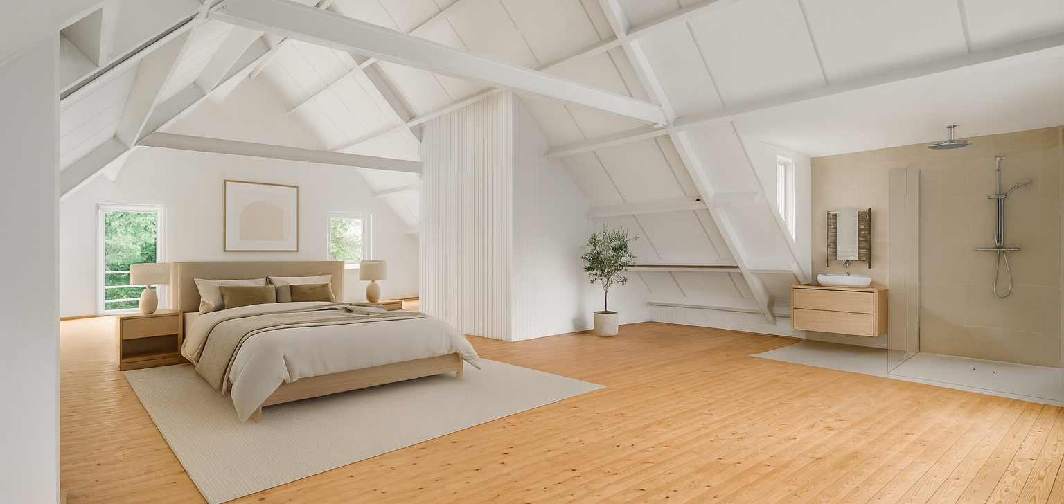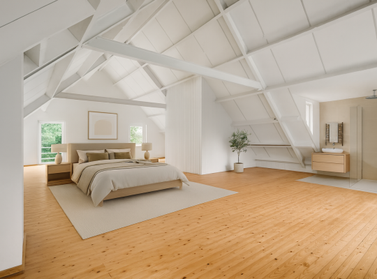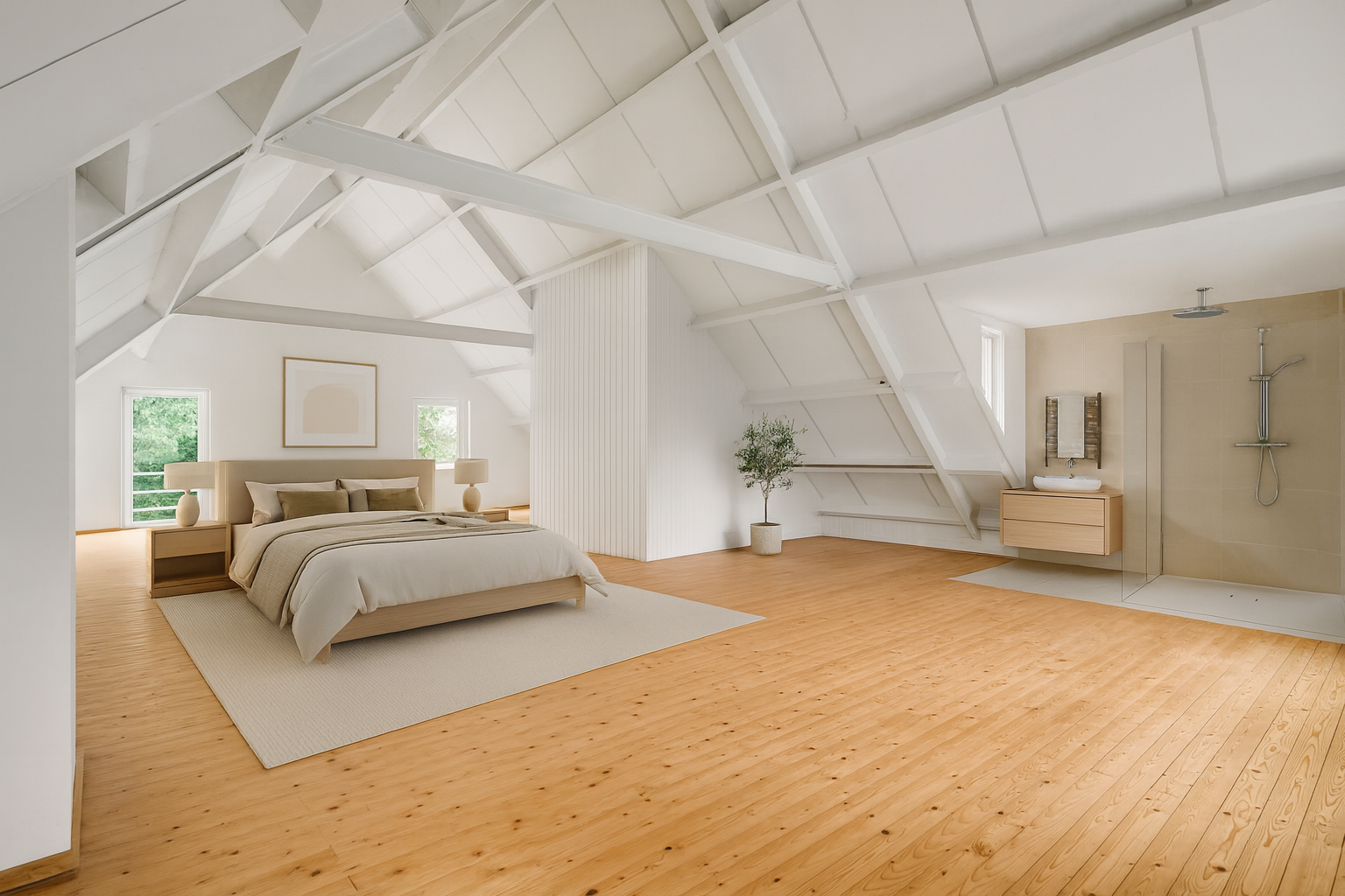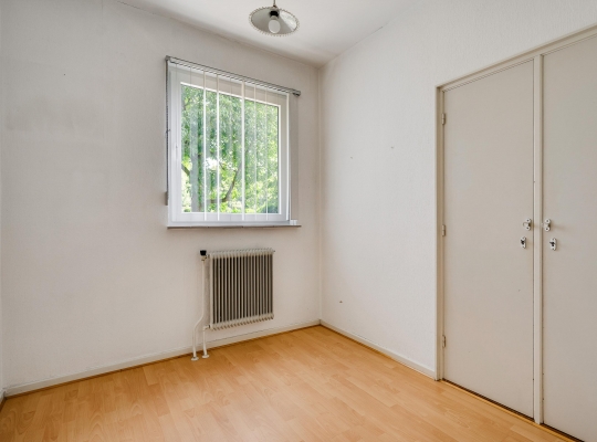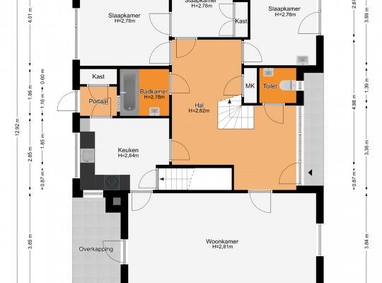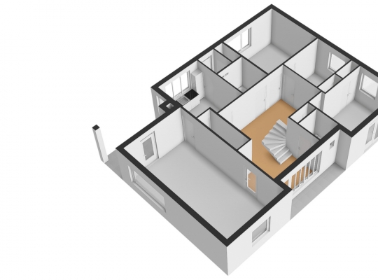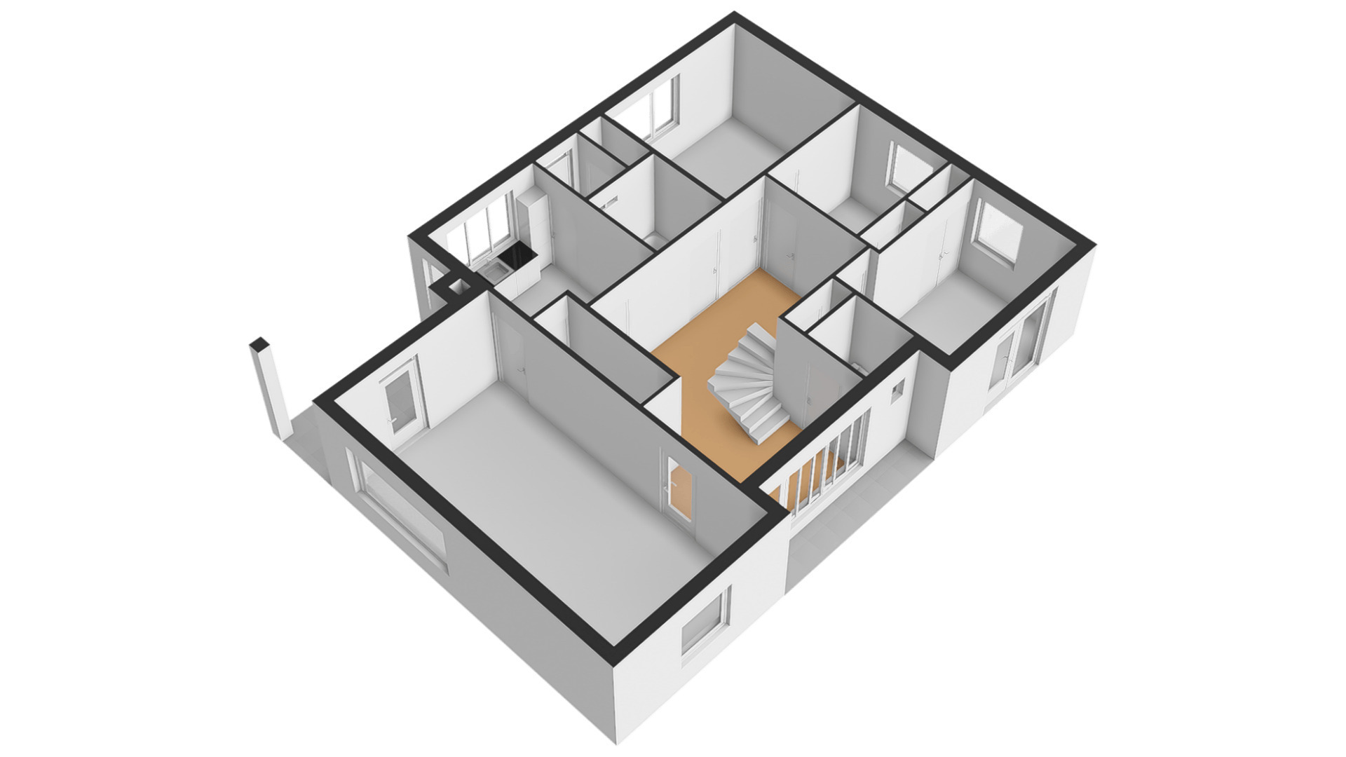 Via de trap in de hal bereikt u de eerste verdieping, waar een grote ruimte van circa 12,92 x 9,13 meter op een nieuwe invulling wacht. Aan de voor- en achterzijde zijn ramen in de buitengevel geplaatst, en de nokhoogte van circa 5 meter maakt het realiseren van een zolder of een extra verdieping mogelijk. Het dak is geïsoleerd (unidek), verwarming is aanwezig en er ligt een houten vloer op deze verdieping.