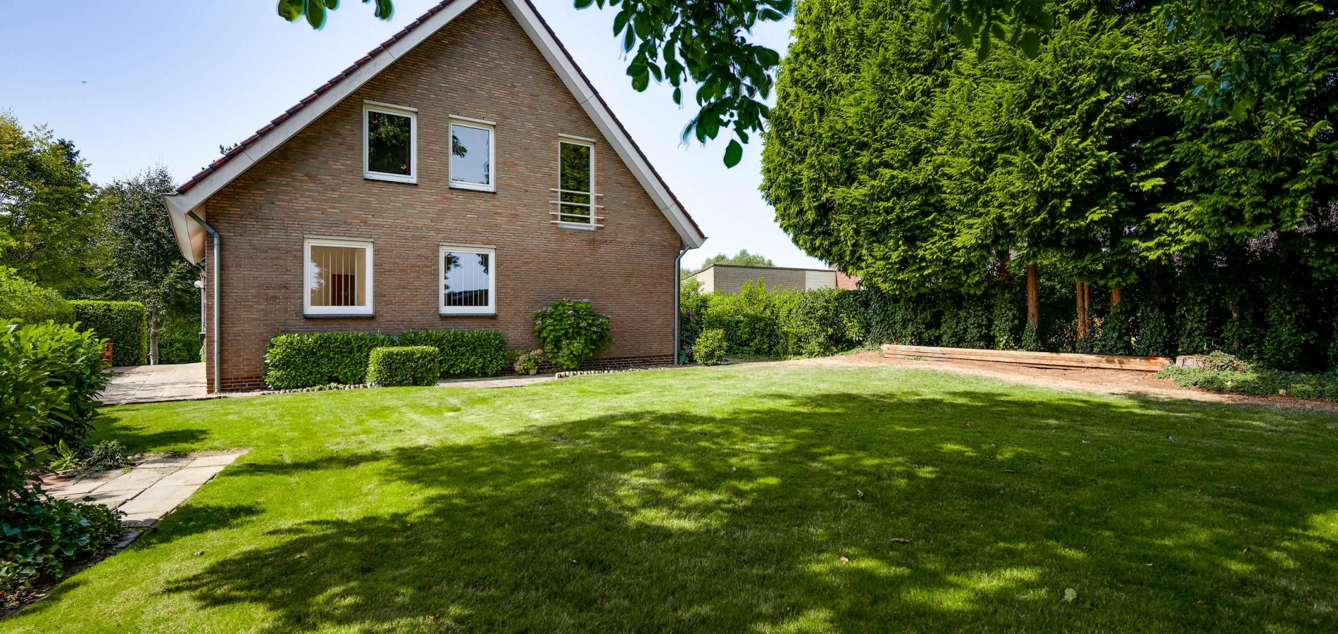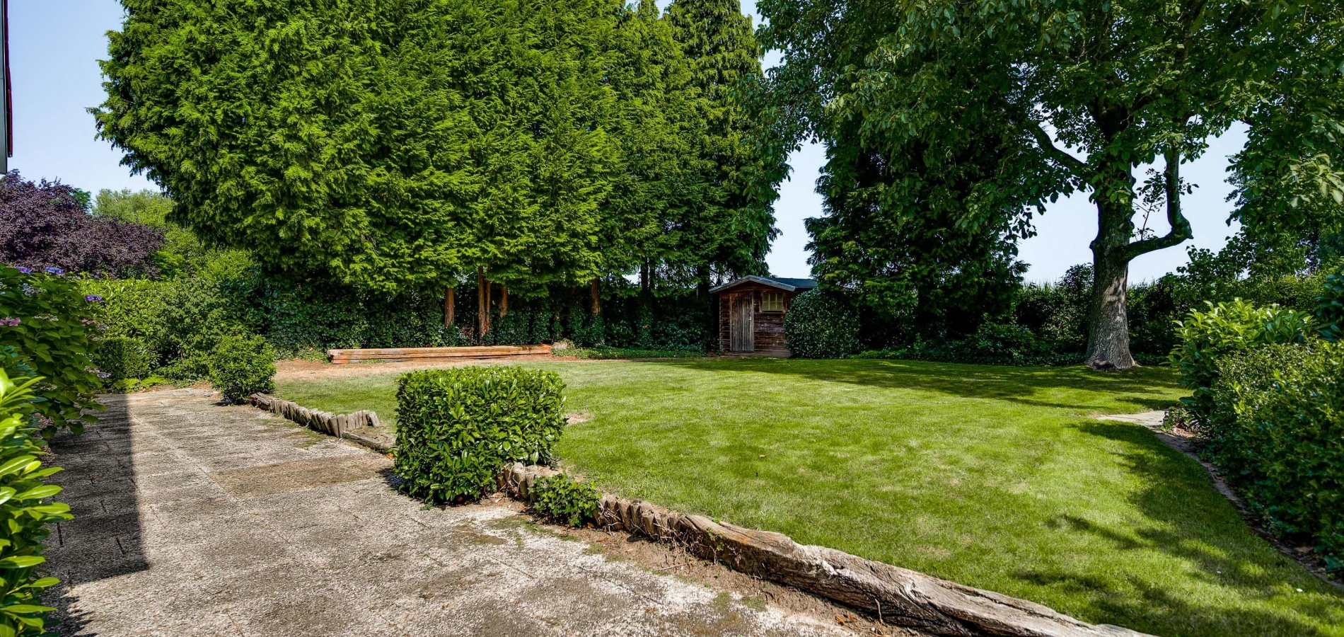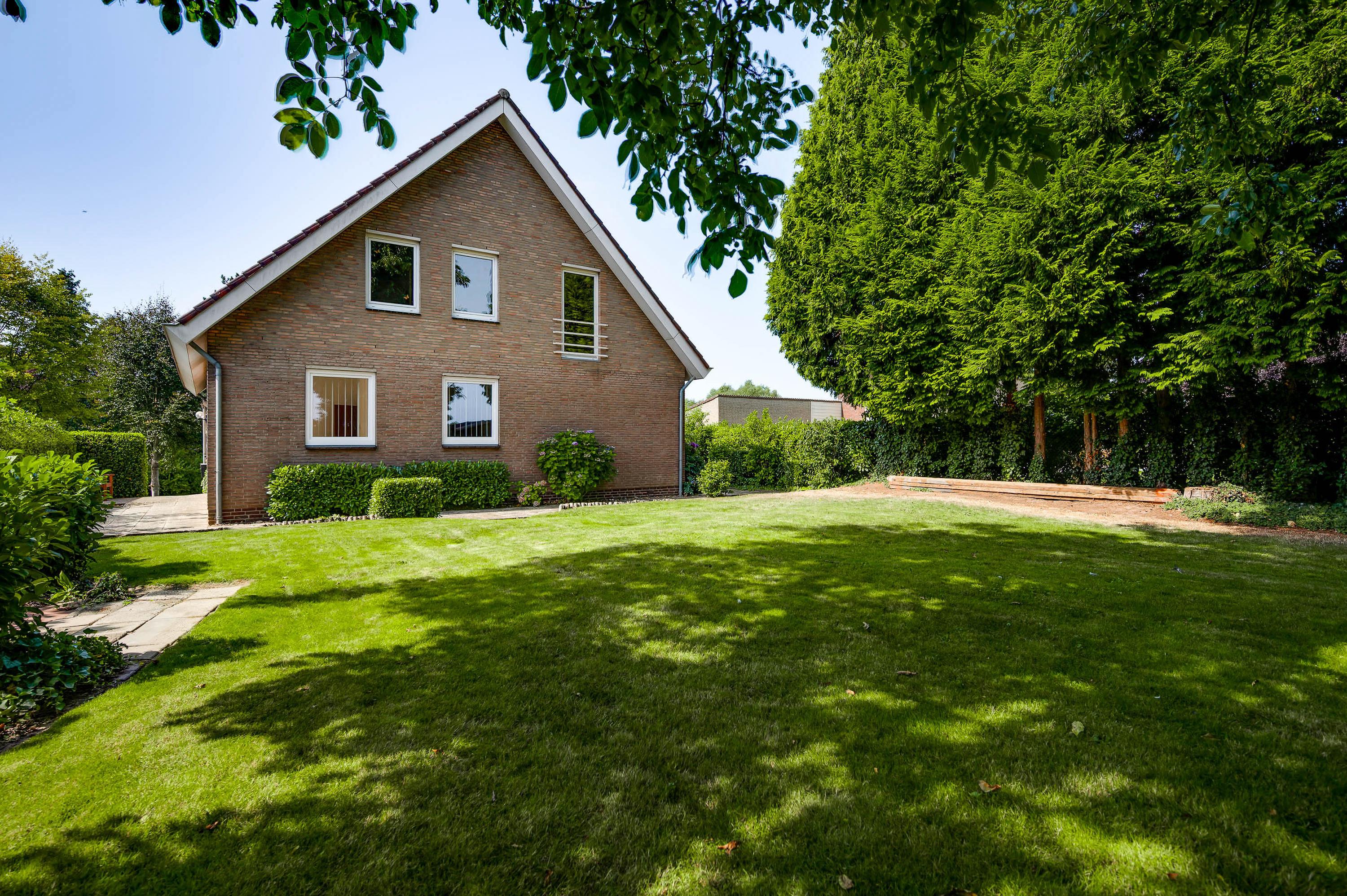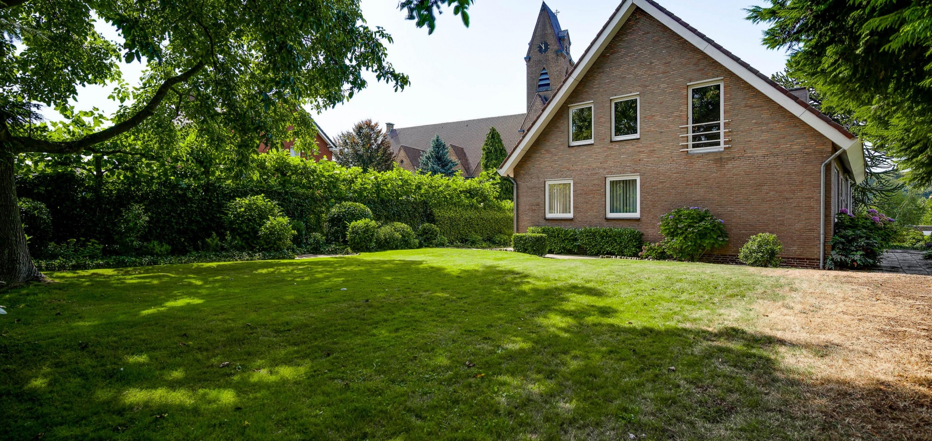 Rondom de woning is de royale tuin, met veel groen en privacy. De achtertuin, met een groot gazon en mooie bomen, grenst aan een akker. Het terras bij de entree biedt eveneens een fijne plek om buiten te zitten, met uitzicht naar de kerktoren. Bij de hellende tuin is de oprit, met parkeergelegenheid voor meerdere auto’s.