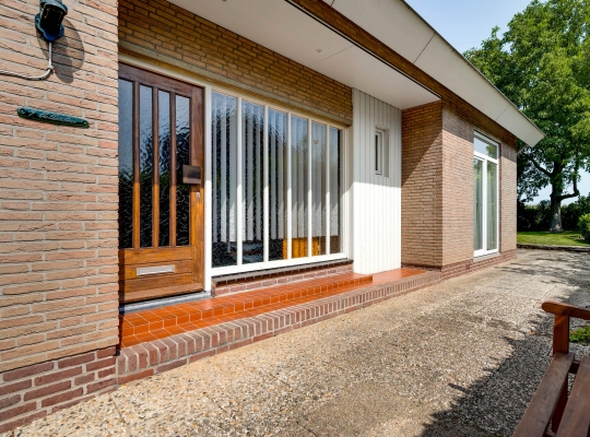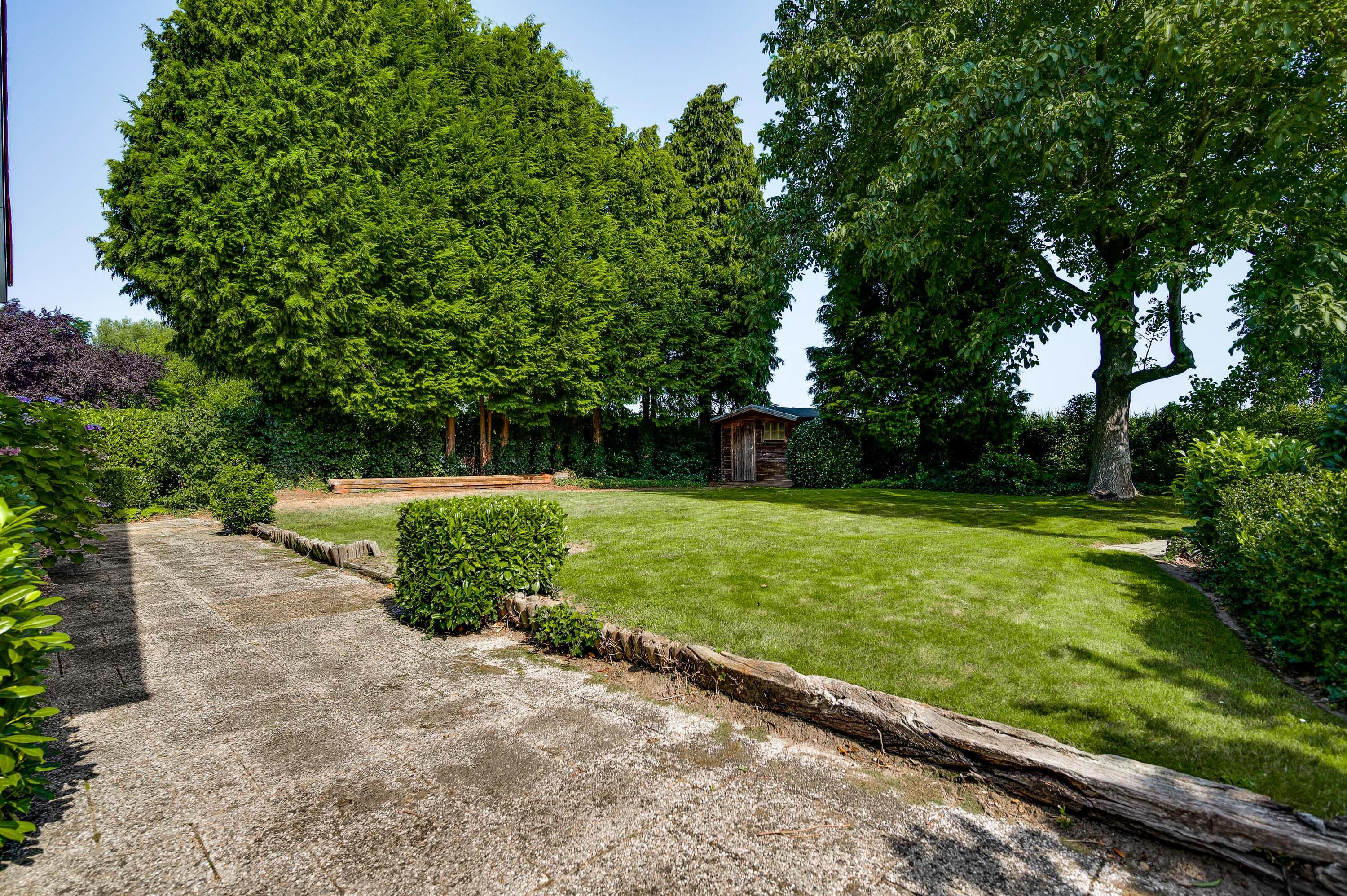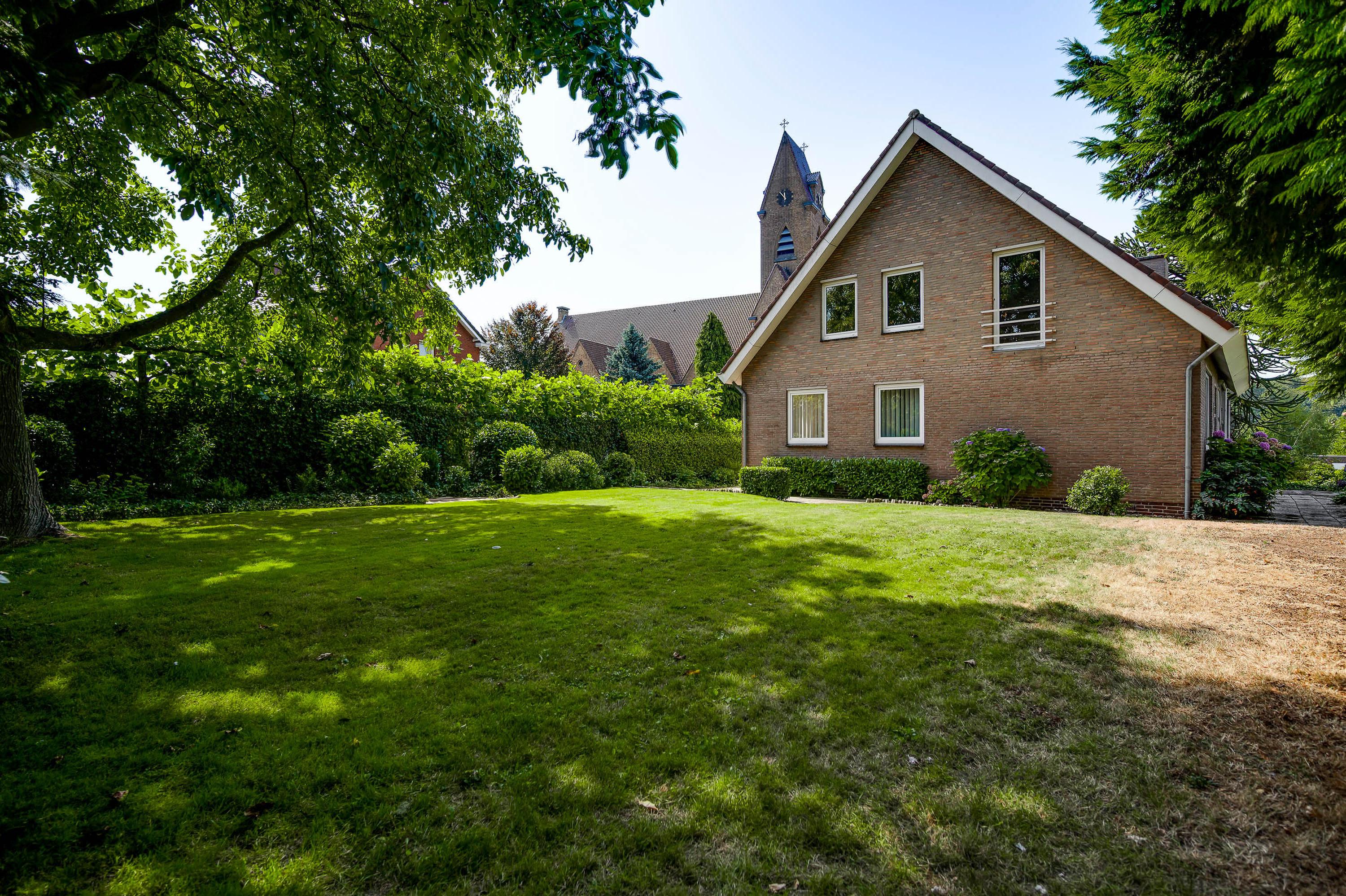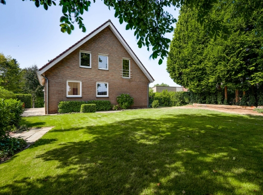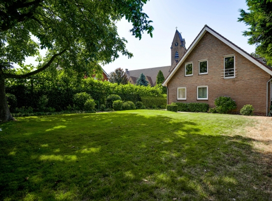 Rondom de woning is de royale tuin, met veel groen en privacy. De achtertuin, met een groot gazon en mooie bomen, grenst aan een akker. Het terras bij de entree biedt eveneens een fijne plek om buiten te zitten, met uitzicht naar de kerktoren. Bij de hellende tuin is de oprit, met parkeergelegenheid voor meerdere auto’s.