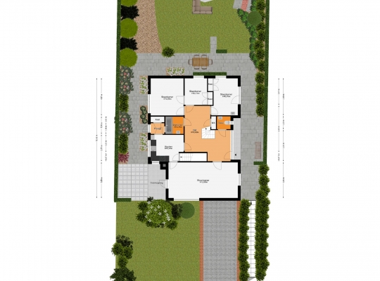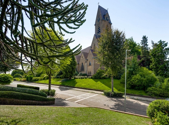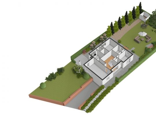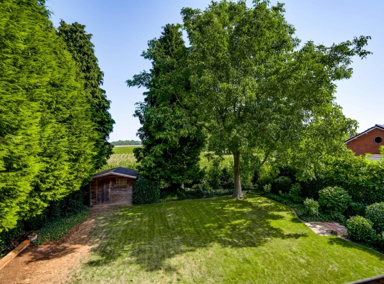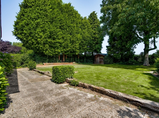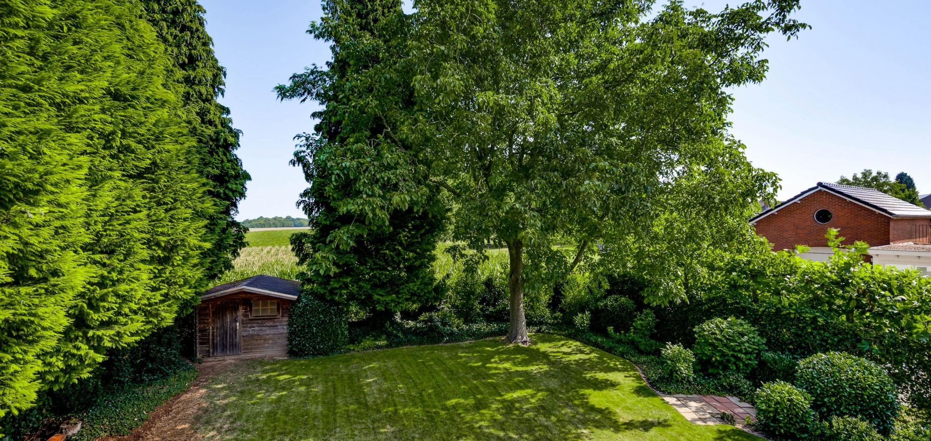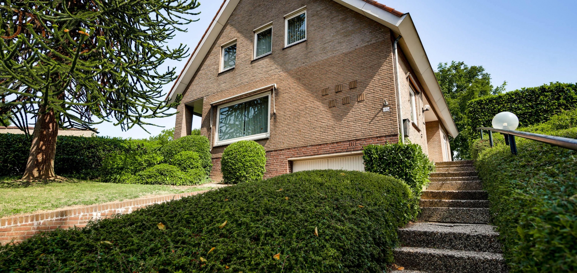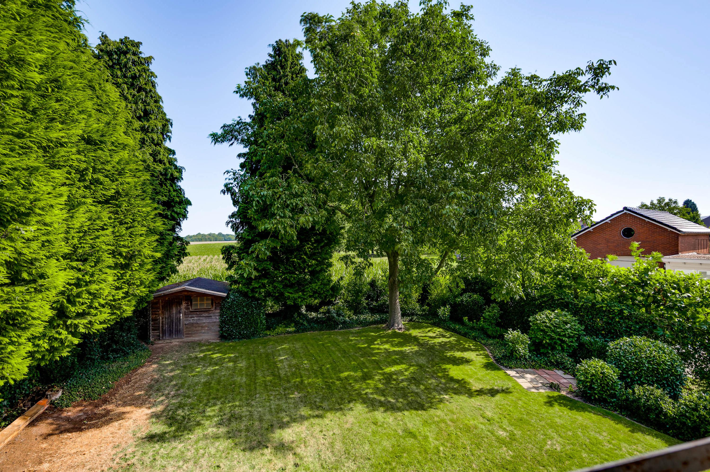 Rondom de woning is de royale tuin, met veel groen en privacy. De achtertuin, met een groot gazon en mooie bomen, grenst aan een akker. Het terras bij de entree biedt eveneens een fijne plek om buiten te zitten, met uitzicht naar de kerktoren. Bij de hellende tuin is de oprit, met parkeergelegenheid voor meerdere auto’s.