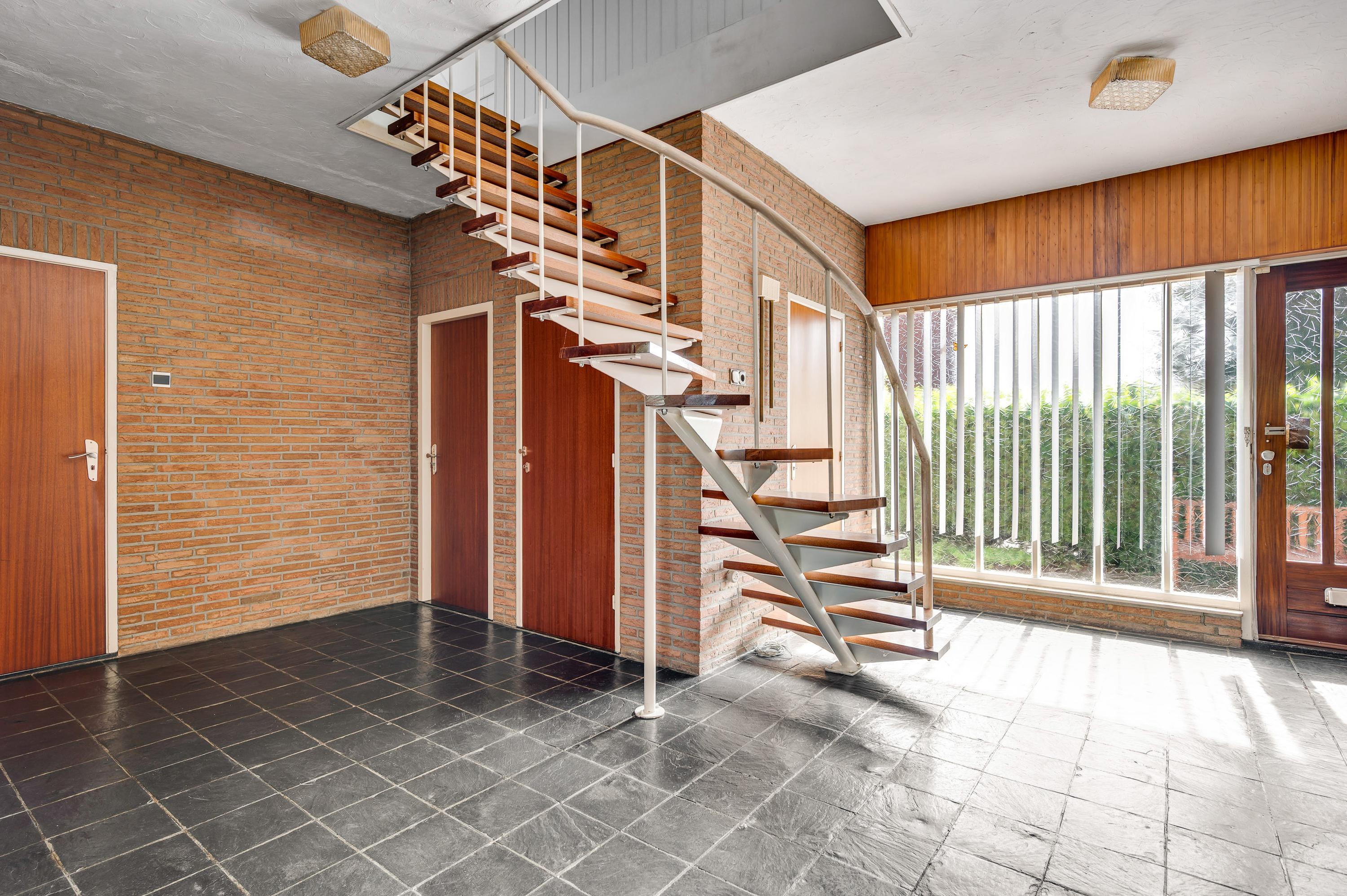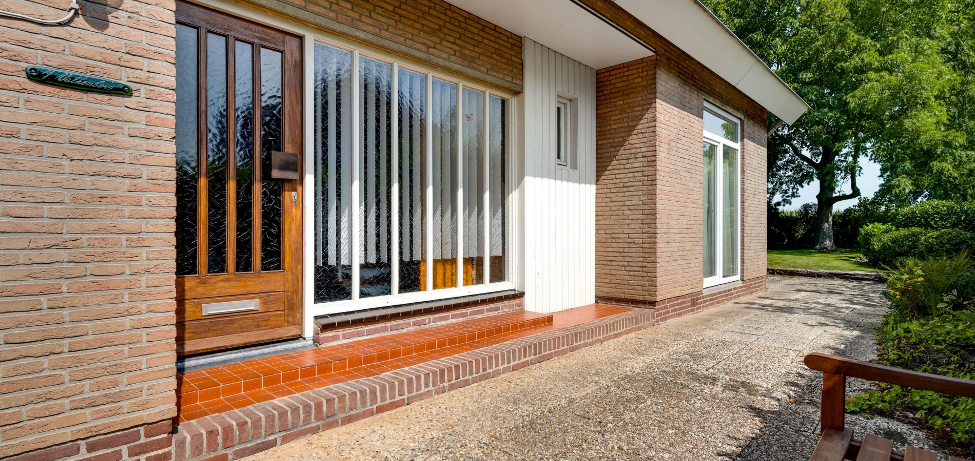 Aan de rechterzijde is de overdekte entree van deze zeer ruime en verrassend ingedeelde woning. In de royale hal ligt een donkere vloer van natuursteen, en ziet u de trap naar de eerste verdieping. Bij de trap zijn twee deuren, naar de toiletruimte met fonteintje en de meterkast.