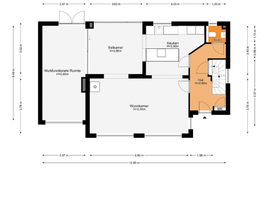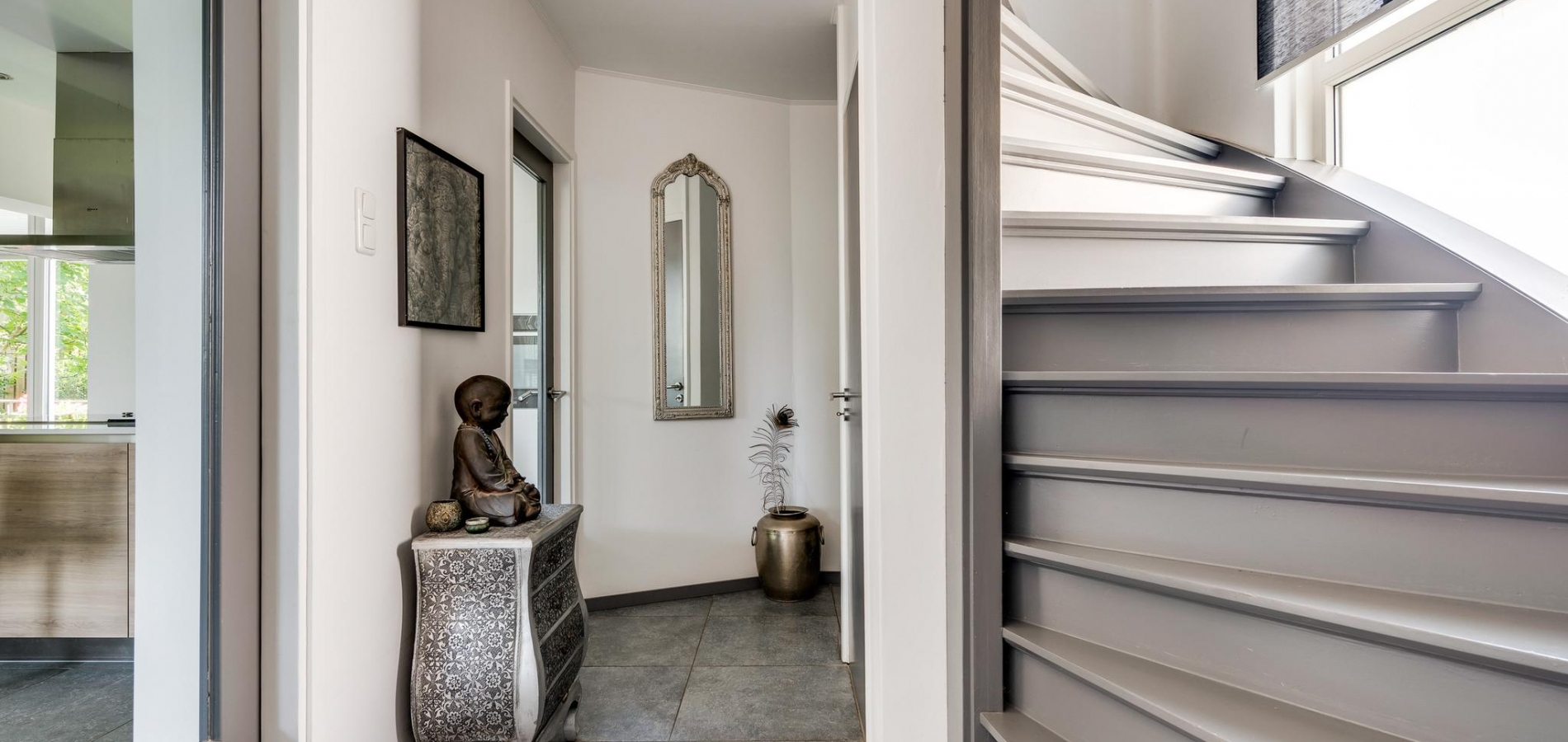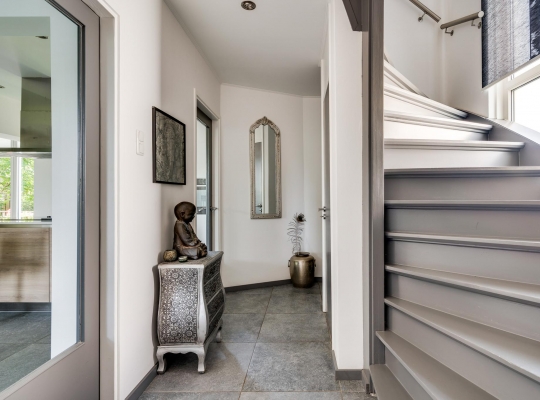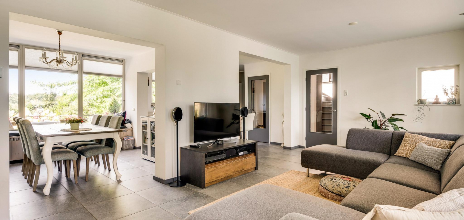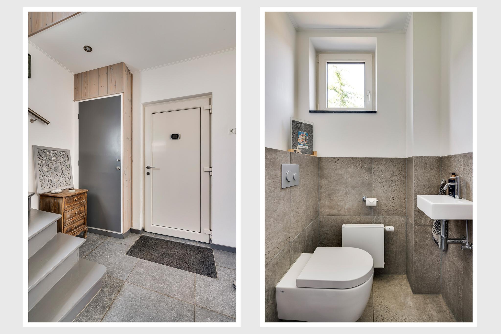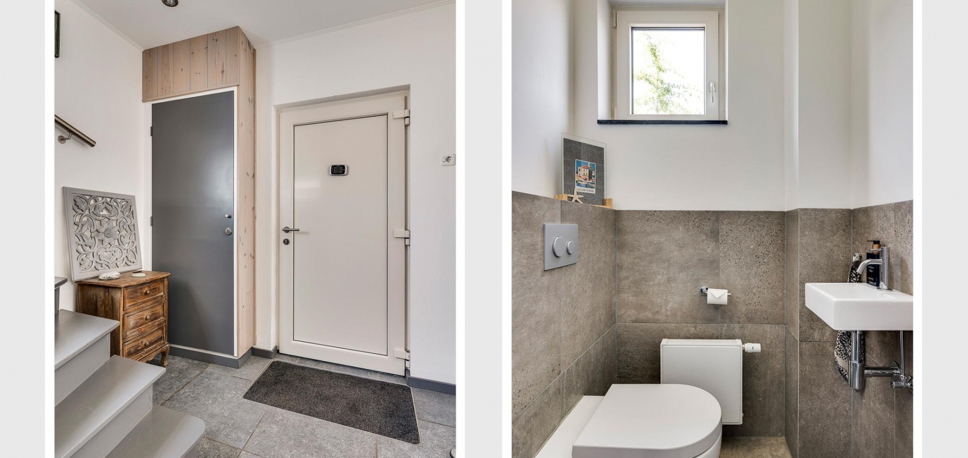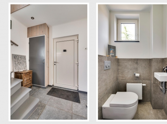 Via een mooie, royale opgang met ruime treden loopt u vanaf de parkeerplaats / oprit (voor minimaal 4 auto’s) naar de overdekte entree van dit zeer ruime woonhuis. De ruime hal (ca. 4,57 x 2,48) is een fraaie ontvangstruimte waarin zich de meterkast, de trapopgang en de trap naar het souterrain bevinden. De kleur van het schilderwerk, de tegelvloer/muur en de muren zijn op elkaar afgestemd. Aan het einde van de hal is de moderne toiletruimte, ingedeeld met een wandcloset en een fonteintje. Aan de voorzijde is de fraaie woonkamer (ca. 6,80 x 3,78), die in halfopen verbinding staat met de keuken (ca. 3,40 x 4,03/2,93) en een fraaie eetkamer (ca. 3,63 x 3,52) met vrij uitzicht over de tuin, akker, boomgaarden. De totale oppervlakte is ca. 50 m2, met fraai lichtinval aan de voor- en achterzijde. In de woonkamer staat een stijlvolle, vrijstaande pelletkachel en de eetkamer biedt ruimte aan een grote 6-persoons tafel.