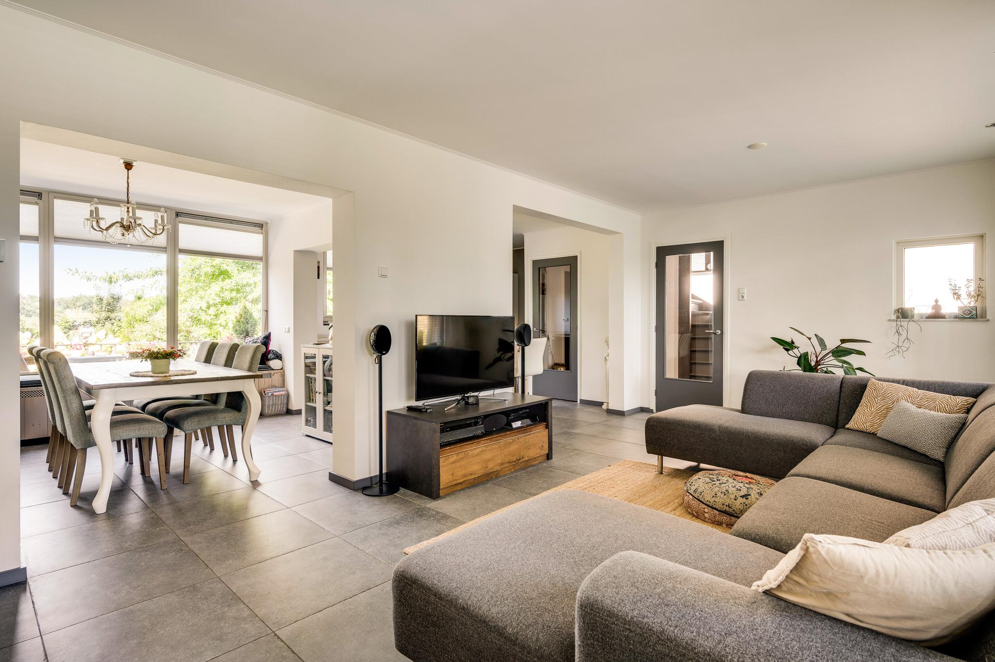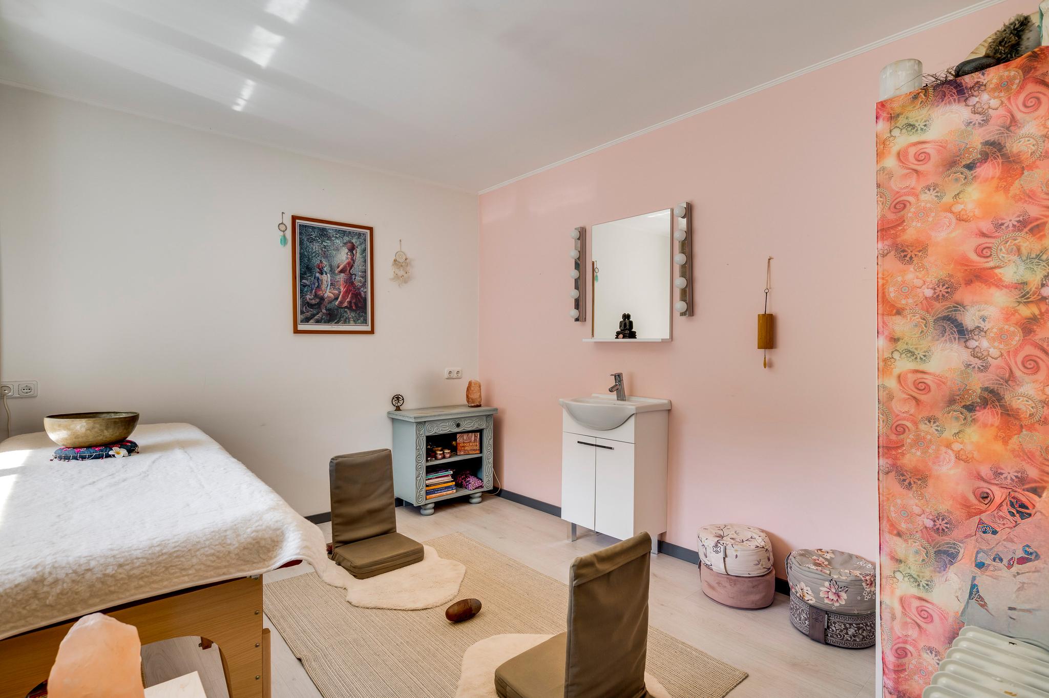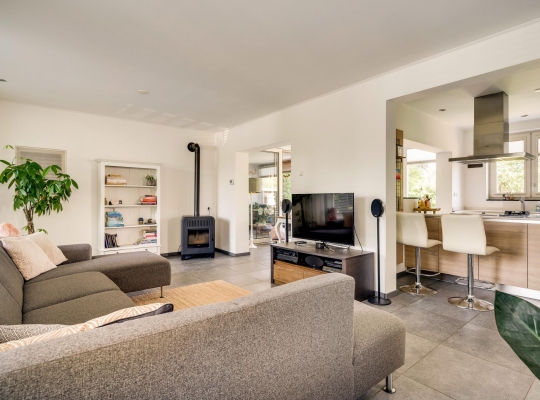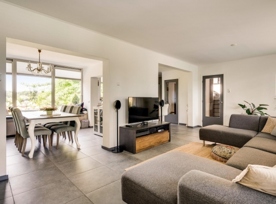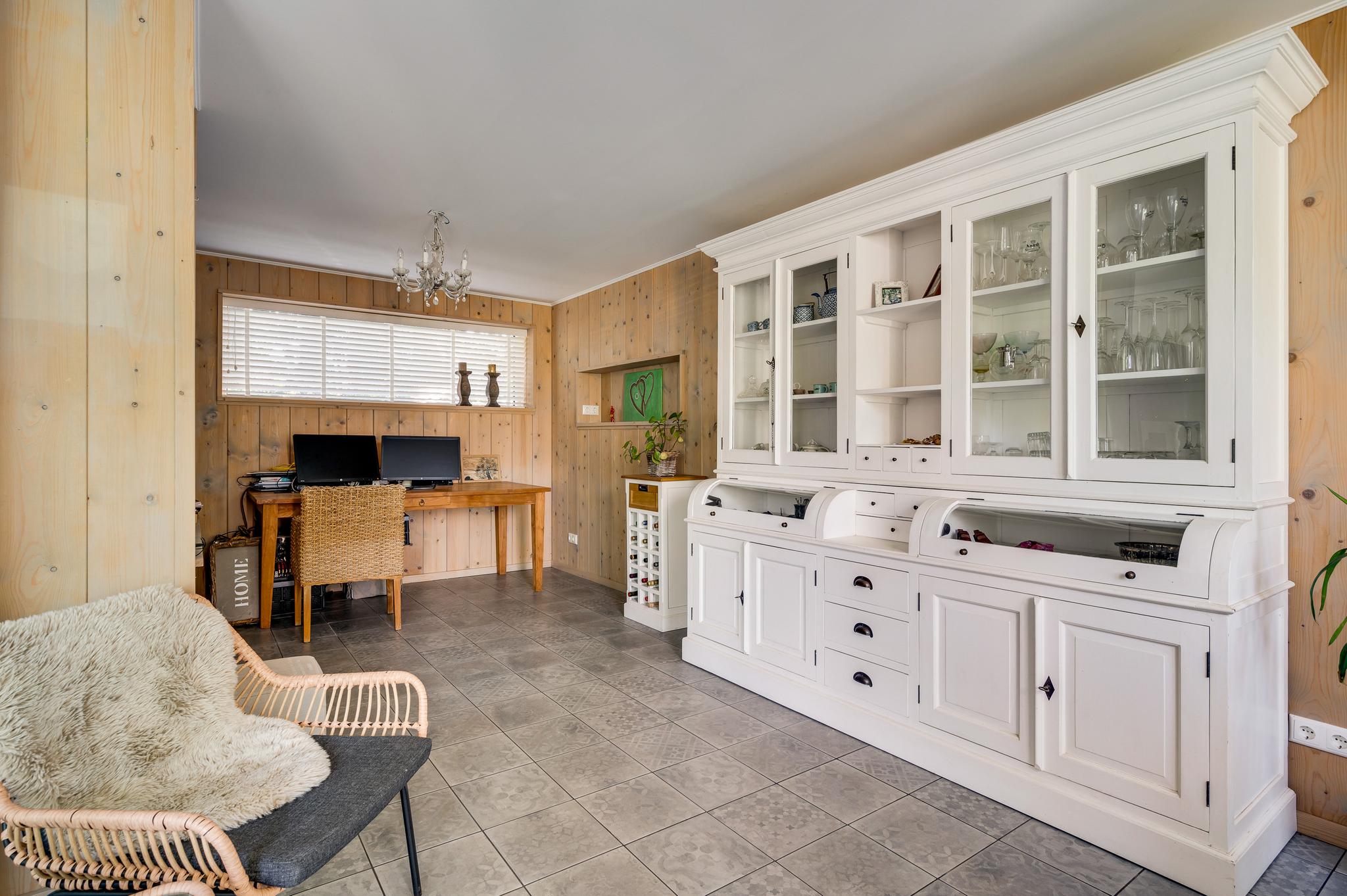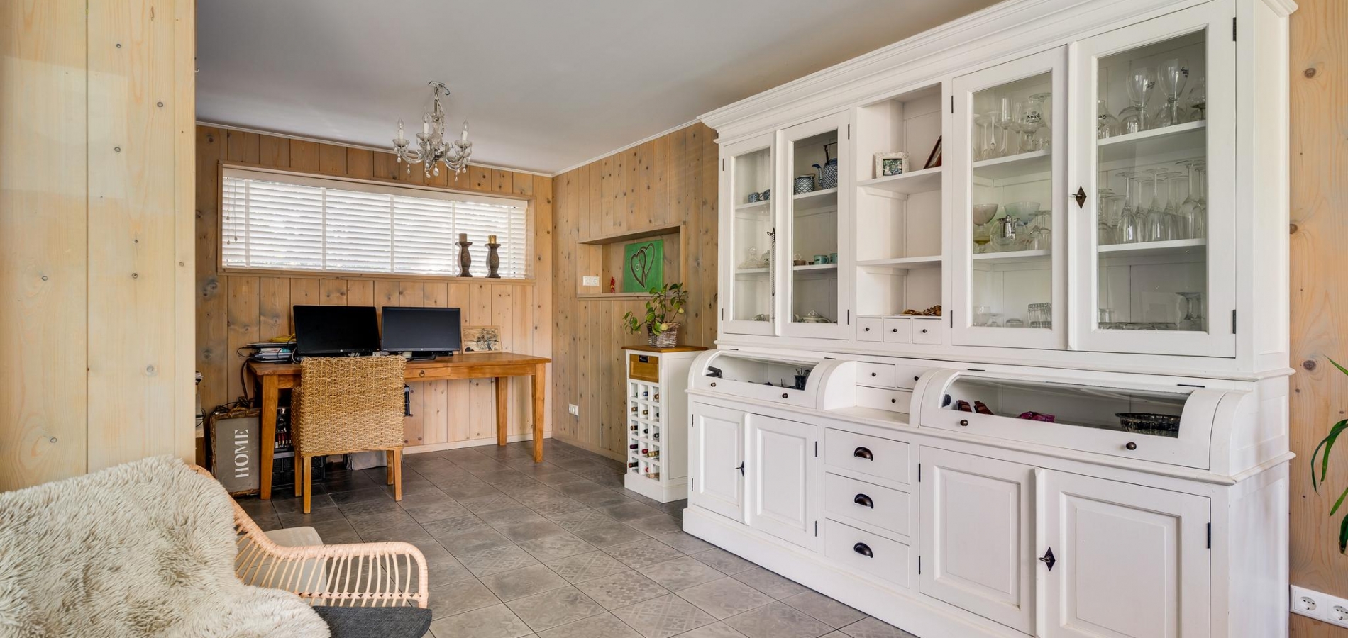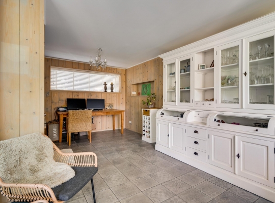 Een grote schuifpui verbindt de eetkamer met een grote, tuinkamer/multifunctionele ruimte (ca. 6,49 x 2,97) die te gebruiken is als studeer-, media- en hobbyruimte. Hier liggen grijze tegels met fraai patroon op de vloer en de muren zijn afgewerkt met hout, wat zorgt voor een ruimte met sfeer.
