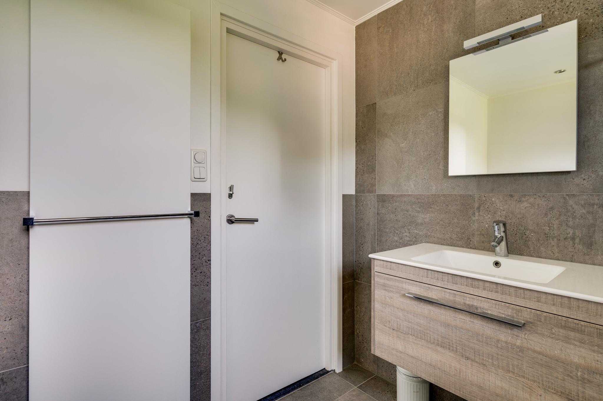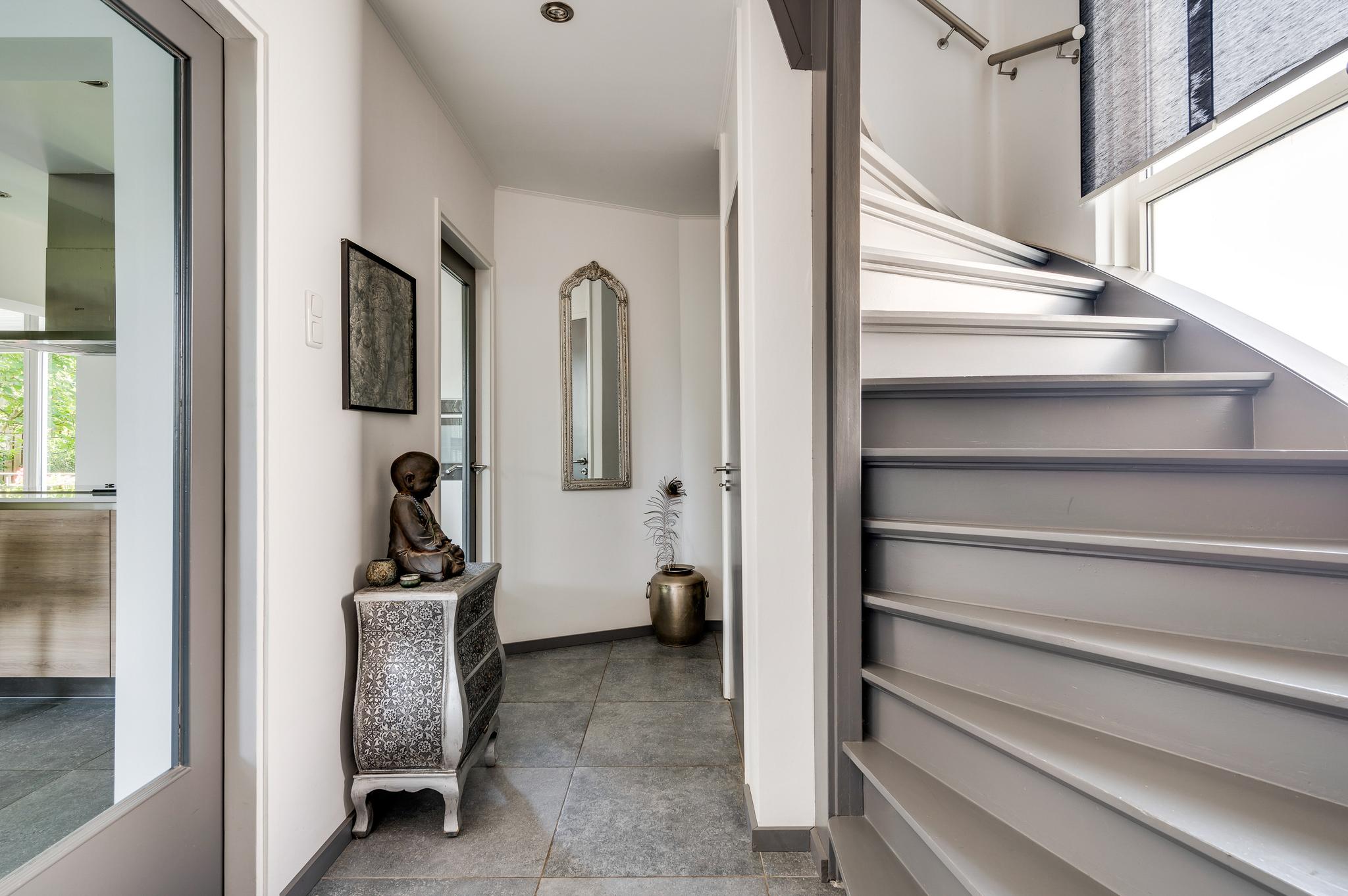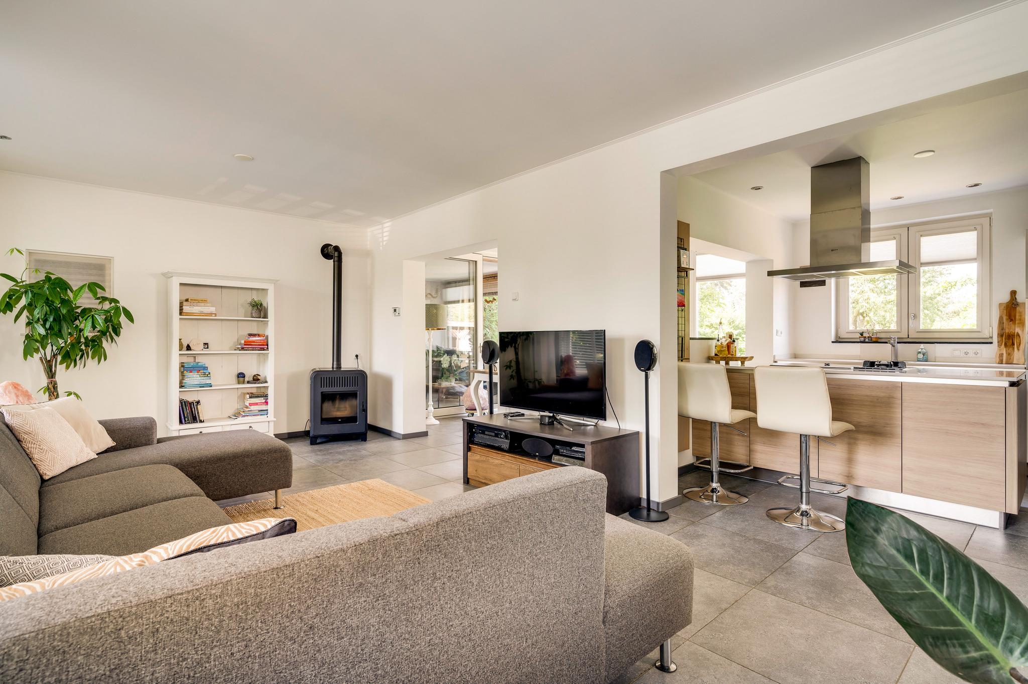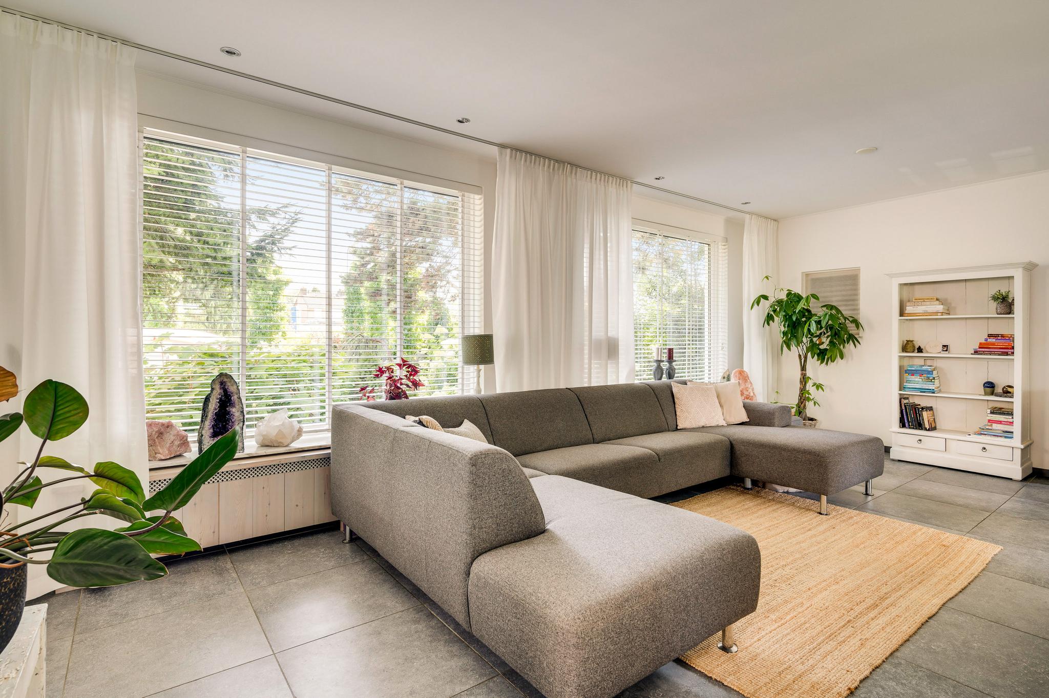 Een grote schuifpui verbindt de eetkamer met een grote, tuinkamer/multifunctionele ruimte (ca. 6,49 x 2,97) die te gebruiken is als studeer-, media- en hobbyruimte. Hier liggen grijze tegels met fraai patroon op de vloer en de muren zijn afgewerkt met hout, wat zorgt voor een ruimte met sfeer.