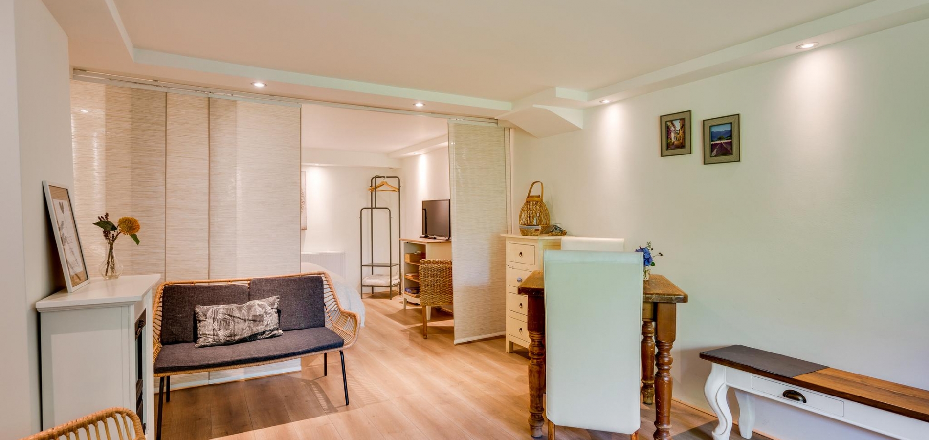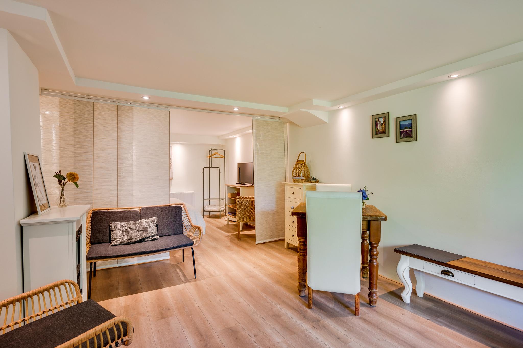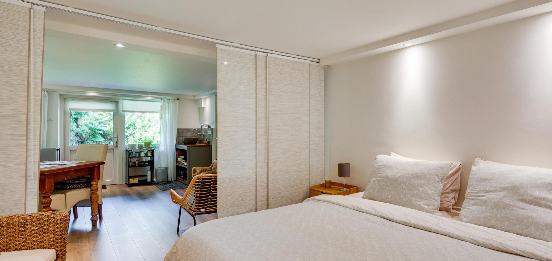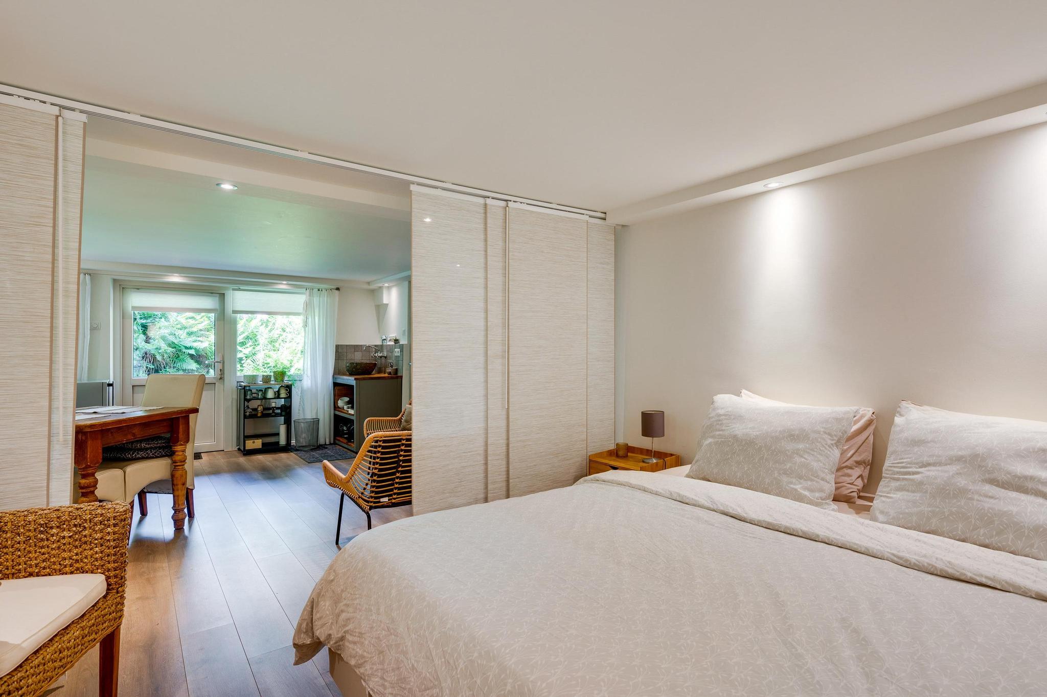 Een grote schuifpui verbindt de eetkamer met een grote, tuinkamer/multifunctionele ruimte (ca. 6,49 x 2,97) die te gebruiken is als studeer-, media- en hobbyruimte. Hier liggen grijze tegels met fraai patroon op de vloer en de muren zijn afgewerkt met hout, wat zorgt voor een ruimte met sfeer.