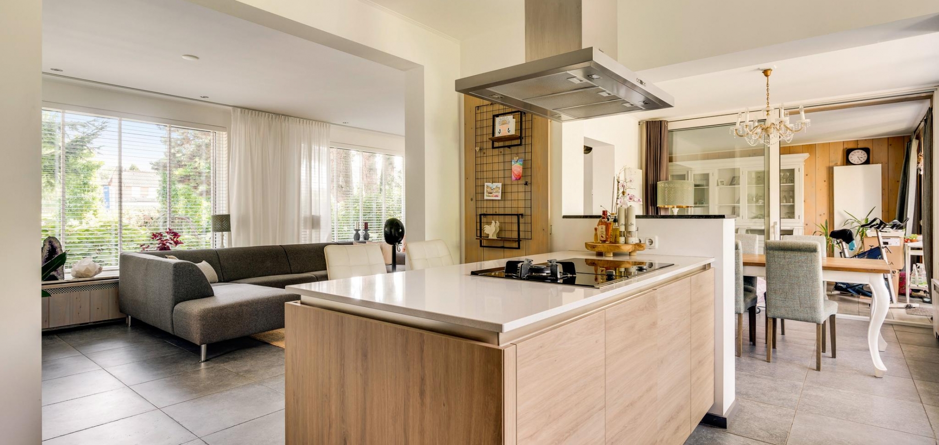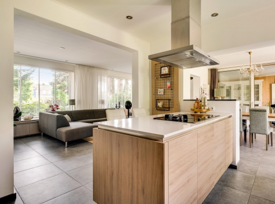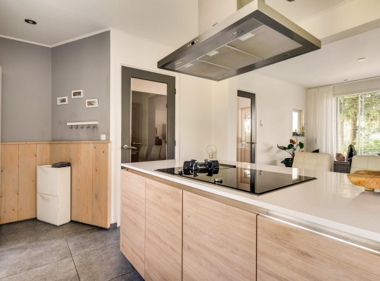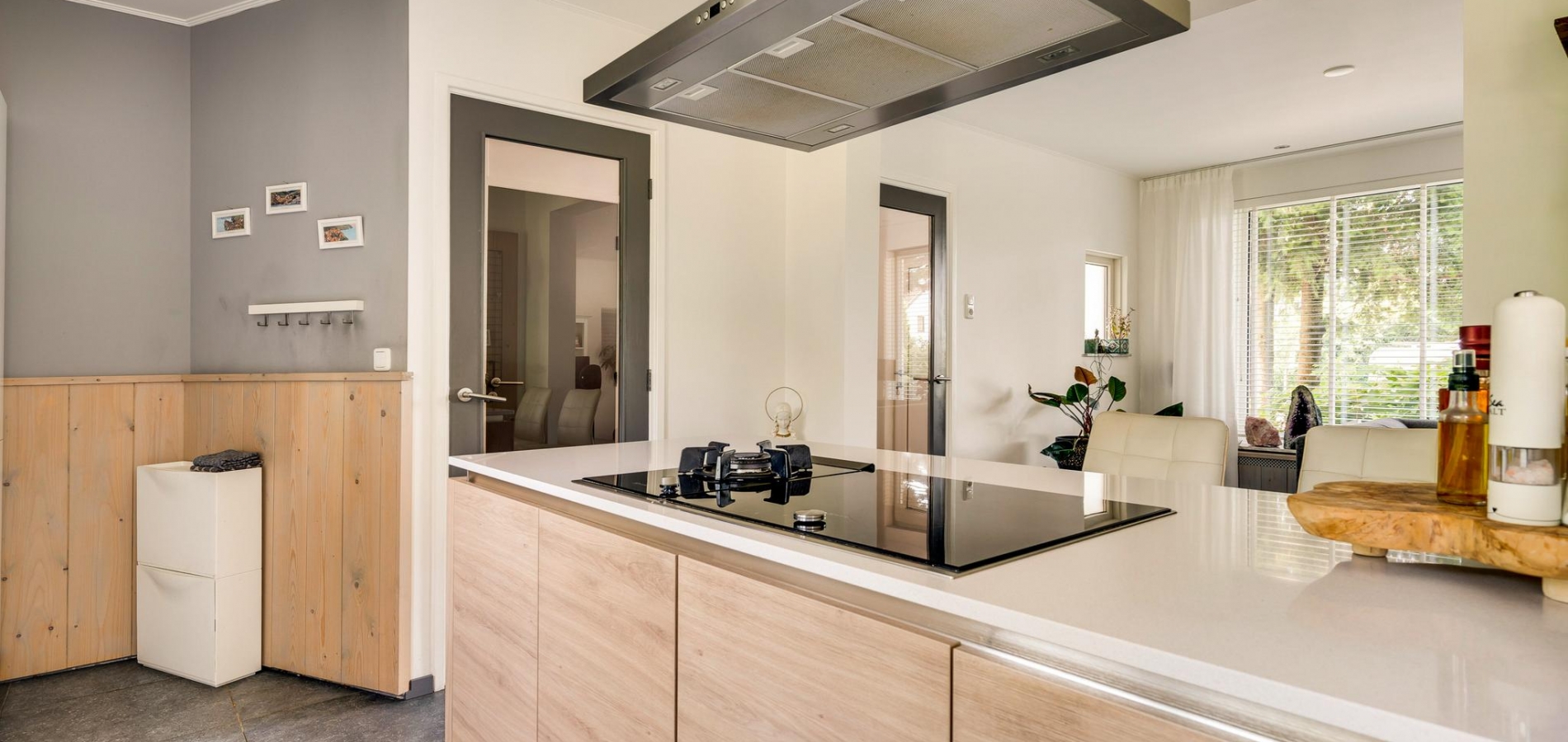 De keuken met kookeiland is royaal opgesteld en voor kookliefhebbers een fantastische plek. De grote keukenkasten bieden veel bergruimte en uitgevoerd in deels lichte houtlook en deels wit. Dit is afgestemd op de aanrechtbladen van wit gemêleerde composiet. Alle benodigde apparatuur is ingebouwd: een inductiekookplaat met een gas wokbrander, een afzuigkap, koelkast, vriezer, vaatwasser en een stoom/heteluchtoven.