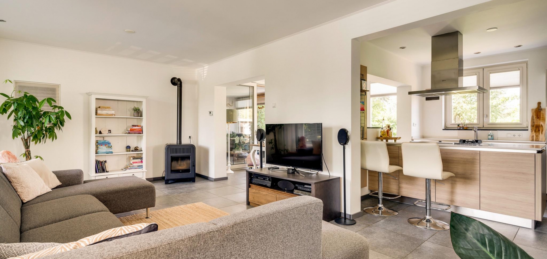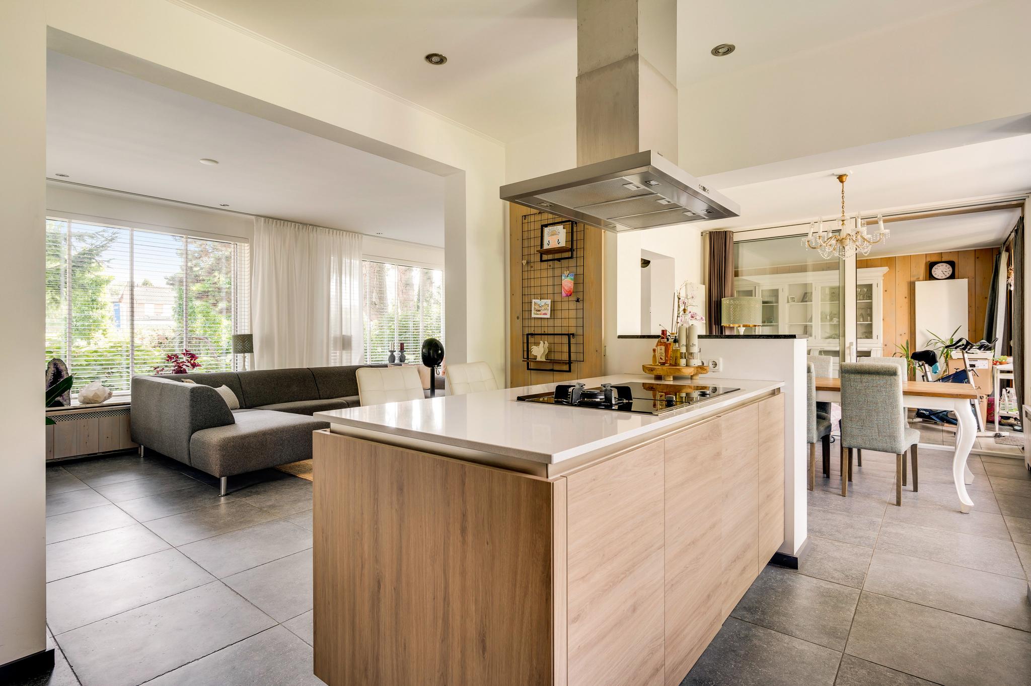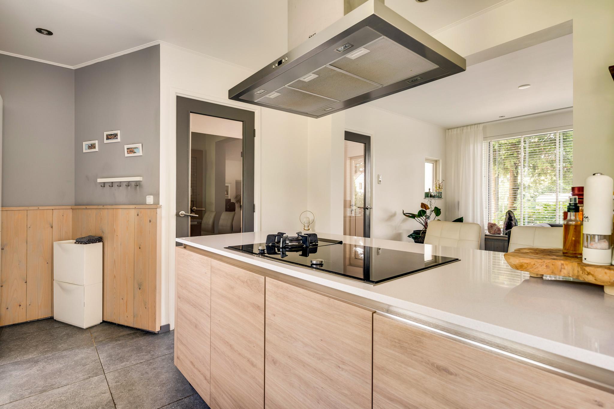 De keuken met kookeiland is royaal opgesteld en voor kookliefhebbers een fantastische plek. De grote keukenkasten bieden veel bergruimte en uitgevoerd in deels lichte houtlook en deels wit. Dit is afgestemd op de aanrechtbladen van wit gemêleerde composiet. Alle benodigde apparatuur is ingebouwd: een inductiekookplaat met een gas wokbrander, een afzuigkap, koelkast, vriezer, vaatwasser en een stoom/heteluchtoven.