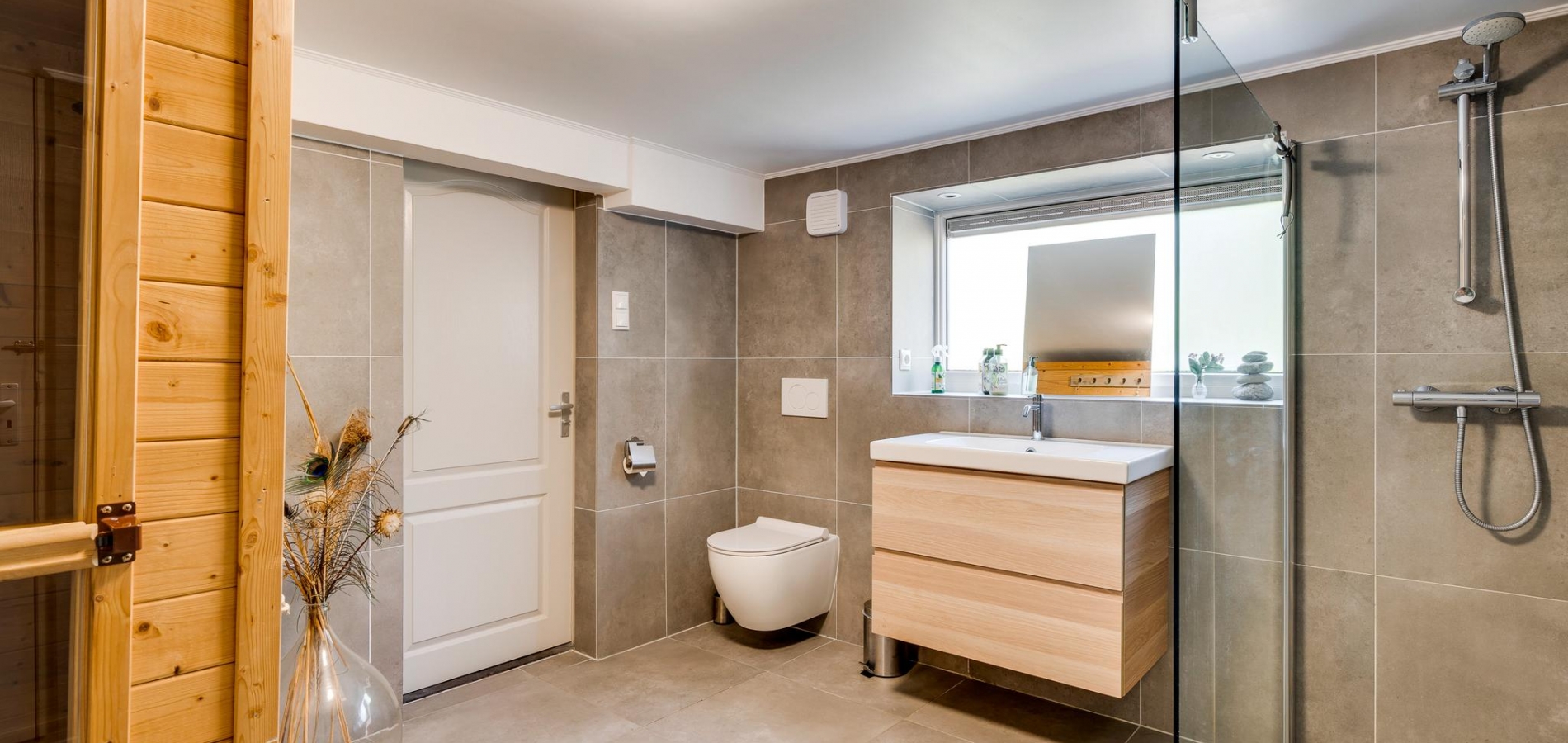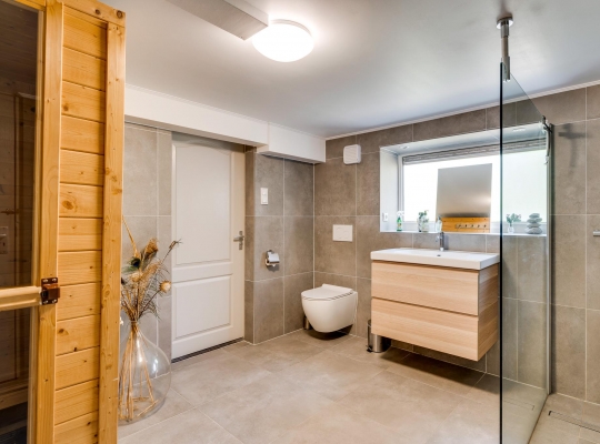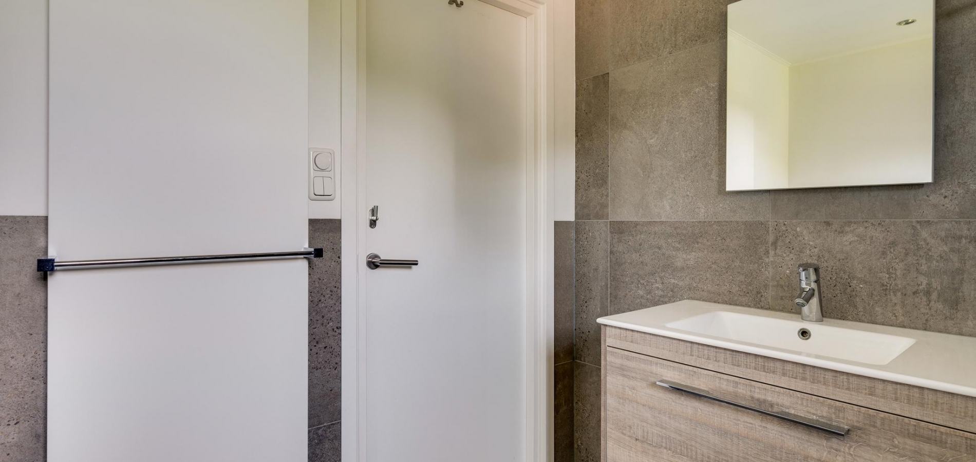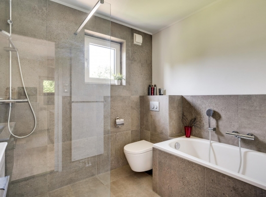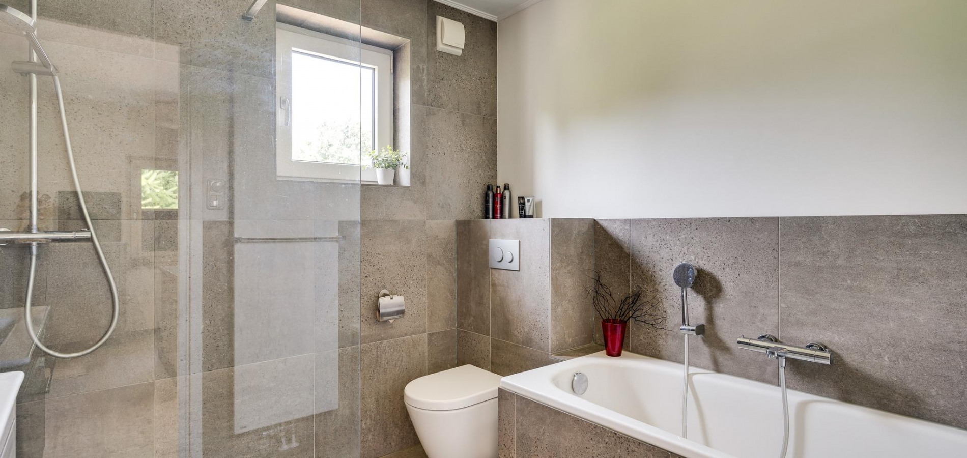Badkamer II (ca. 2,48 x 2,28) met een ligbad, inloopdouche, toilet, designradiator en wastafelmeubel biedt alle benodigde luxe een comfort. Qua stijl is deze badkamer uitgevoerd in dezelfde stijl als de badkamer in het souterrain.