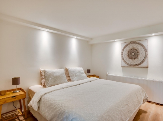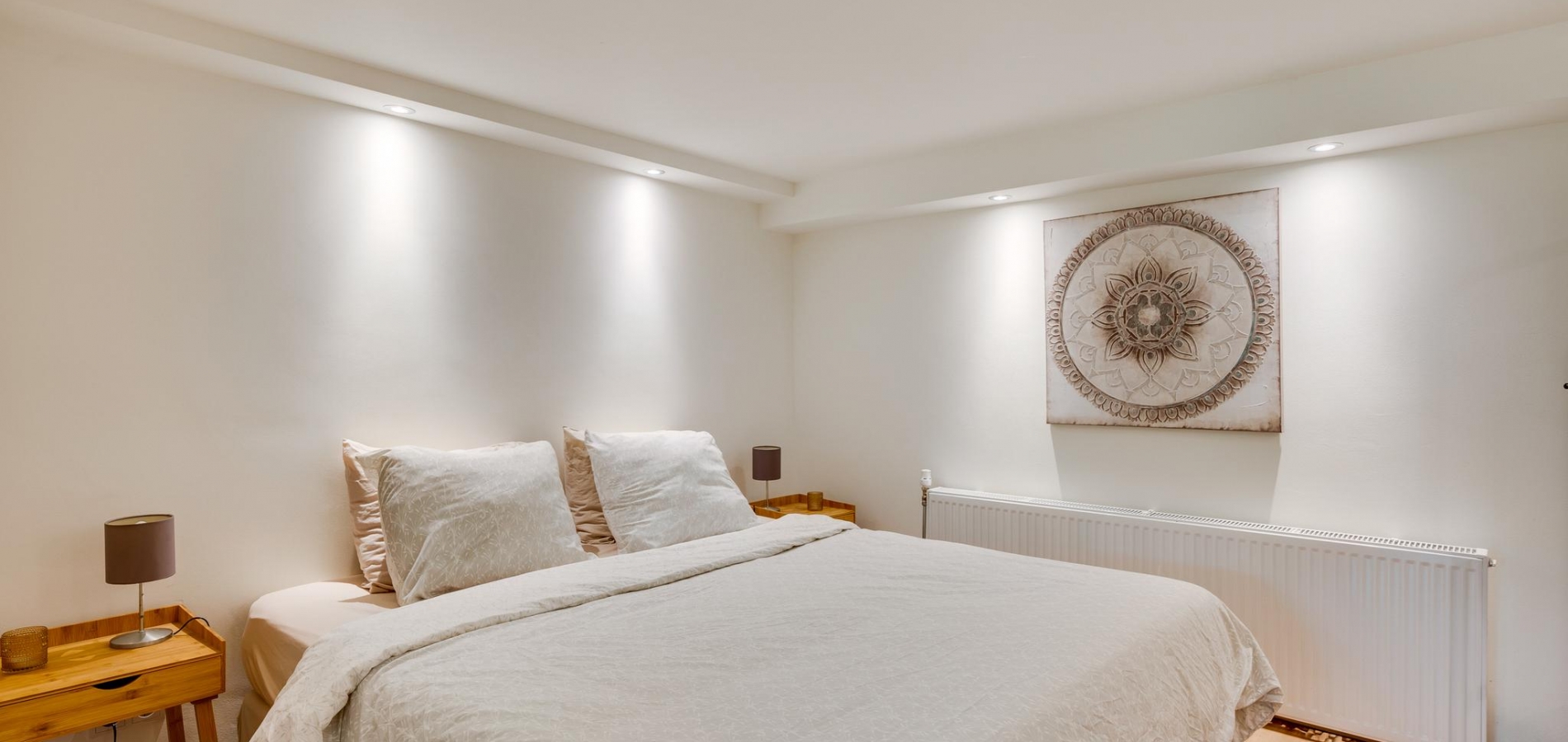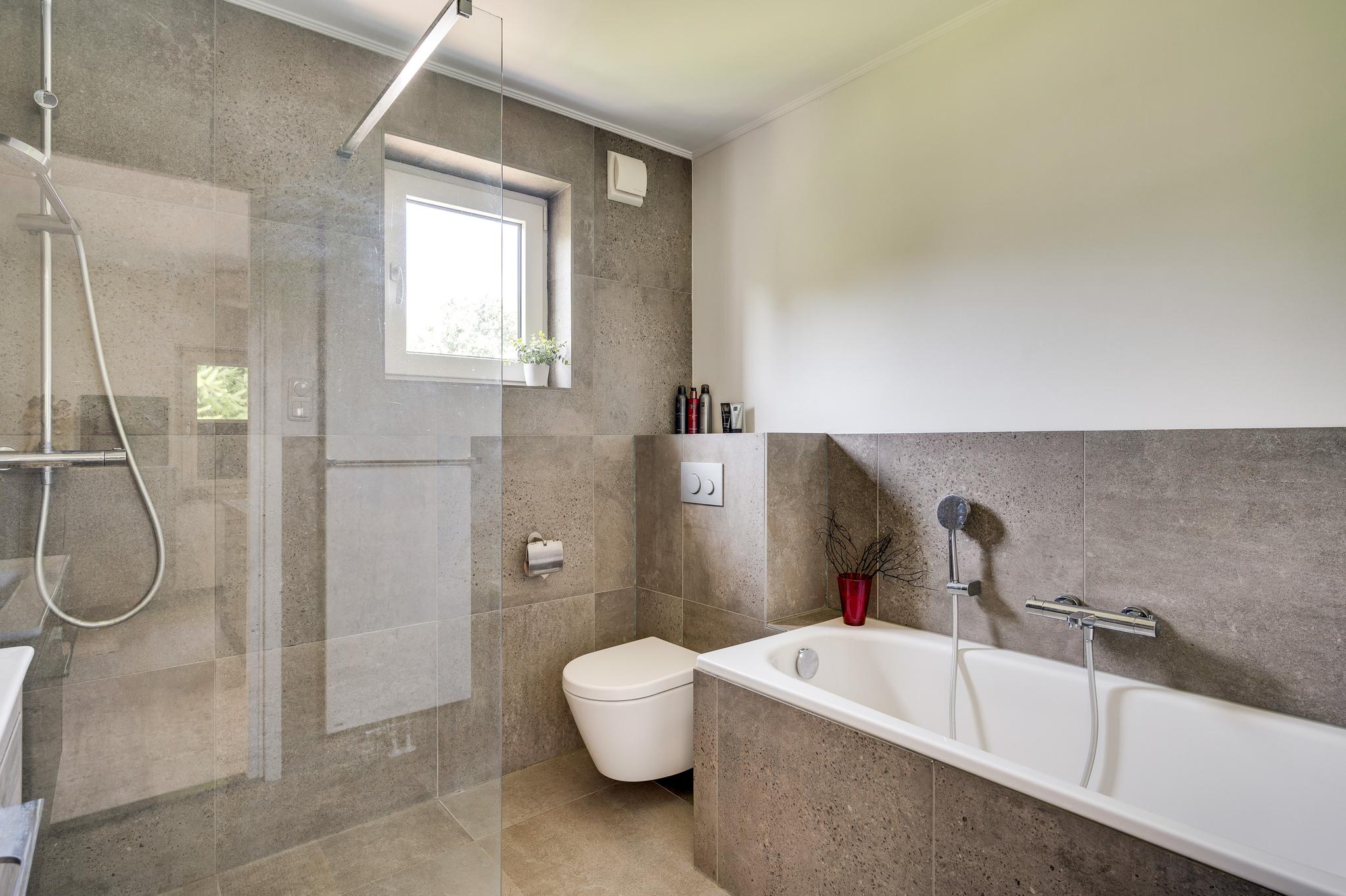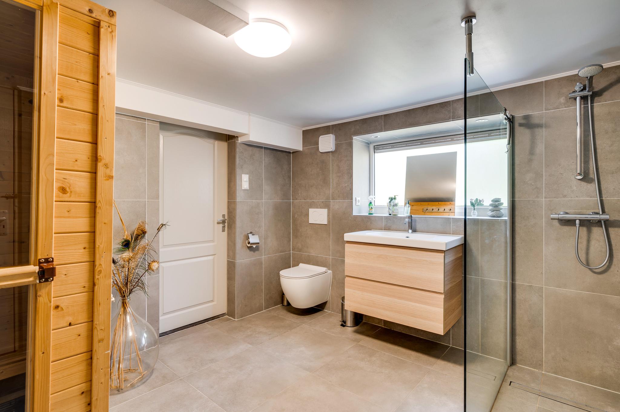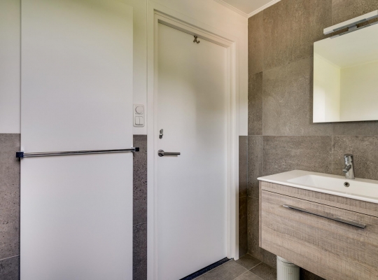 Badkamer II (ca. 2,48 x 2,28) met een ligbad, inloopdouche, toilet, designradiator en wastafelmeubel biedt alle benodigde luxe een comfort. Qua stijl is deze badkamer uitgevoerd in dezelfde stijl als de badkamer in het souterrain.