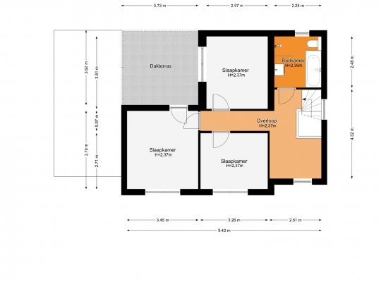 Slaapkamer I (ca. 3,79 x 3,45), in gebruik als master bedroom, heeft een deur naar het dakterras. Slaapkamer II (ca. 2,71 x 3,26), is een 1 persoonsslaapkamer die thans in gebruik is als kleedruimte. Deze kamer bevindt zich aan de voorzijde van deze fraaie woning. Slaapkamer III (ca. 3,51 x 2,97) is ruim genoeg voor een tweepersoons slaapkamer.