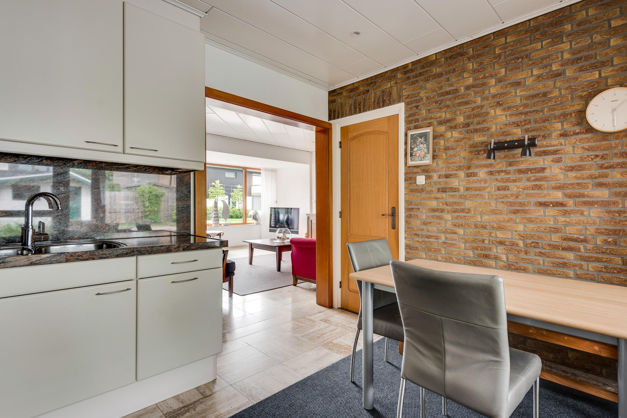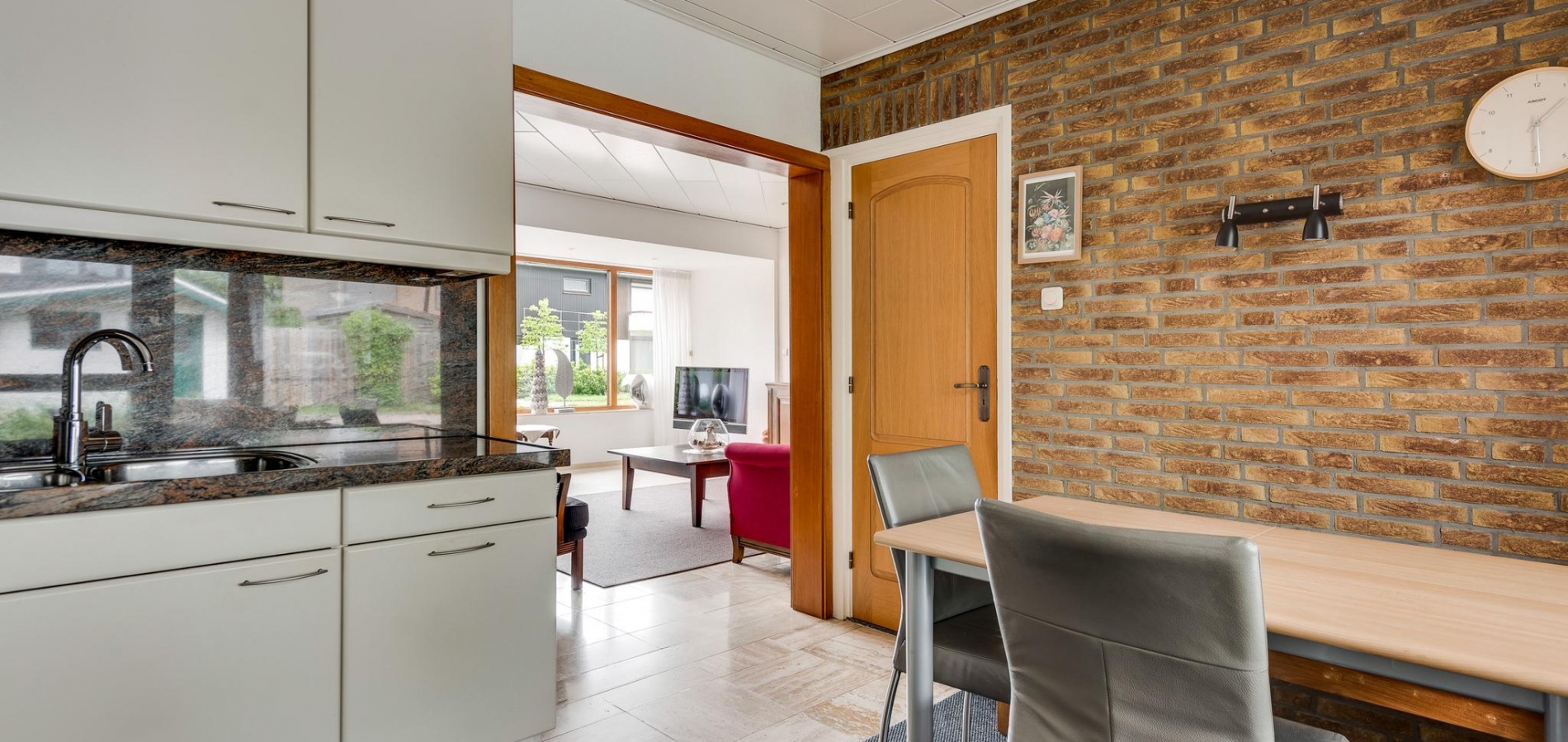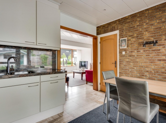 Vanuit de hal loopt u de keuken (ca. 3,51 x 2,93) in, die in verbinding met de uitgebouwde woonkamer (ca. 6,72 x 5,05/3,45) en de eetkamer (ca. 6,43 x 3,18) staat. De keuken biedt ruimte aan een eet-/ontbijttafel en een lichte hoekopstelling met een granieten blad, gaskookplaat, afzuigkap, oven, magnetron, vaatwasser en een koelkast.