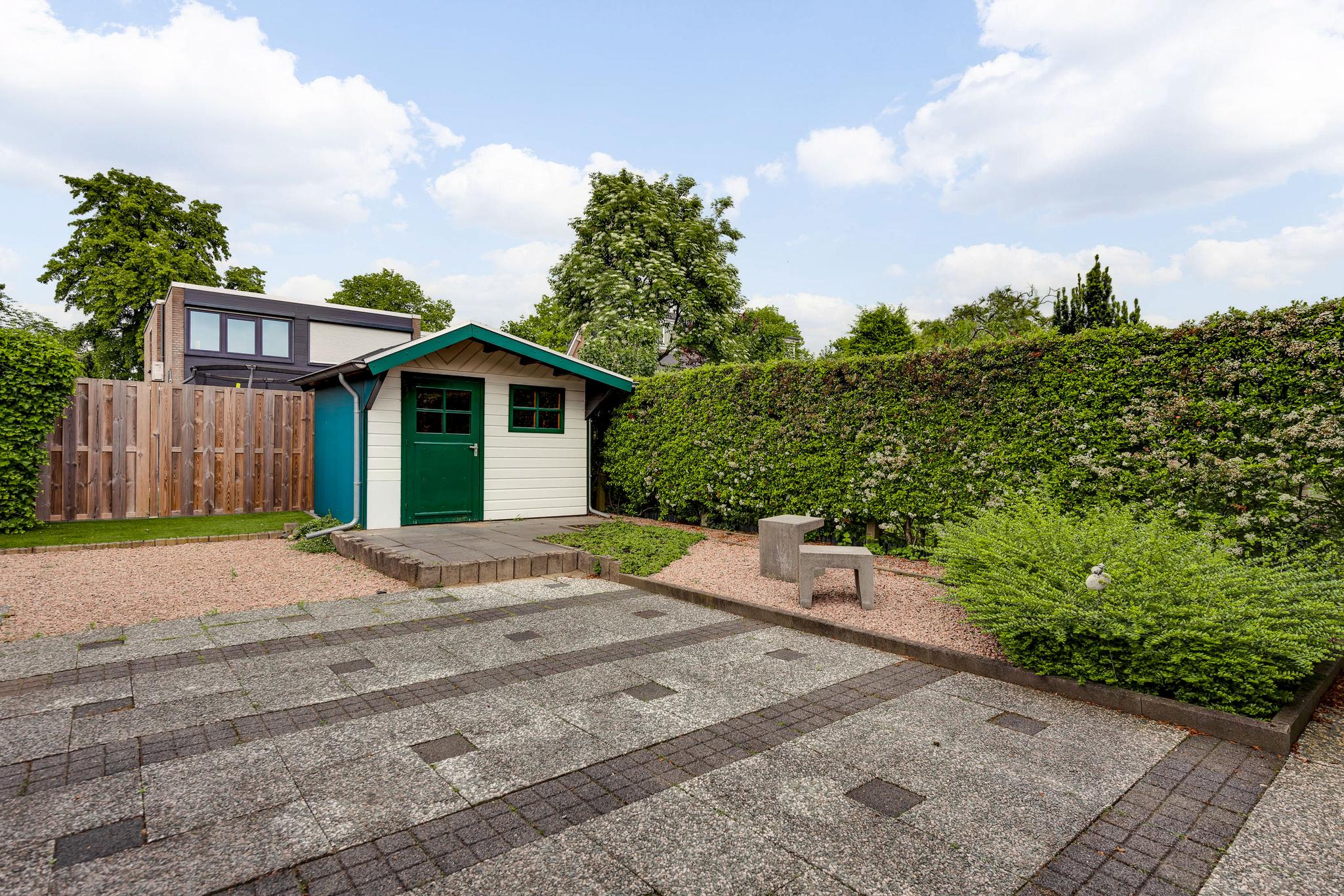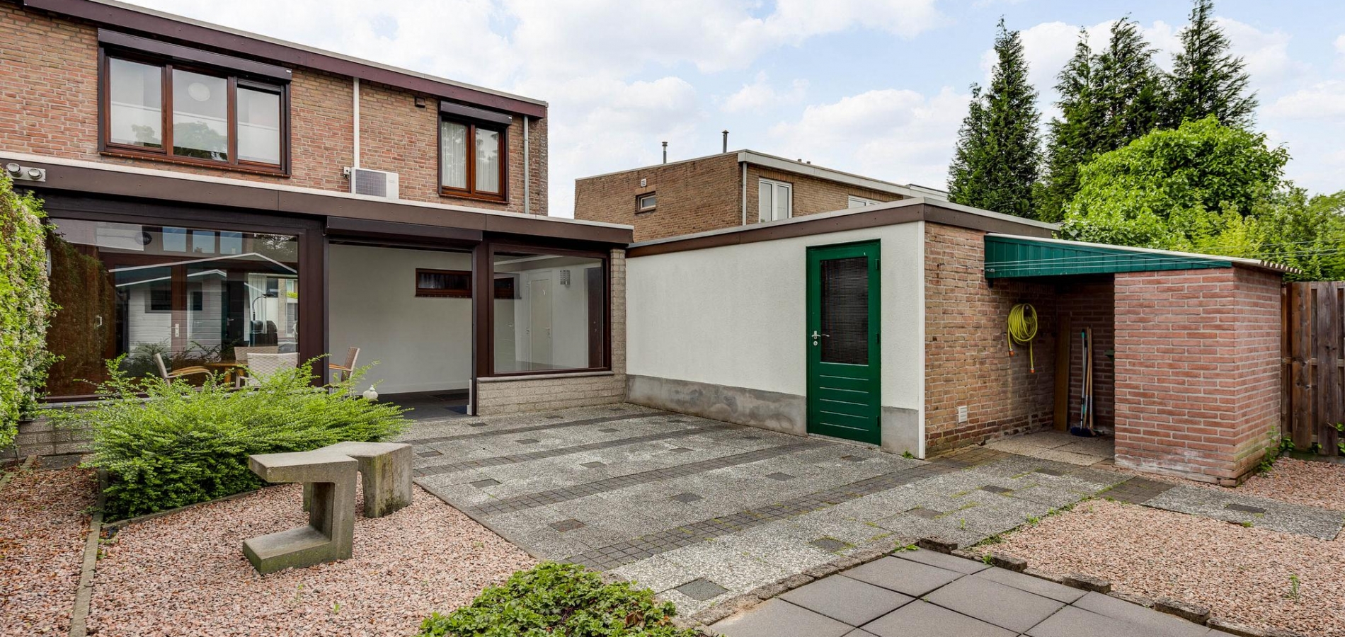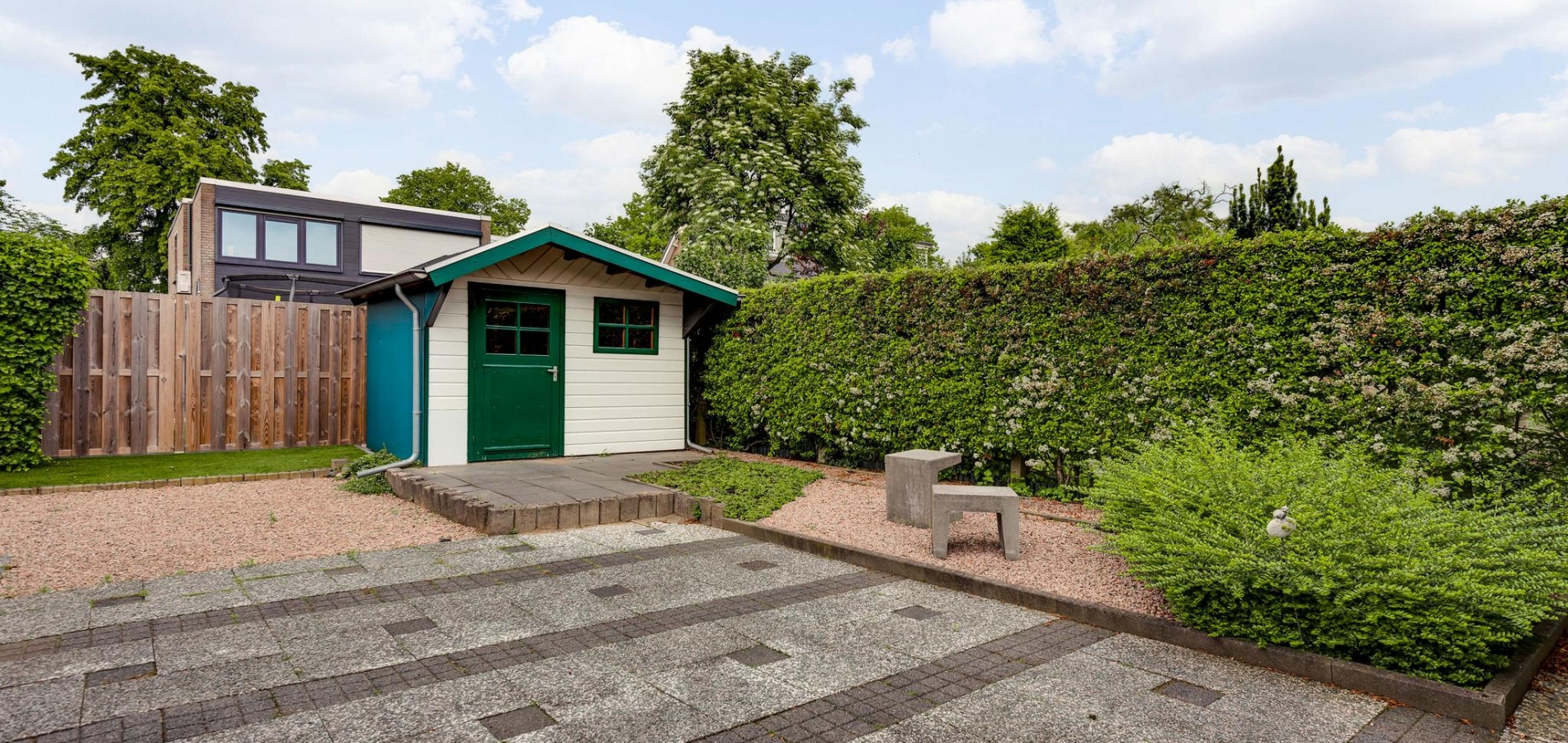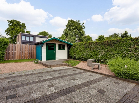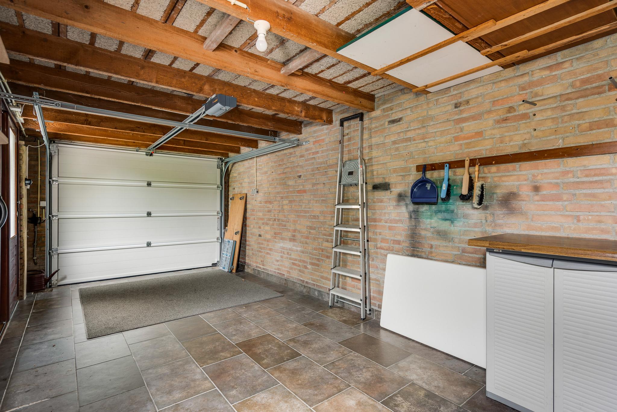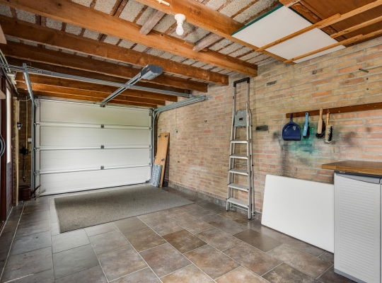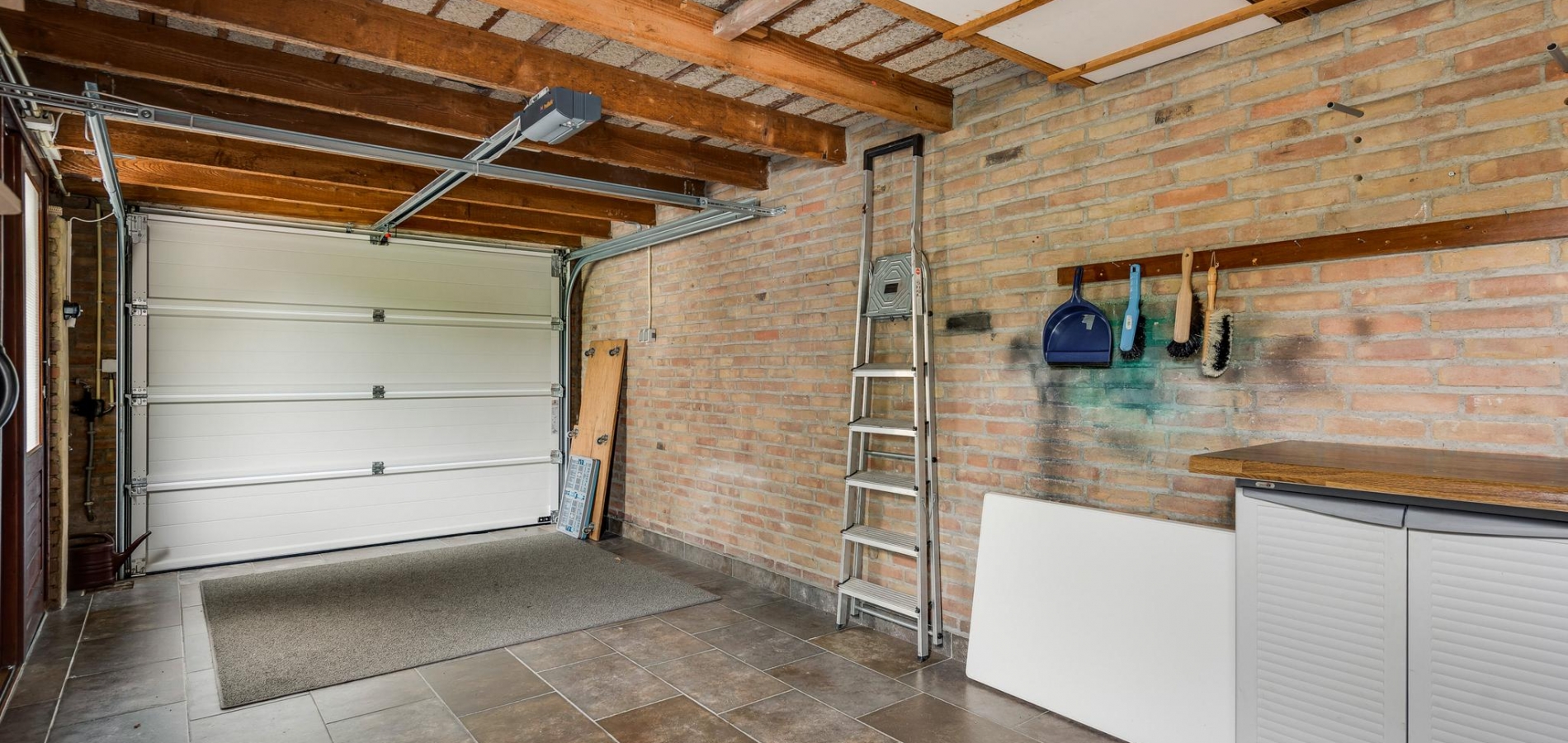 In de hoek van de eetkamer is een deur naar de garage (ca. 6,42 x 2,91) met een tegelvloer, sectionaalpoort en elektra. De garage staat in verbinding met de lange oprit en de onderhoudsvriendelijke achtertuin op het noordoosten. Aan de garage is een overkapping (ca. 1,91 x 1,61) gebouwd en in de hoek van de tuin staat een houten berging (ca. 2,92 x 2,31).