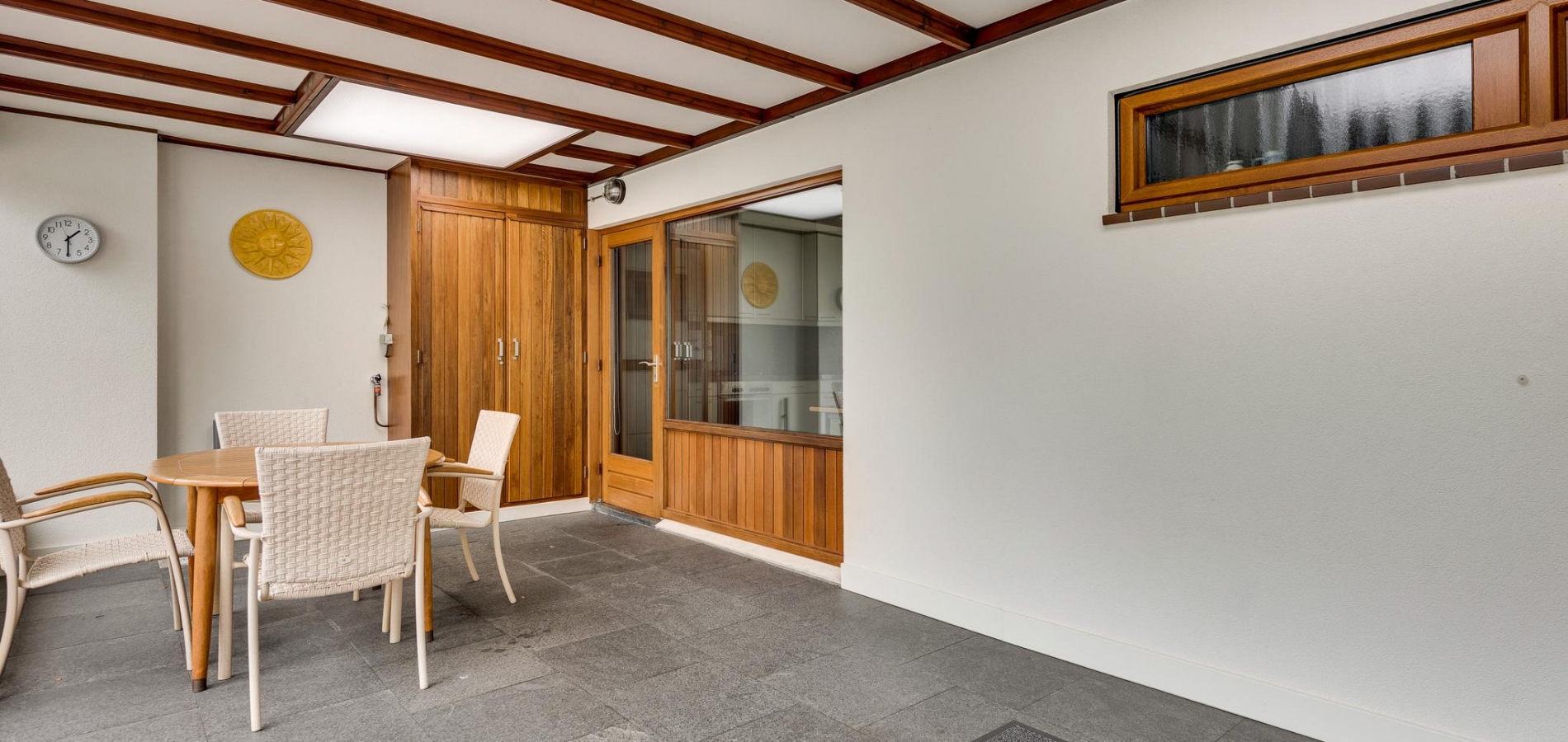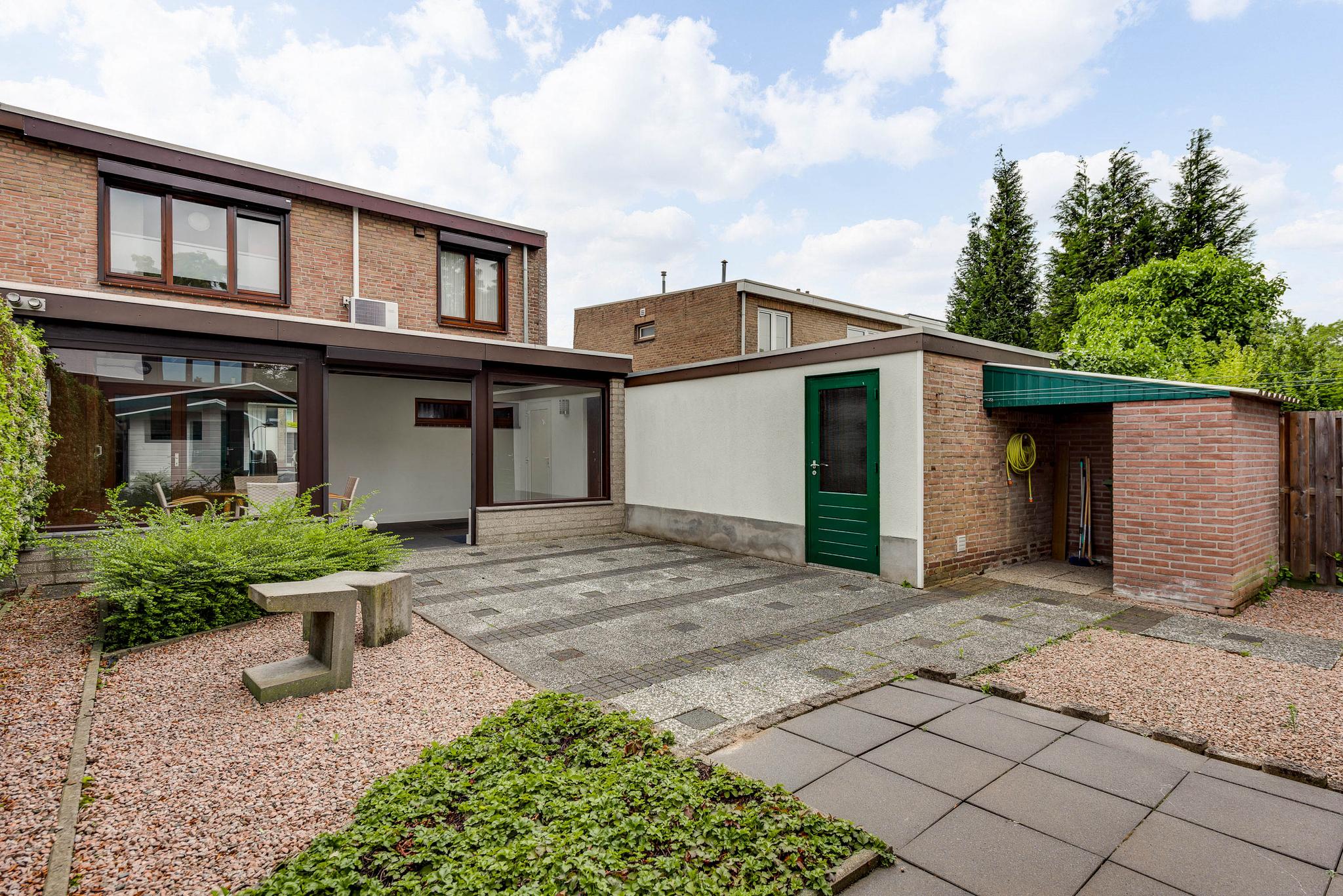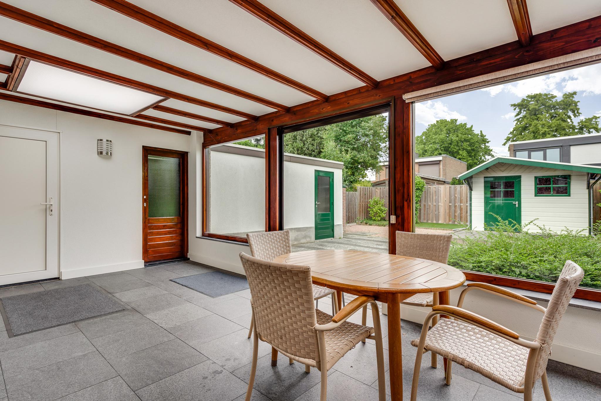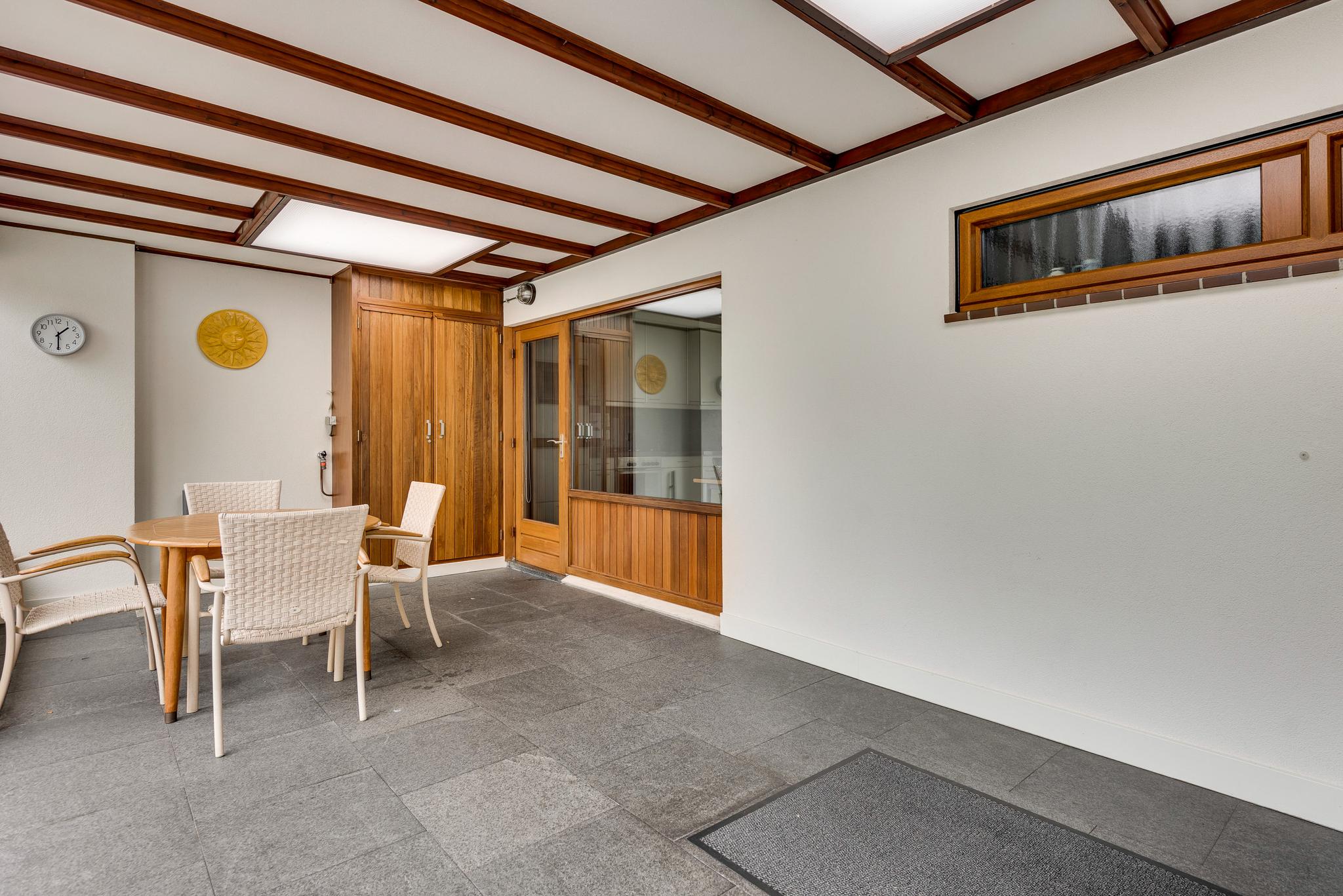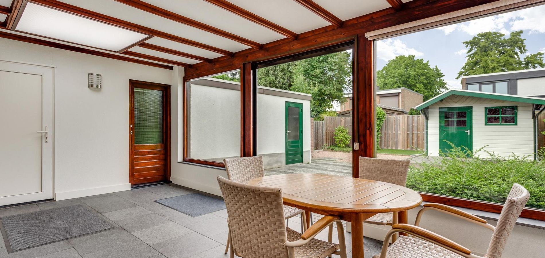 In de hoek van de eetkamer is een deur naar de garage (ca. 6,42 x 2,91) met een tegelvloer, sectionaalpoort en elektra. De garage staat in verbinding met de lange oprit en de onderhoudsvriendelijke achtertuin op het noordoosten. Aan de garage is een overkapping (ca. 1,91 x 1,61) gebouwd en in de hoek van de tuin staat een houten berging (ca. 2,92 x 2,31).