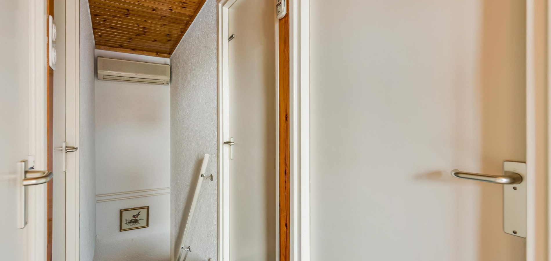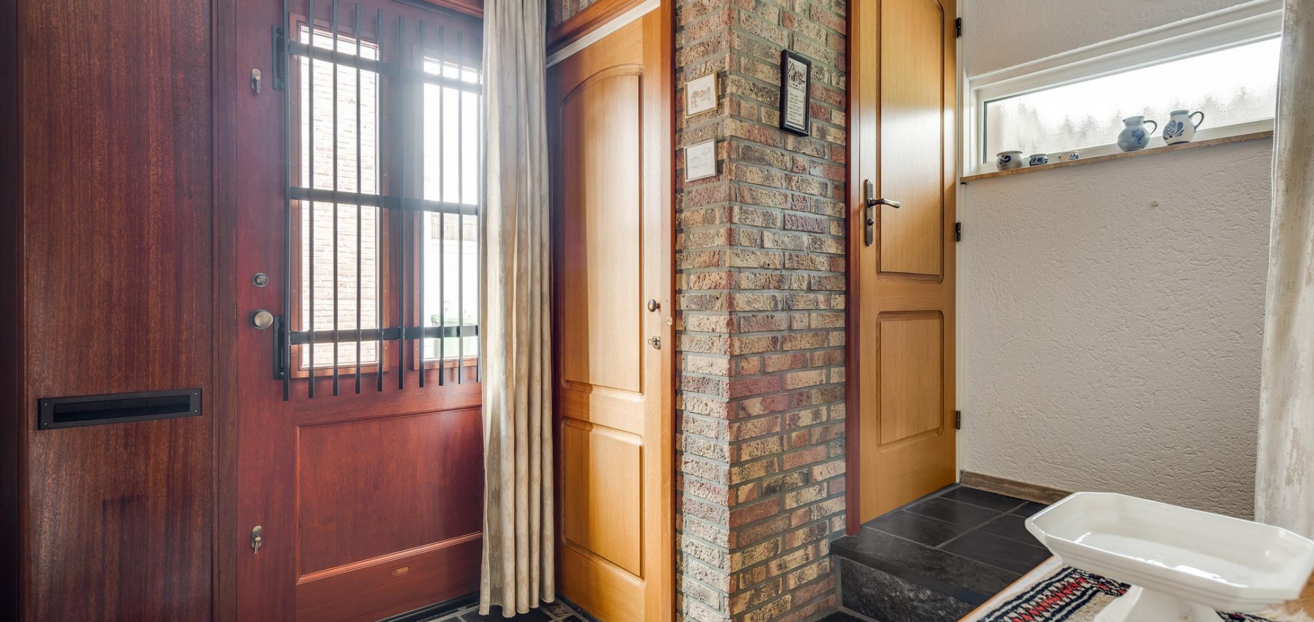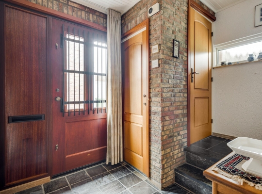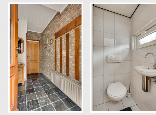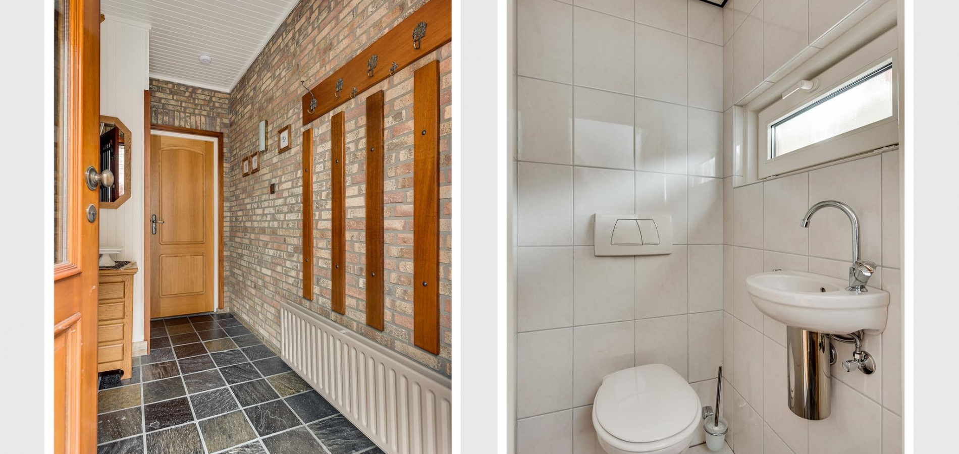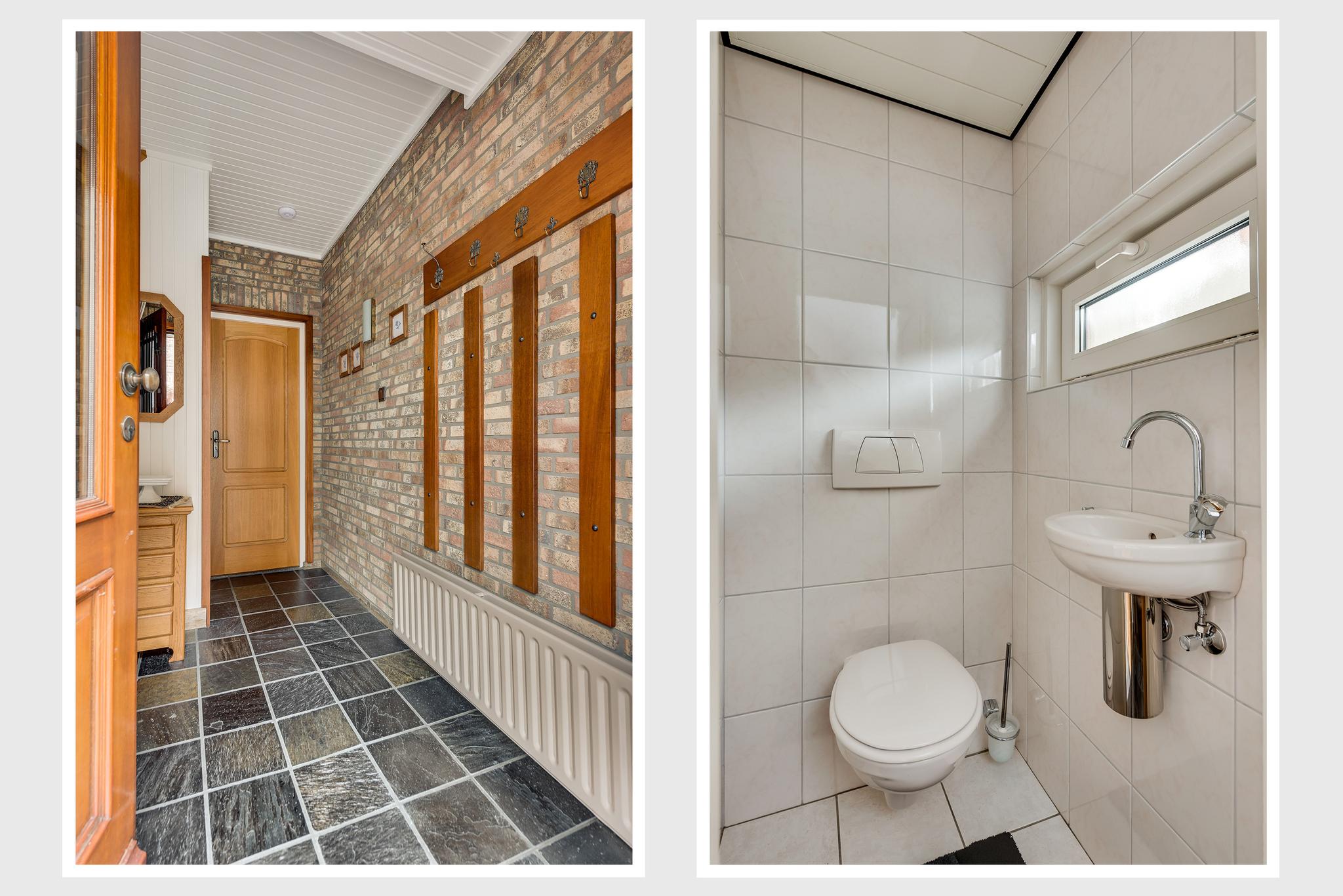 Aan de linkerzijde, bij de oprit, is de entree van deze fors uitgebouwde woning. In de hal met leisteen vloer ziet u de trapopgang, meterkast en de toiletruimte met fonteintje. Achter een van de paneeldeuren is de trap naar de wijn-/provisiekelder (ca. 3,10 x 2,84).