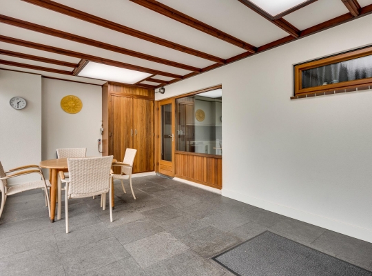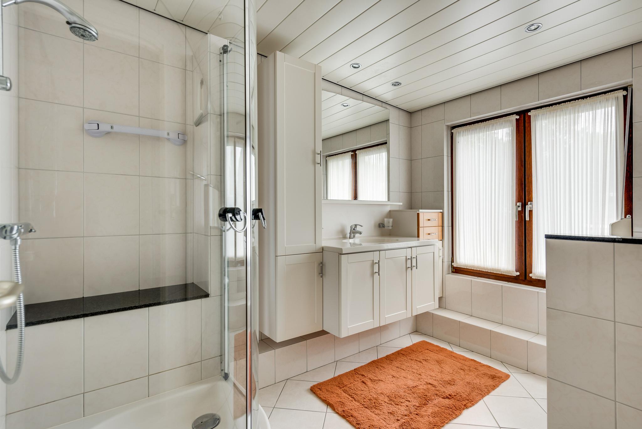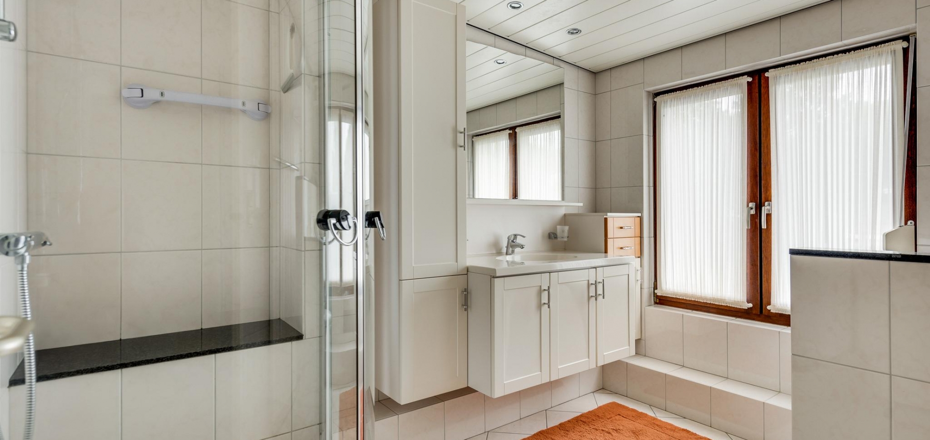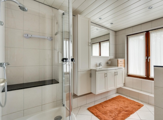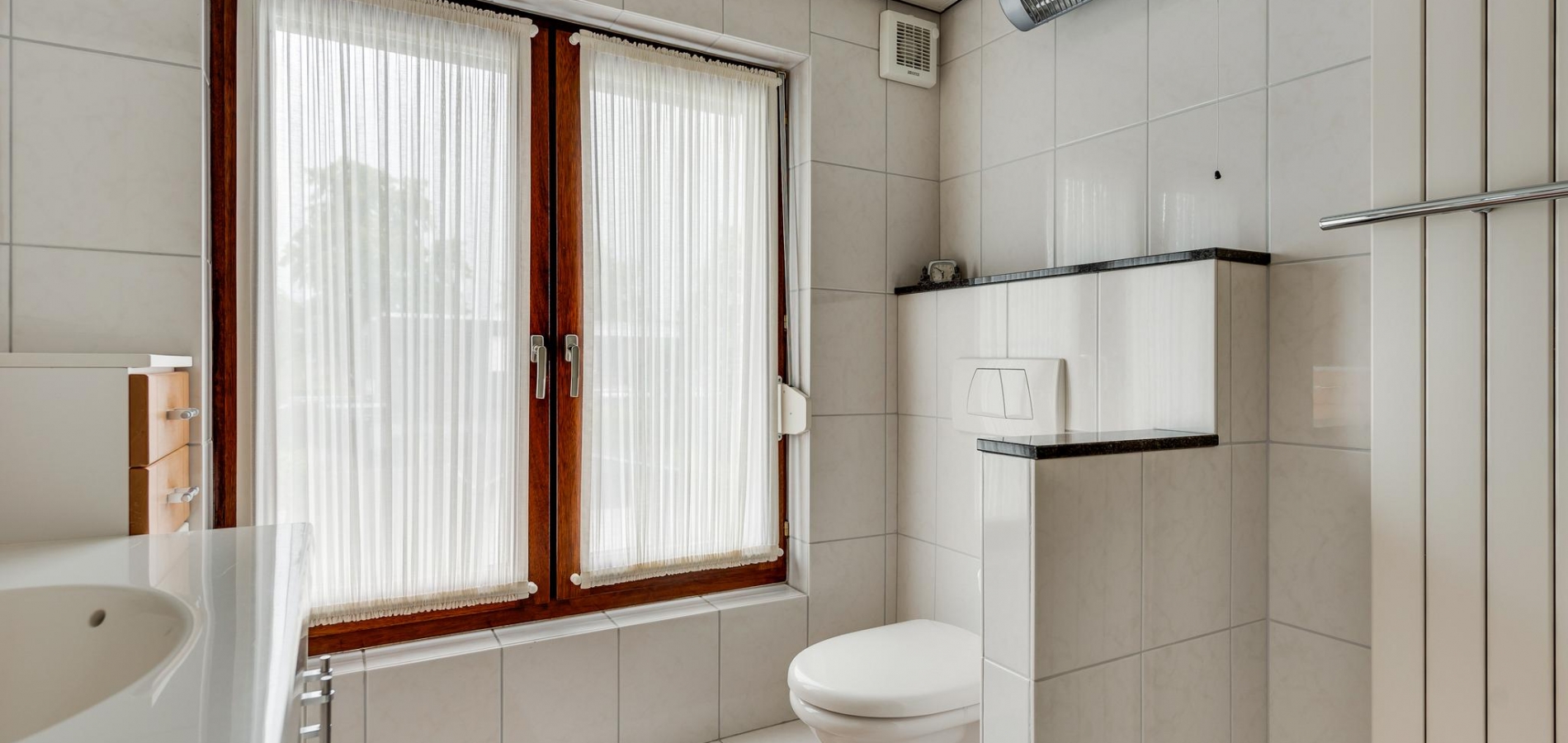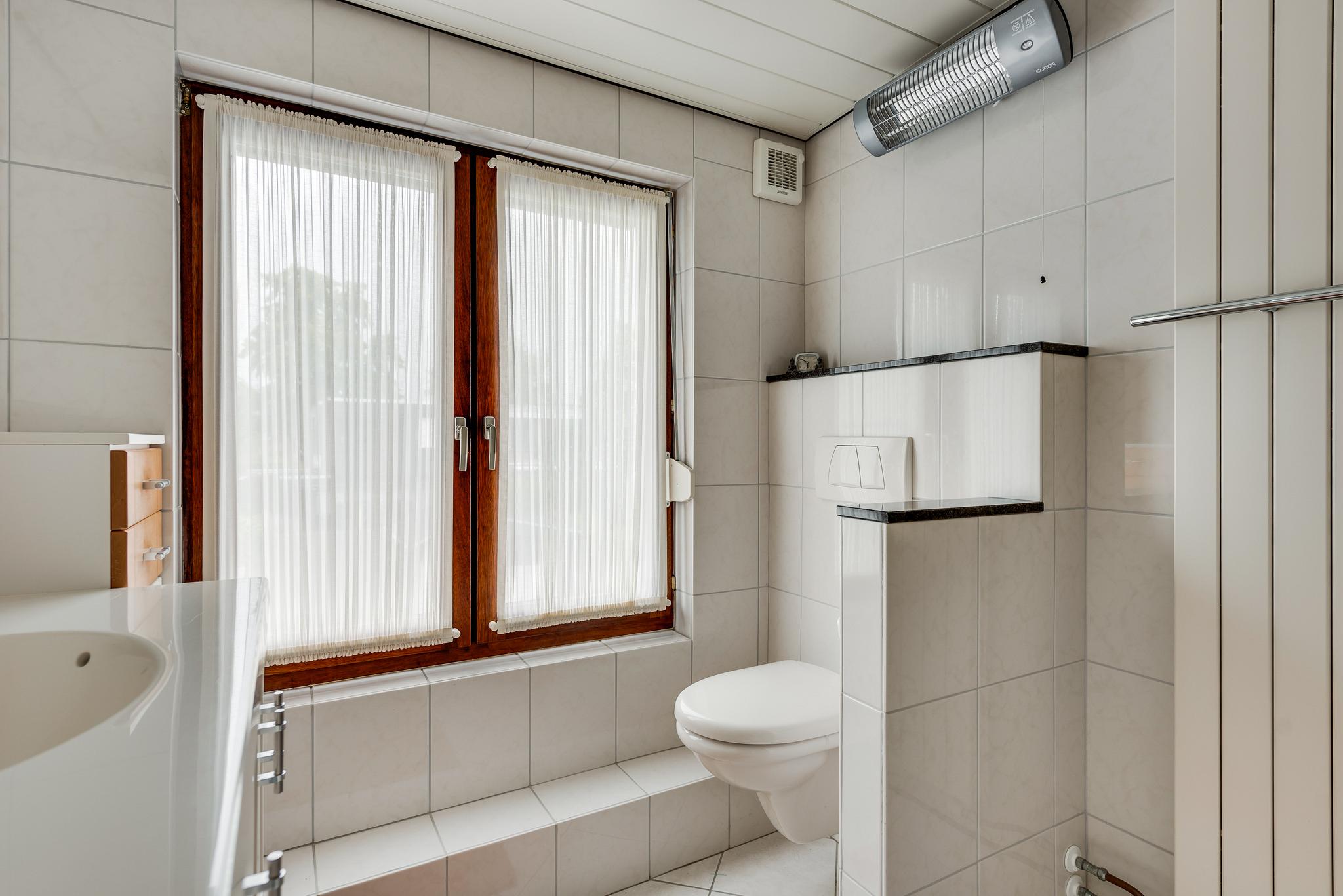 Aan de linkerzijde, bij de oprit, is de entree van deze fors uitgebouwde woning. In de hal met leisteen vloer ziet u de trapopgang, meterkast en de toiletruimte met fonteintje. Achter een van de paneeldeuren is de trap naar de wijn-/provisiekelder (ca. 3,10 x 2,84).