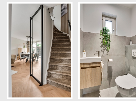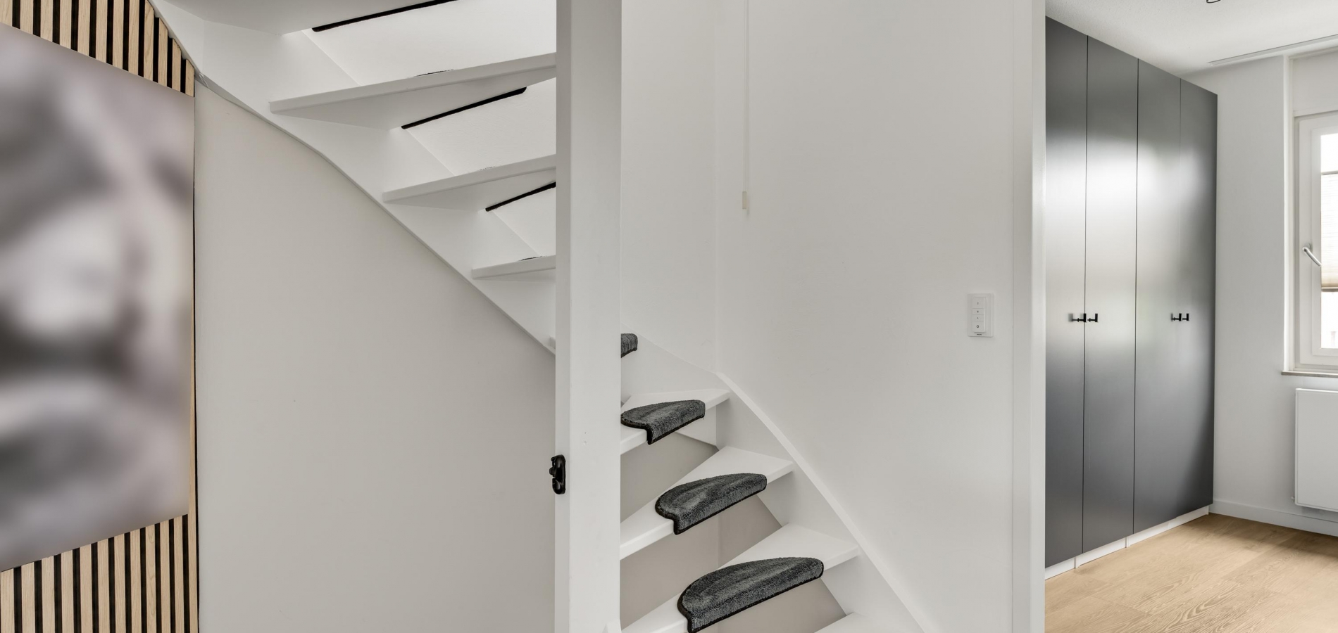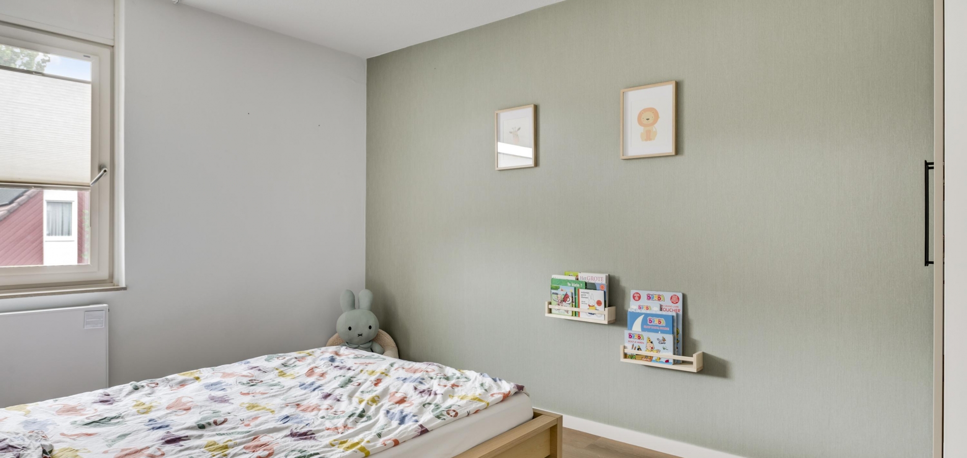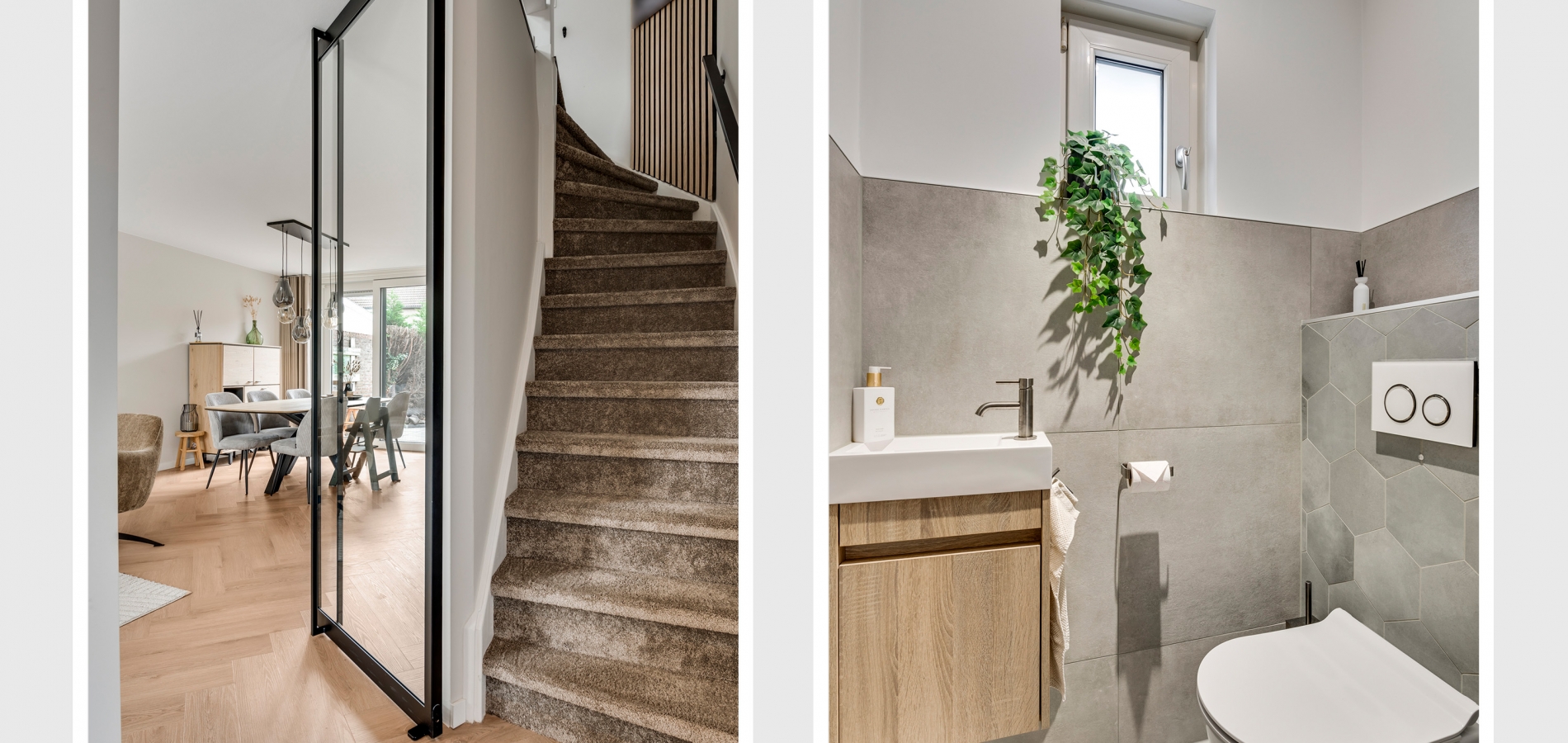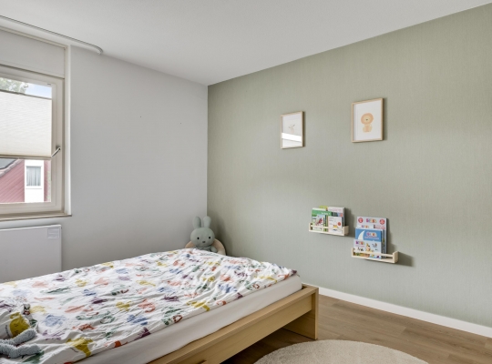 Niet alleen op de begane grond, maar ook op de eerste verdieping is dit huis helemaal af. Op bijna de hele verdieping ligt een houtlook pvc-vloer en de wanden zijn voorzien van behang. Op de overloop, bij de trap, is een trendy lattenwand geplaatst en de zwarte leuning maakt het geheel af.